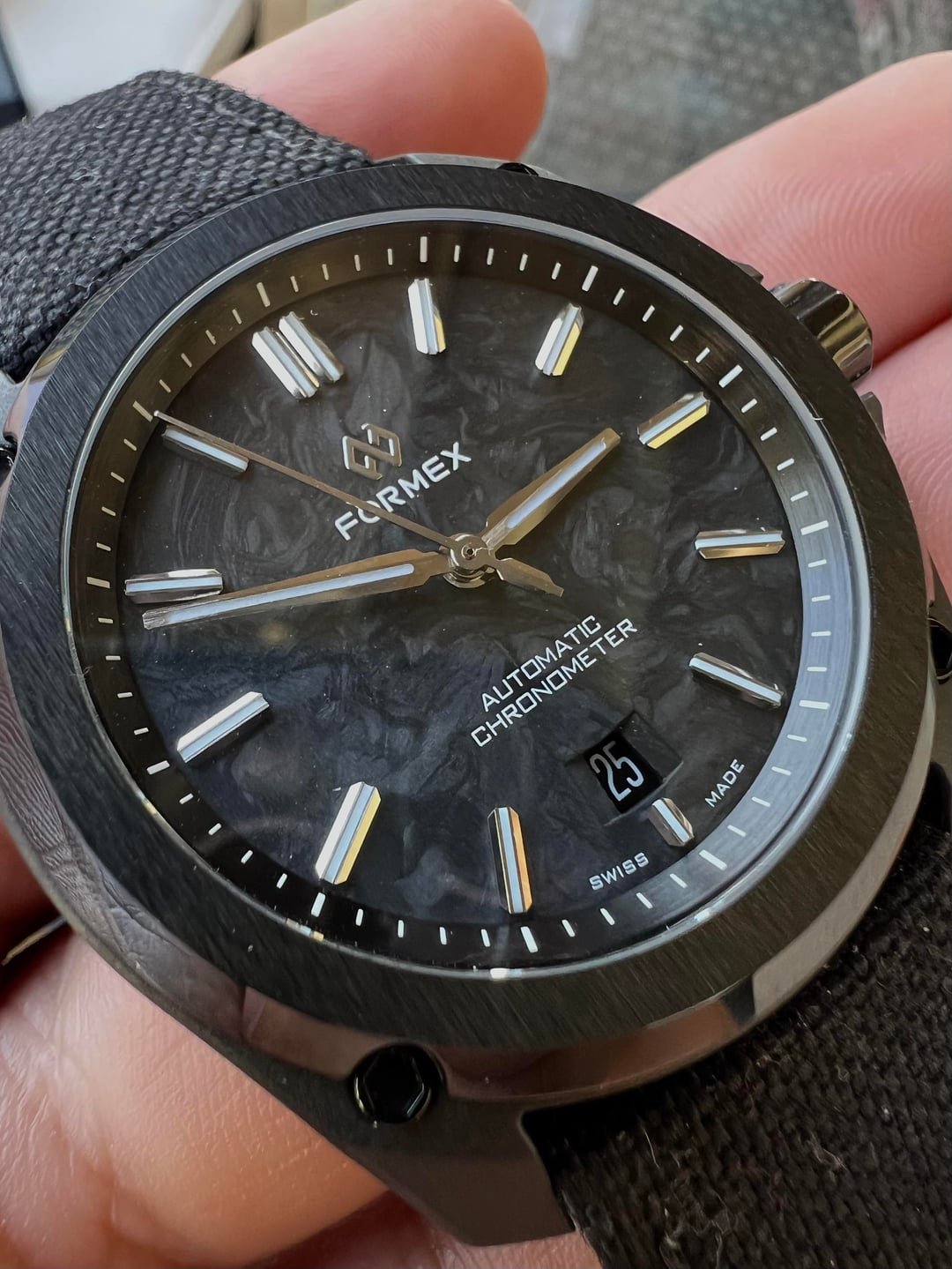 Hello, up for sale is my pre-owned Formex Leggera in 41mm case, best size in my opinion. This thing packs premium tech and comfort into one of the most wearable daily watches out there: forged carbon case, ceramic bezel and crown, COSC-certified Swiss movement, sapphire front and back, and Formex’s patented suspension case system that makes it wear like a dream. The dial work is sharp and detailed, paired with BGW9 lume that glows crisp and clean in the dark. At just 40g on the wrist, it basically disappears, until you catch the light on the forged carbon case, super stealthy and legible too. See album for wrist shot (7” wrist for reference). See below for all specs: 41mm case 46.4mm lug to lug 11mm thick 100m water resistant COSC Sellita SW200-1 automatic 41h power reserve AR-coated sapphire crystal front & back Patented micro-adjust clasp 40g total weight Watch is in excellent condition with no major marks. Case and ceramic bezel are clean, straps show light wear. Keeps great time at about –7 sod with excellent AMP (see album for time graph data). Comes with full kit dated 2022, plus an extra OEM rubber strap. Asking $1450 shipped, feel free to reach out with any questions or requests, thanks for looking! Time graph data: https://imgur.com/a/ZxSIFKn
