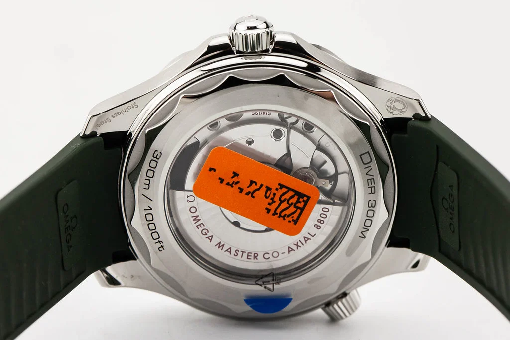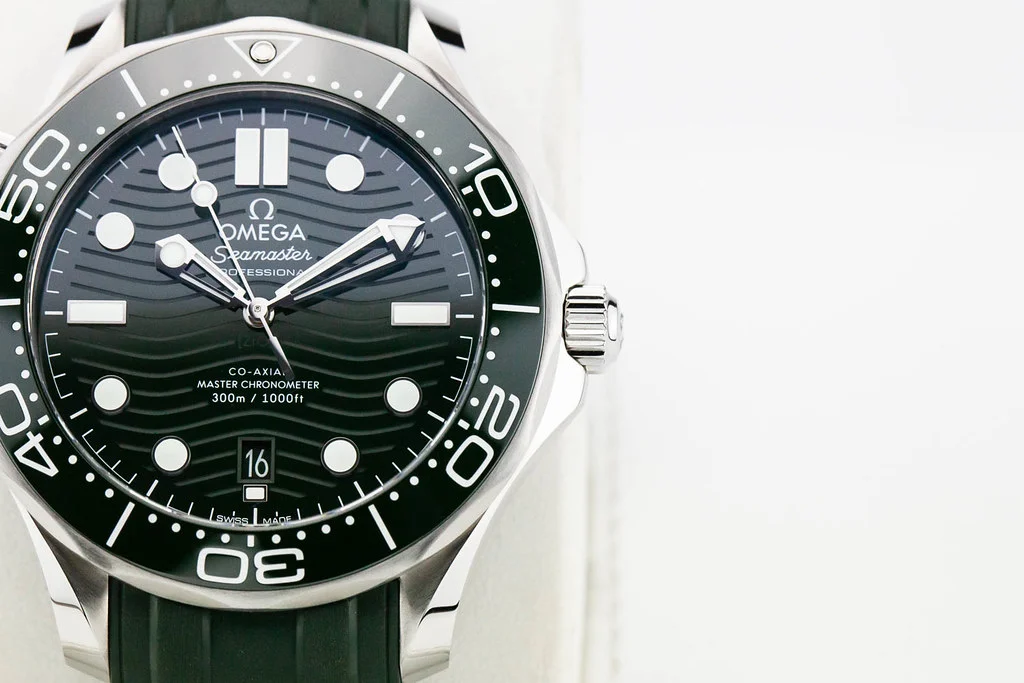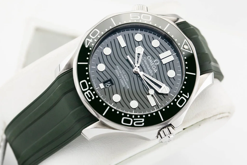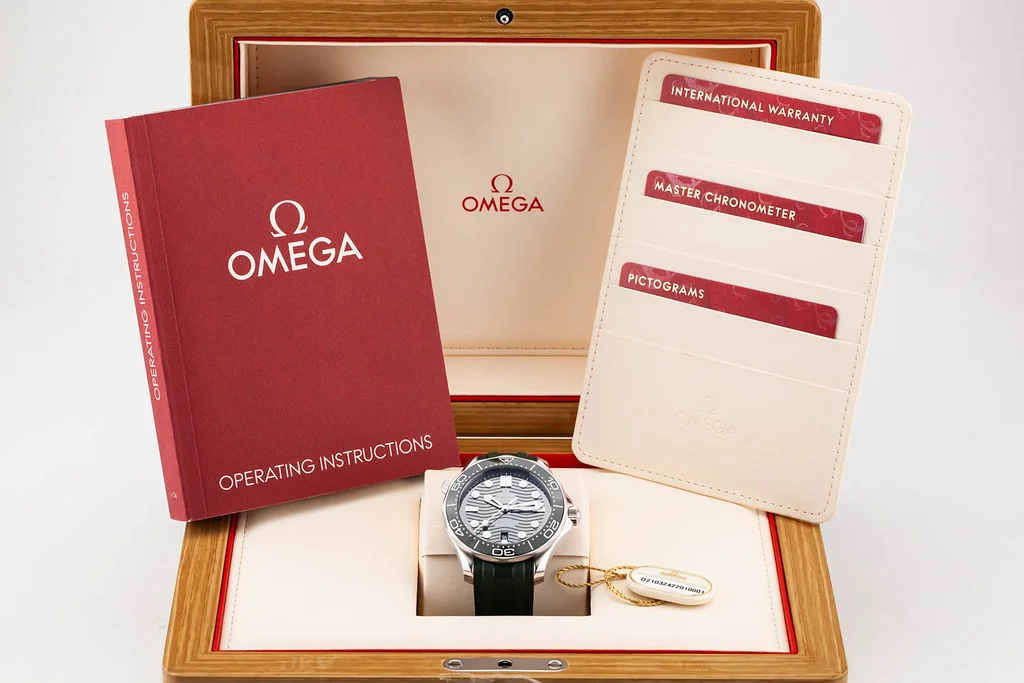 Up for sale is a brand new Omega Seamaster 300 Green Wave Dial on Rubber Strap, reference # 210.32.42.20.10.001. It comes complete with all boxes, papers, booklets, hang tag and Omega Warranty Card dated July 2025.