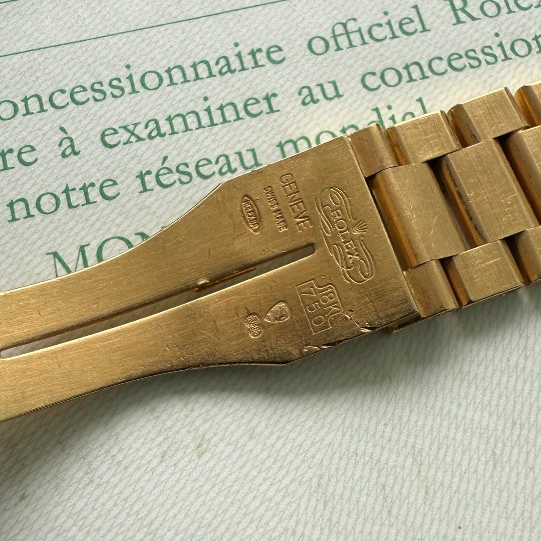 We are proud to offer an exceptional example of a 1978 Rolex Oysterquartz Day-Date President, reference 19018, in solid 18k yellow gold. This timepiece is a fascinating chapter in Rolex history, born from the brand’s innovative response to the 1970s Quartz Crisis. Instead of outsourcing, Rolex developed its own high-precision, chronometer-certified quartz movement and housed it in a distinctively angular case with an integrated solid-gold President bracelet. This particular watch is a collector's dream, remaining in unpolished, razor-sharp condition with crisp factory lines. It features the sought-after solid gold fluted bezel and a beautiful silver dial that provides a touch of elegant contrast. Finding one in this state is rare, but locating it with its original papers, correctly dated to 1978, is truly extraordinary. Freshly serviced by our watchmaker and keeping excellent time, this watch offers a bold and significant presence on the wrist. Your chance to acquire a stunning part of Rolex heritage. The watch looks incredible and is ready to be worn! The serial on this watch begins with 5.6xxxxx dating this watch to late 1978 which correctly matches the papers. The Details: **Case:** 36 mm 18 karat solid yellow gold case is in stunning condition including nice sharp and thick lugs which remains unpolished **Bezel:** 18 karat fluted bezel which has never been polished **Dial/Hands:** Original Rolex silver dial in stunning condition, it truly is spectacular in hand. Hands are original Rolex in attractive condition **Caseback:** Nice original 18 karat yellow gold back in sharp condition **Movement:** Rolex quartz movement which has been serviced by our watchmaker and is currently running well **Bracelet/Strap:** Factory solid 18 karat yellow gold president bracelet which remains unpolished and is in very very tight condition. It has nearly no stretch given its age. A truly well taken care of example as many of these bracelets have weak/over polished logos at the clasp whereas this one is bold and pronounced. Bracelet will fit a 7.8 inch wrist **Crystal:** Original attractive condition with no distractions **Accessories:** This watch comes with box, warranty papers dated 1978, booklet, border receipts, polishing cloth, leather holder. A very complete package, it was a very well taken care of watch which is ready to be enjoyed by its new owner :) Available for sale US$17700