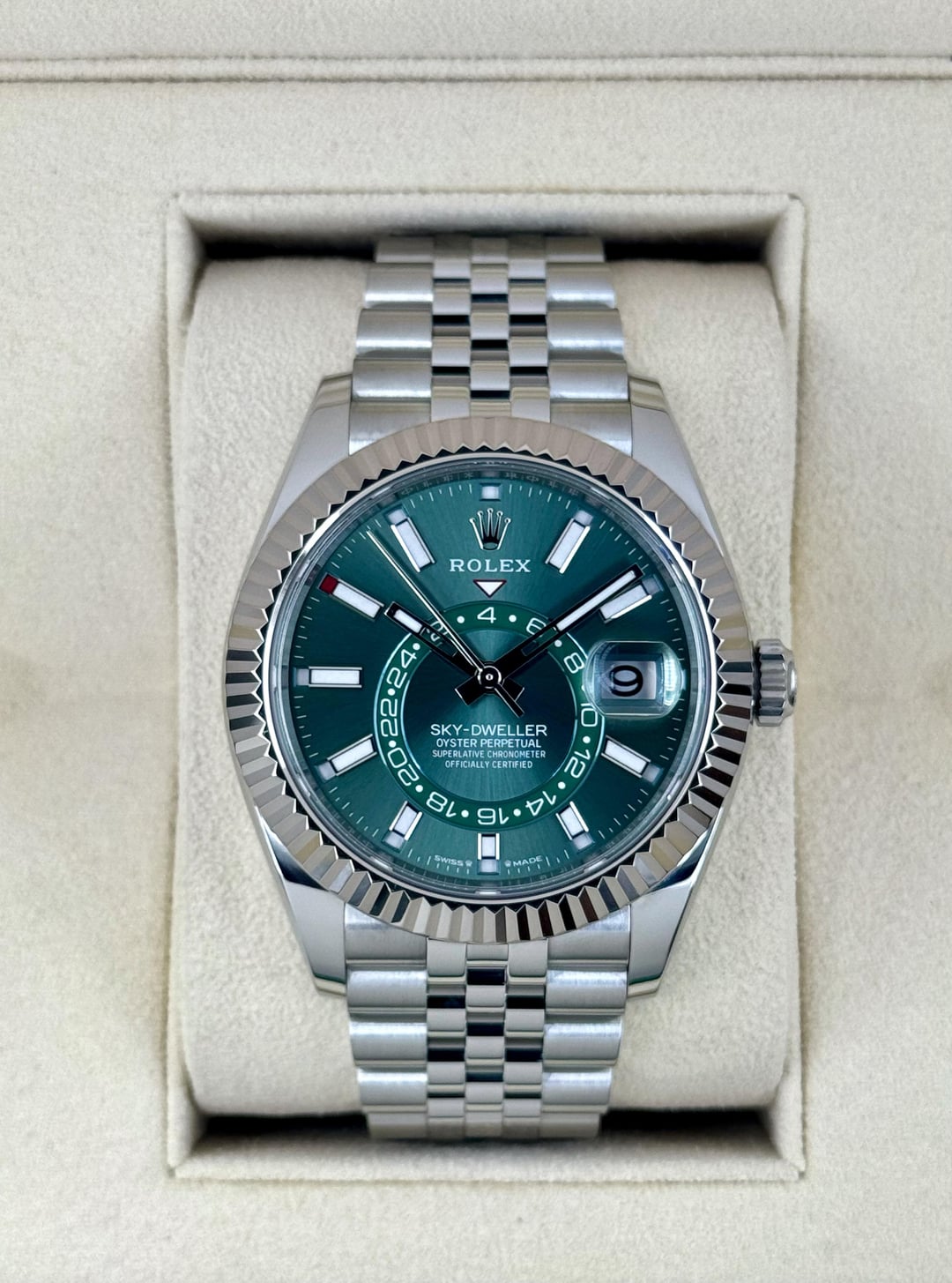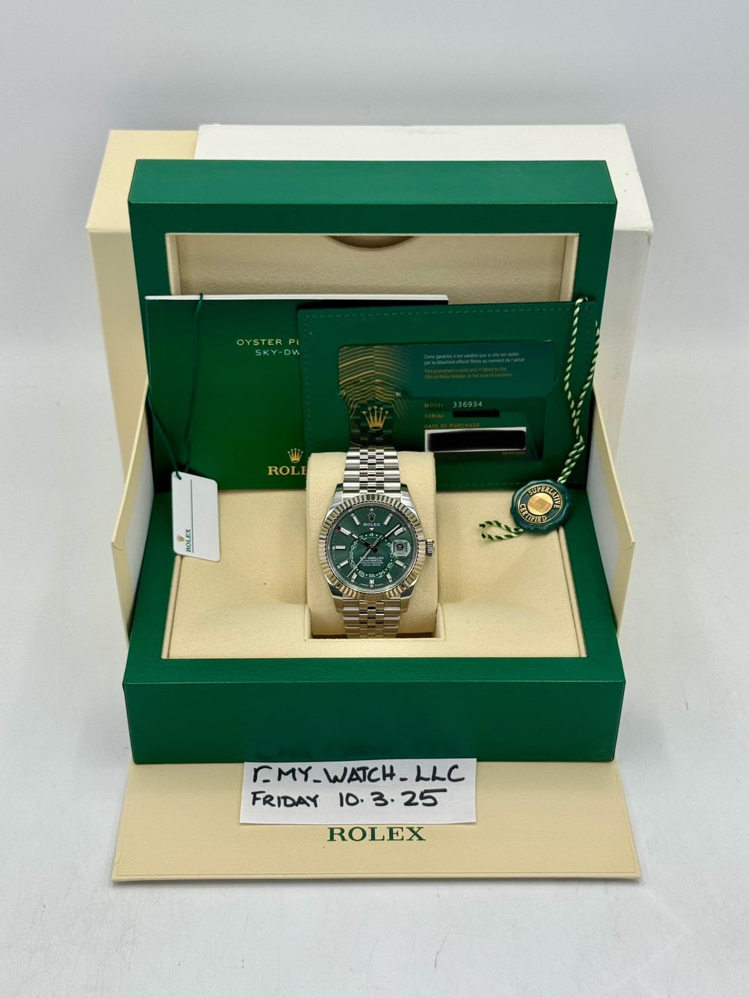 **🔵2025 Rolex Sky-Dweller 42mm 336934 Oystersteel and 18kt White Gold Fluted Bezel with Jubilee Bracelet and Green Dial** **🔵TRADE or SELL us your luxury watch, all brands considered. Message me details.** **Includes the following:** **✔️Original Rolex Double boxed** **✔️Box and Papers - Yes** **✔️Warranty card dated March 2025** **✔️5 year manufacturer warranty** **✔️Manual and Warranty booklets** **✔️Green and White Hang Tags included** **✔️Material: Stainless Steel** **✔️Size: 7.75inch wrist (Full Links)** **✔️Watch is in excellent overall condition. Please see photos for details.** **✔️**[**Trades**](https://mywatchllc.com/pages/sell-rolex-watch) **welcome** **Location: Oak Park, MI** Business Name: **My Watch LLC** LOCATION: Oak Park, Michigan ✔️[MyWatchLLC.com](http://mywatchllc.com) for current inventory ✔️Google Business Listing [https://g.co/kgs/Cmd6FPW](https://g.co/kgs/Cmd6FPW) ✔️Business Hours M-F 9-6 ✔️Facetime/Video chat/calls welcome to view the watch interested. ✔️Contact: 248-422-0909 via text or call for quickest response. 🟢TERMS: Visit [MyWatchLLC.Com](http://mywatchllc.com) for payments accepted 🟢REFERENCES/REVIEWS: We are well reviewed on all platforms from google, trust pilot, rolexforums, additionally we have 300+ reference in multiple FaceBook watch groups, reference checks welcome. 🟢SHIPPING: If you are not local, we offer Fully Insured FedEx overnight shipping in the USA for a fee. International shipping available.