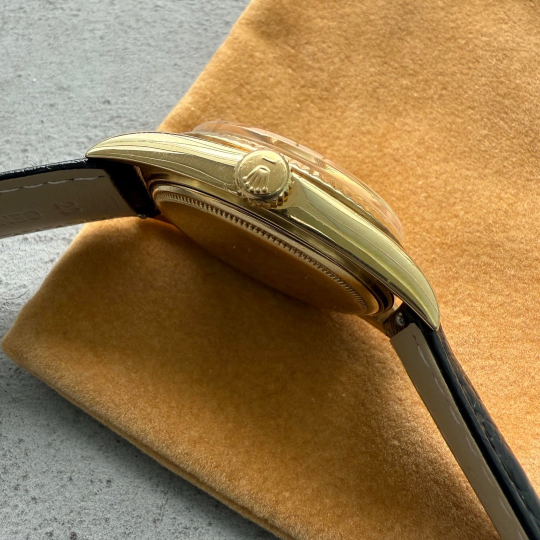 This 1970s Rolex Day-Date President, reference 1803, is a striking representation of mid-20th-century Rolex design and innovation. This watch embodies the understated luxury and timeless appeal that have made the Day-Date line a symbol of success and distinction for generations. Known as the “President” watch, the Day-Date has graced the wrists of global leaders and visionaries, cementing its place as an icon of prestige and refinement. This 1960 model not only offers a glimpse into the golden age of watchmaking but also stands as a statement of impeccable taste and discernment. Owning this Rolex is more than possessing a timepiece, it’s owning a piece of history. **The Details:** **Case:** 36mm solid 18 karat solid yellow gold case in attractive condition. It shows honest signs of wear. Please note the lugs have a nugget like finish which is not original to the watch and would have been done post purchase. The **Bezel:** 18 karat gold fluted bezel which in attractive vintage condition **Dial/Hands:** Original Rolex factory pie pan dial in attractive condition, the dial is strong and vibrant dial with a lot of life in hand - far nicer than the photos! Hands are original Rolex and in attractive condition **Caseback:** Nice original 18 karat yellow gold back in attractive condition **Movement:** Rolex automatic movement which has been serviced by our watchmaker and is running +6 seconds per day **Bracelet/Strap:** Black leather band showing light signs of wear **Crystal:** Original acrylic in with a few light marks as expected for a vintage time peice **Accessories:** This watch comes watch only, it does not come with box or papers. Available for sale US$7990