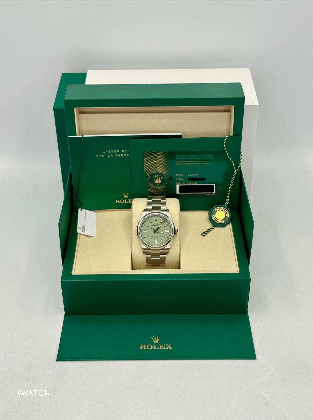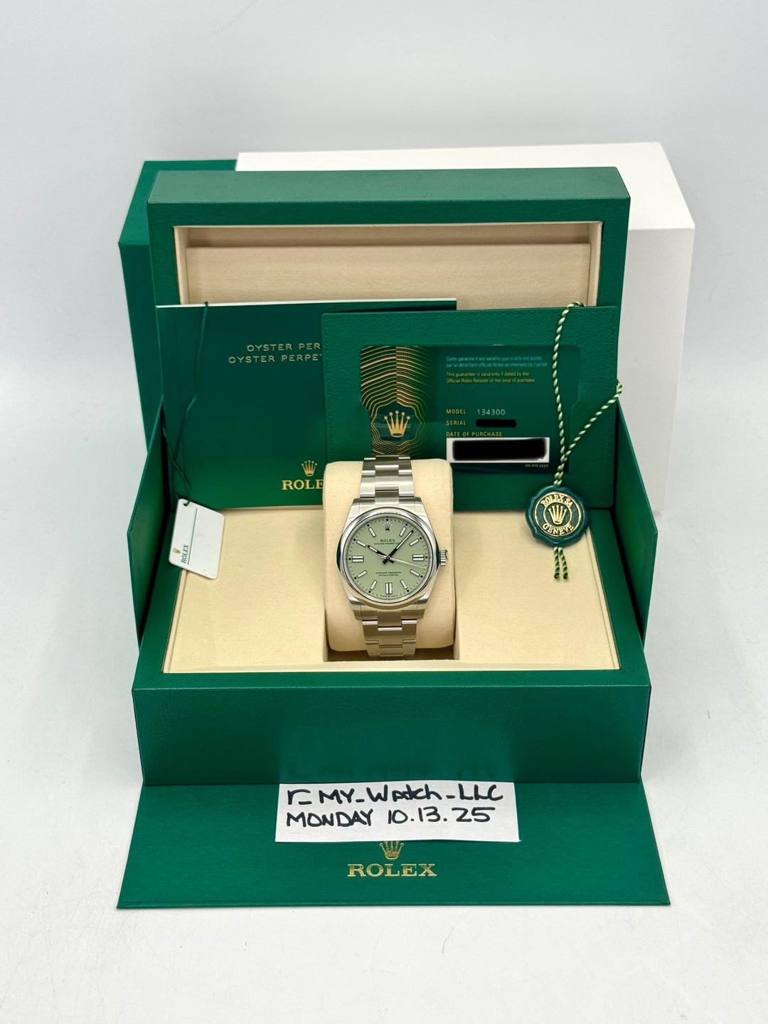 **🔵NEW 2025 Rolex Oyster Perpetual 41mm 134300 Stainless Steel Pistachio Dial Oyster Bracelet** **🔵TRADE or SELL us your luxury watch, all brands considered. Message me details.** **Includes the following:** **✔️BRAND NEW 2025 UPDATED ROLEX BOX (DOUBLE BOXED)** **✔️Box and Papers - Yes** **✔️Warranty card dated 2025** **✔️5 year manufacturer warranty** **✔️Manual and Warranty booklets** **✔️Green and White Hang Tags included** **✔️Size: 7.75inch wrist (Full Links)** **✔️Material: Oystersteel** **✔️Watch is BRAND NEW/UNWORN** **✔️**[**Trades**](https://mywatchllc.com/pages/sell-rolex-watch) **welcome** **Location: Oak Park, MI** Business Name: **My Watch LLC** LOCATION: Oak Park, Michigan ✔️[MyWatchLLC.com](http://mywatchllc.com) for current inventory ✔️Google Business Listing [https://g.co/kgs/Cmd6FPW](https://g.co/kgs/Cmd6FPW) ✔️Business Hours M-F 9-6 ✔️Facetime/Video chat/calls welcome to view the watch interested. ✔️Contact: 248-422-0909 via text or call for quickest response. 🟢TERMS: Visit [MyWatchLLC.Com](http://mywatchllc.com) for payments accepted 🟢REFERENCES/REVIEWS: We are well reviewed on all platforms from google, trust pilot, rolexforums, additionally we have 300+ reference in multiple FaceBook watch groups, reference checks welcome. 🟢SHIPPING: If you are not local, we offer Fully Insured FedEx overnight shipping in the USA for a fee. International shipping available.