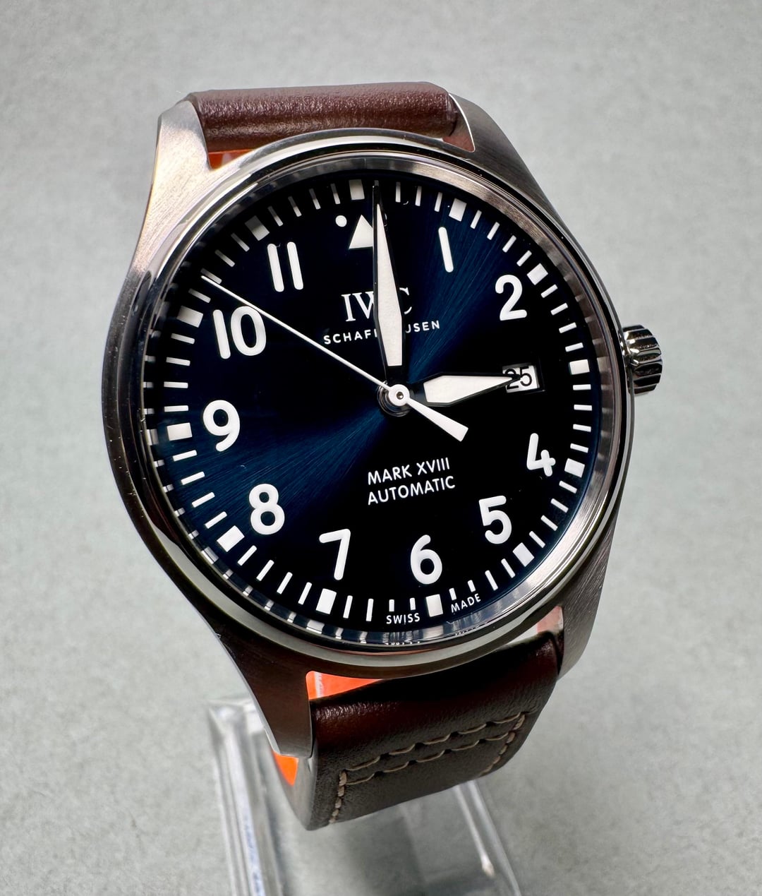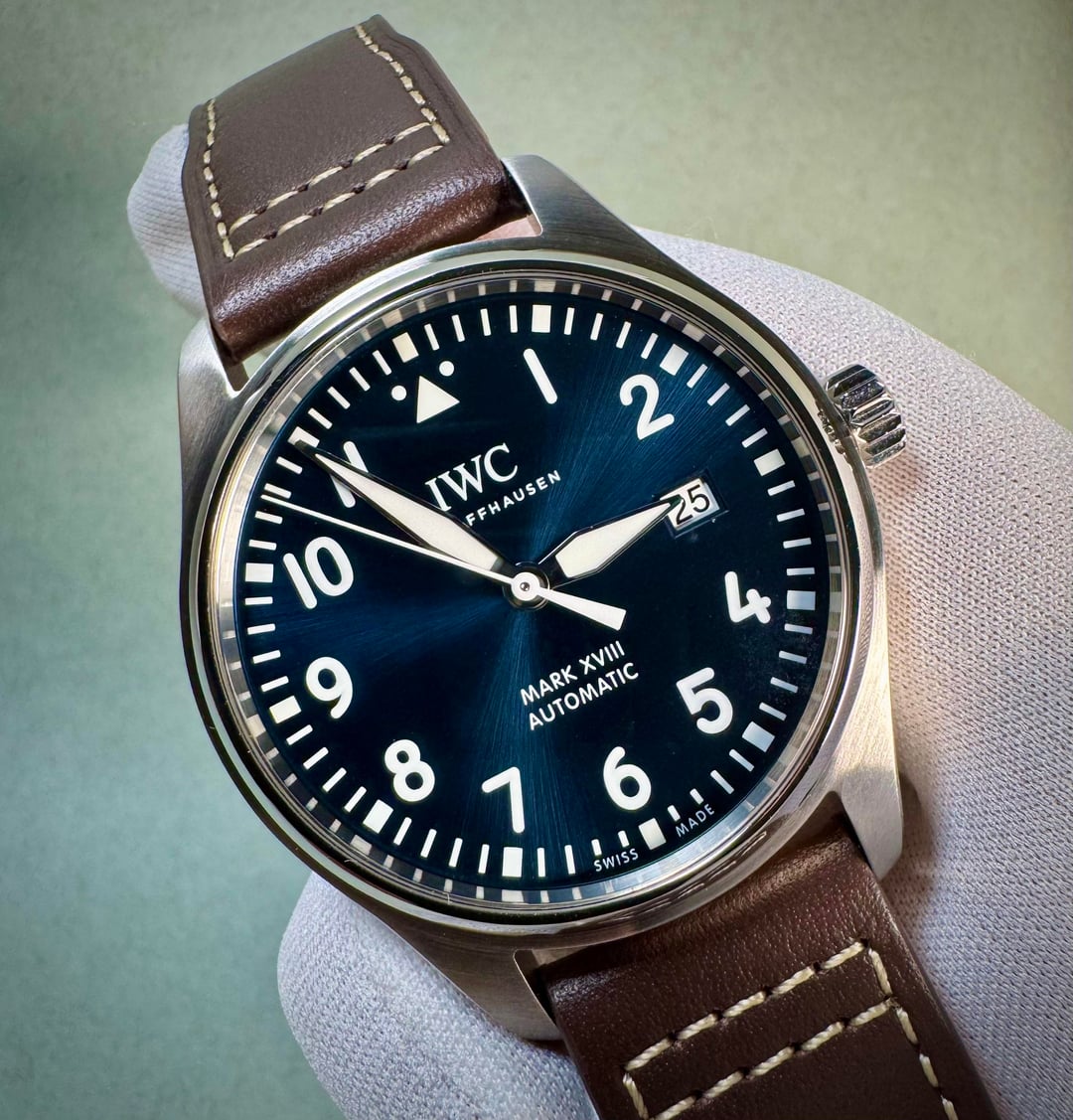 IWC Pilot’s Watch Mark XVIII “Le Petit Prince” | Ref. IW327004 | Full Set (Double Box + Warranty Card) | Excellent Condition Price: 3290+ ship Available here is the elegant and collectible IWC Pilot’s Watch Mark XVIII “Le Petit Prince”, reference IW327004. This special edition pays tribute to Antoine de Saint-Exupéry’s timeless novella Le Petit Prince, a theme IWC has celebrated with a distinctive design and deep-blue dial exclusive to the series. The 40mm stainless steel case is paired with a stunning sunburst blue dial, featuring bold white Arabic numerals, sword-shaped luminescent hands, and a neatly framed date window at 3 o’clock. The case is engineered with a soft iron inner cage for anti-magnetic protection, staying true to IWC’s aviation instrument watch roots. Inside ticks the robust and precise IWC Calibre 30110 automatic movement with a 42-hour power reserve. It comes fitted on the original brown calfskin strap with cream contrast stitching and signed steel pin buckle. This example is in excellent condition, both physically and mechanically, with minimal signs of wear. It is sold as a complete full set, including the original IWC double box and warranty card.