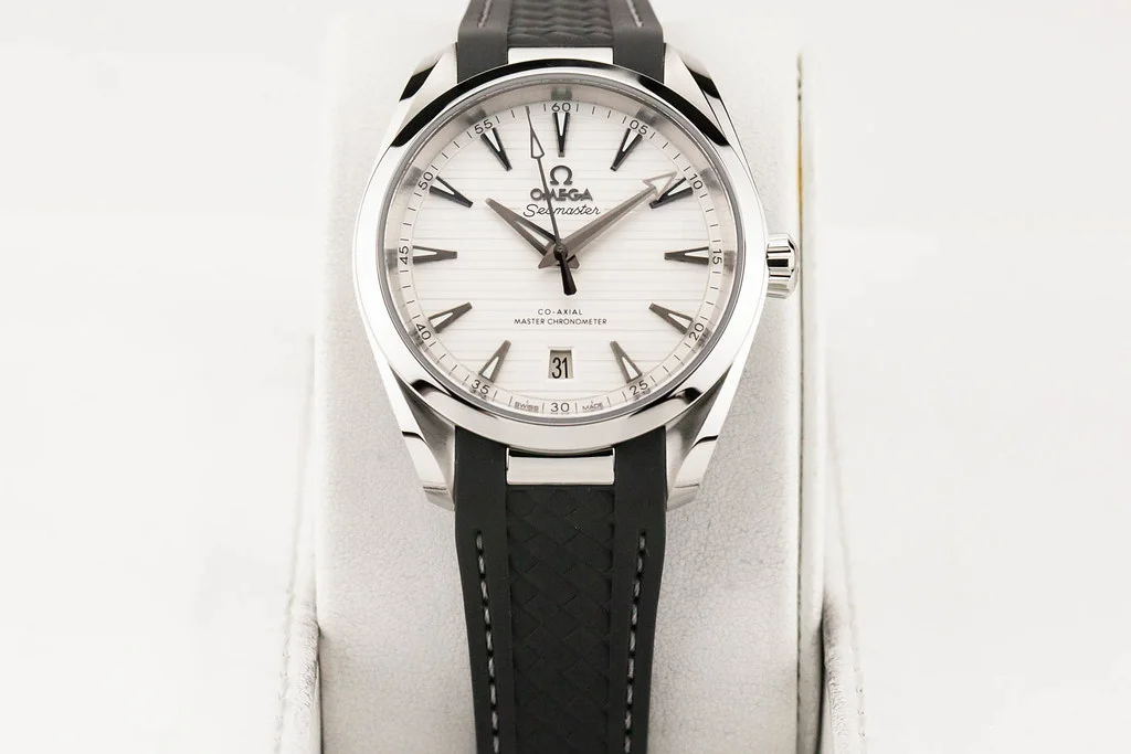 Up for sale is a brand new Omega Aqua Terra 8800 38mm with White Dial on Rubber Strap, reference # 220.12.38.20.02.001. It comes complete with all boxes, papers, booklets, hang tag and Omega Warranty Card dated October 2025.