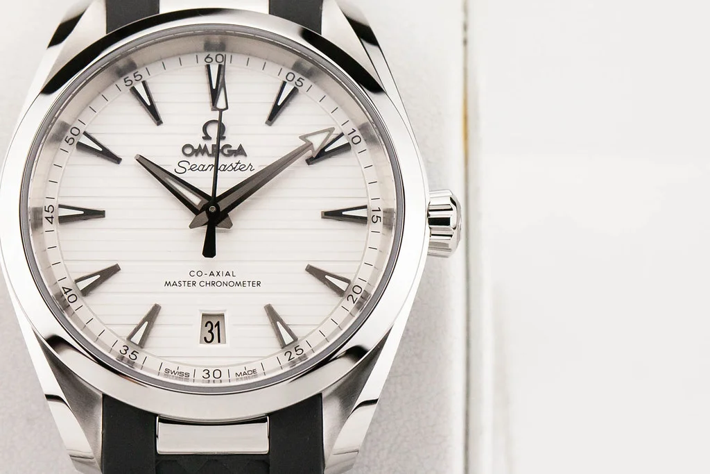 Up for sale is a brand new Omega Aqua Terra 8800 38mm with White Dial on Rubber Strap, reference # 220.12.38.20.02.001. It comes complete with all boxes, papers, booklets, hang tag and Omega Warranty Card dated October 2025.