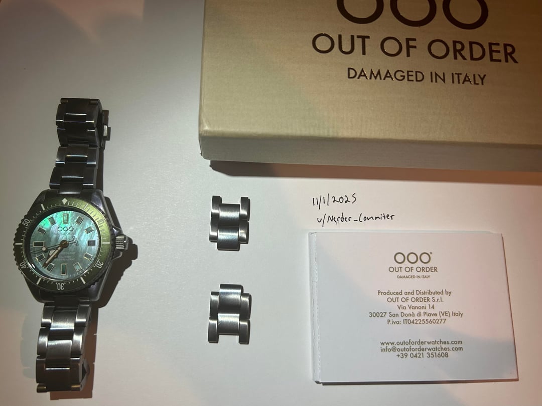 Up for sale is Out of Order’s 38mm Casanova with a Mother of Pearl dial. Unworn other than to size. Extra links included. Ships from Los Angeles. $175. Link to watch follows: https://outoforderwatches.com/products/green-casanova-38mm-mother-of-pearl?srsltid=AfmBOooRlqOh3qz5n8kGpb0yFzoI_9cTFfyIXRf1SLBZ7VTztYwDYBvA