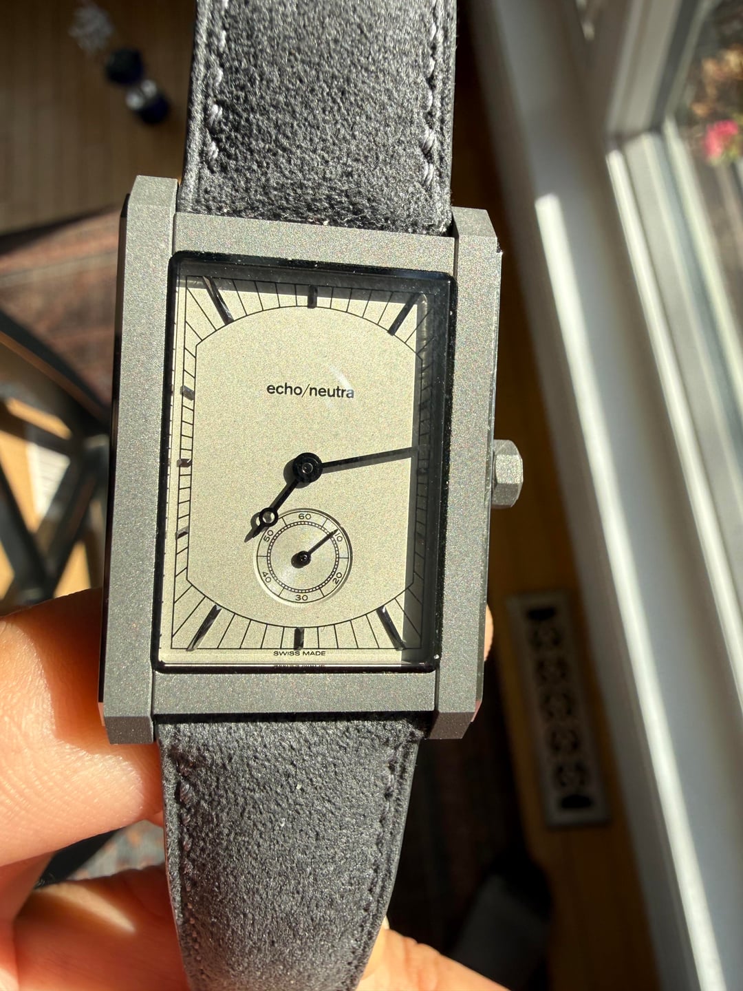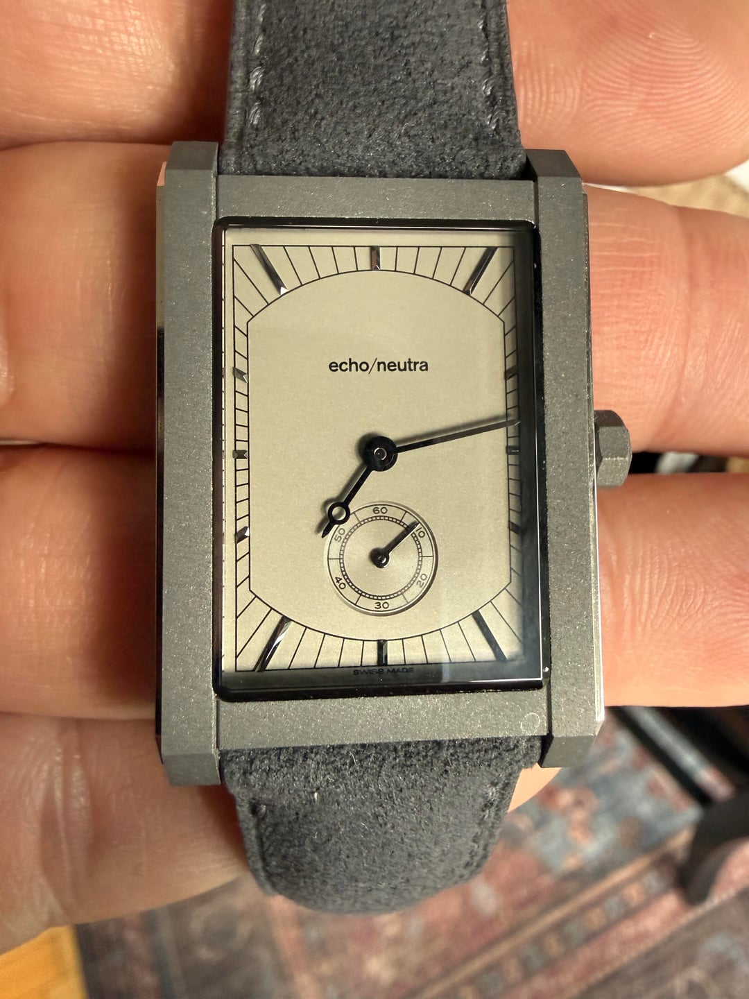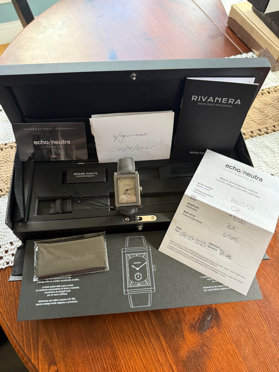 I absolutely love this watch but im just not wearing it so im looking to move it along. The Echo/Neutra Rivanera with grey dial is such a super cool piece. Ultra thin, super lite and manual wind. There was recently a pretty significant price increase on these and they are currently listed as “preorder” on the website so im assuming they’re sold out for now. I am the original owner of this one and it’s in excellent condition throughout. Im seeing a scuff on the back of the top crown side lug but im not finding any others. This comes with everything it shipped to me with. 2 black leather straps, 2 titanium tang buckles, strap tool, booklet, card dated July 2025, movement test sheet, unopened microfiber cloth. It does NOT come with the suede strap that its pictured with. Asking $1650 firm and shipped via PayPal f&f or Venmo. CONUS only please and no trades on this one. Ive listed a few other pieces today that aren’t getting any wrist time in the growing collection. Thanks for looking!