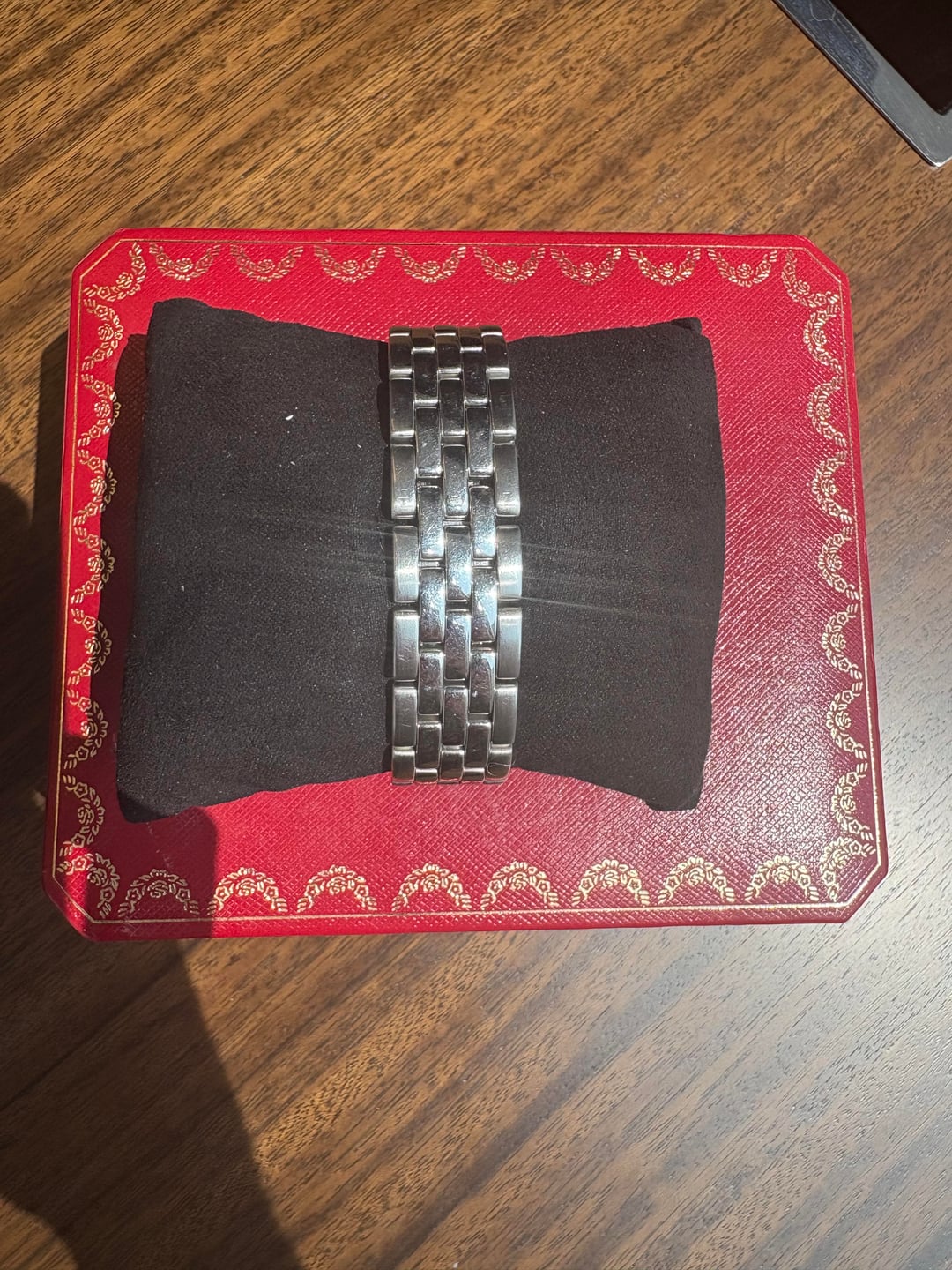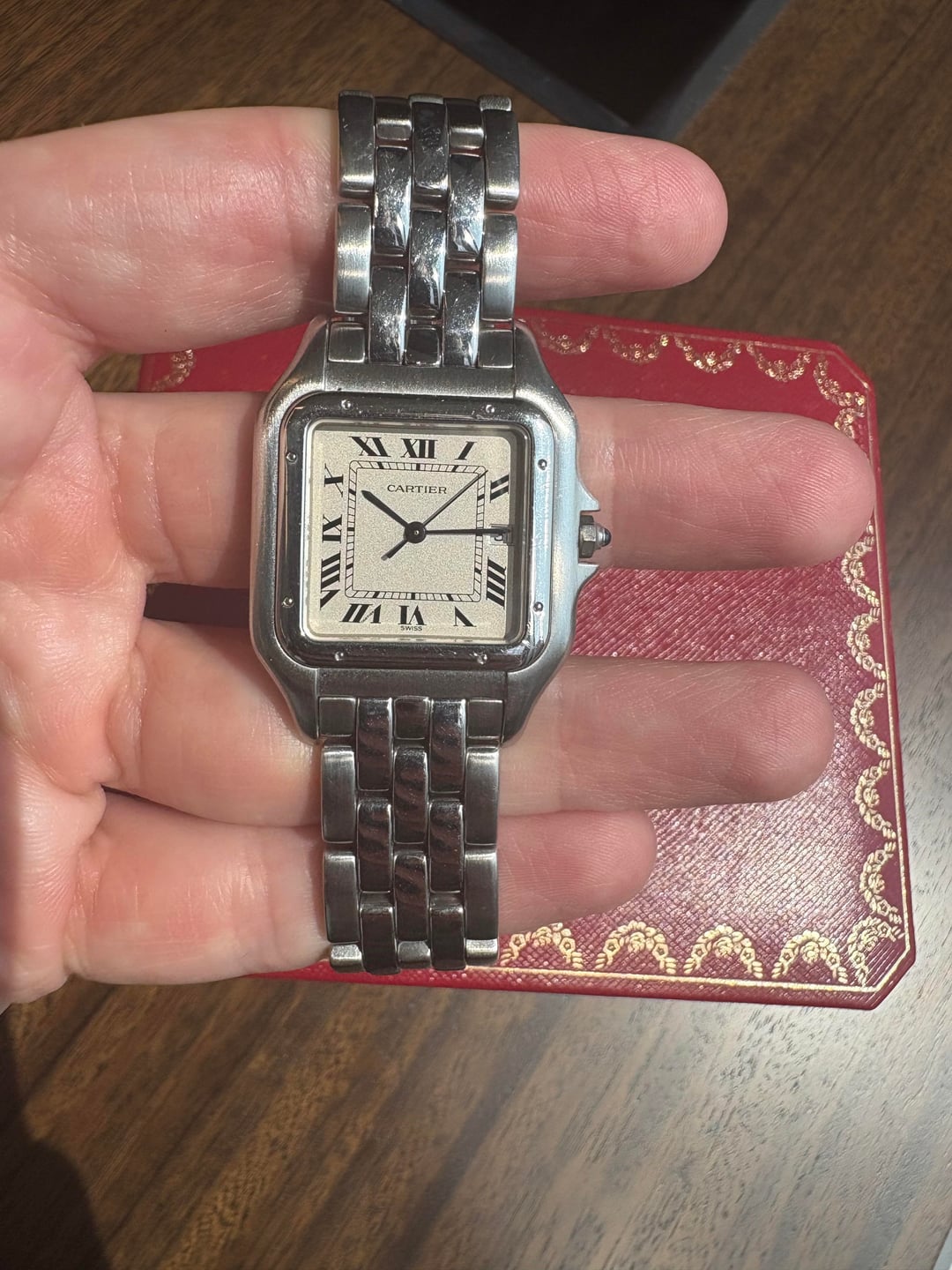 Looking to sell this stunning Cartier Panthère 1300 (Jumbo/XL) in excellent condition. It’s a true statement piece—timeless, elegant, and getting harder to find in this shape. 📦 What’s Included: Watch + Box (no papers) Originally purchased from a respected vintage dealer—I’ll include the invoice and provenance documents for peace of mind 🕰 Specs: Model: Cartier Panthère Reference: 1300 Case Size: 30mm (Jumbo/XL) Movement: Cartier Quartz Dial: White w/ Roman Numerals Hands: Blue sword Features: Date + sweep seconds Thickness: 6mm Lug Width: 16mm Bracelet: Stainless steel w/ hidden butterfly clasp 💵 Price: $3,800 shipped (US only) Accepted payments: Venmo, Zelle, PayPal FF or GS (buyer covers fees), or face-to-face in NYC 📲 Have questions or want to see it live? I’m happy to do a FaceTime showing anytime. Don’t hesitate to reach out. Thanks for looking! [Pic/Timestamp](https://imgur.com/a/Kqjv95P)