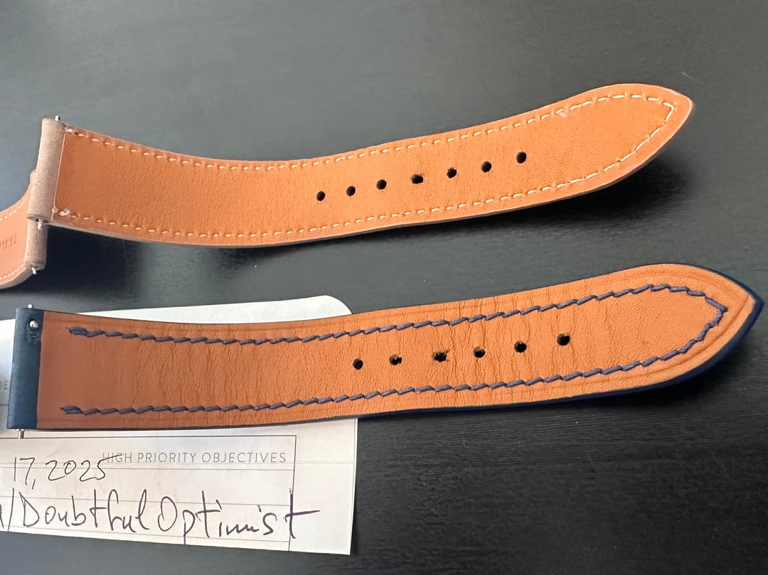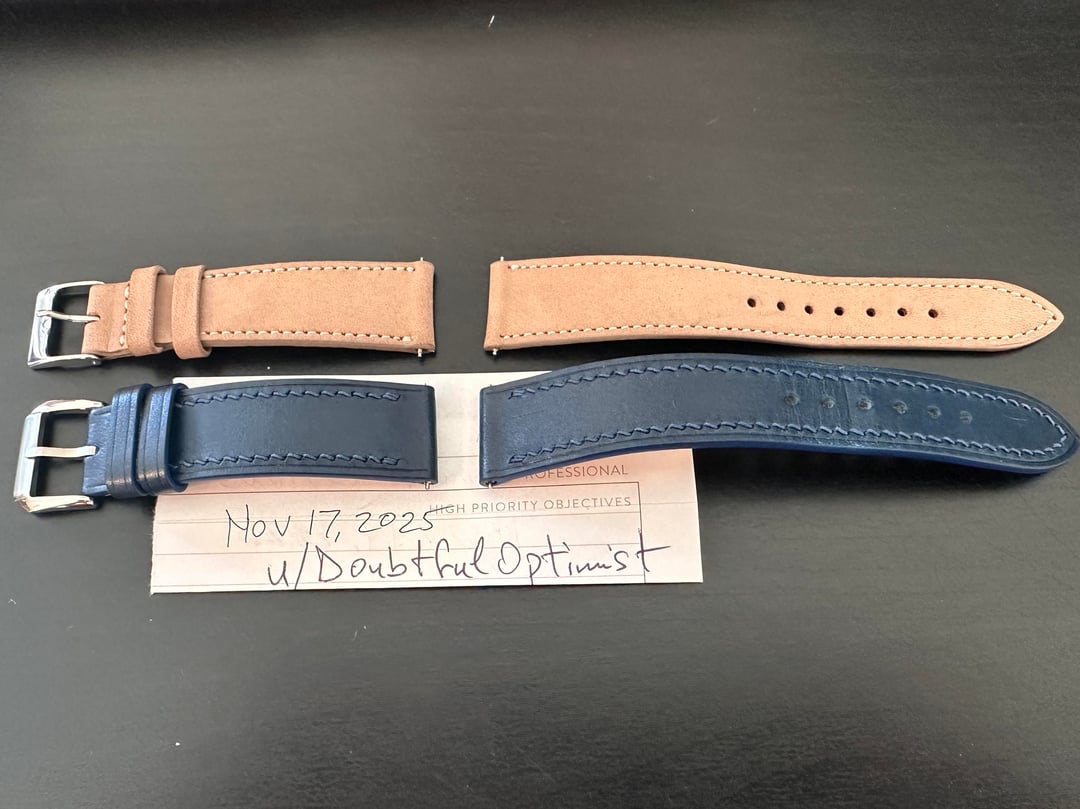 Hello everyone, I have for sale two high quality leather straps. Shipping to CONUS only please. The blue strap has been worn a few times, but is in very good condition. It was purchased from an Etsy seller, and it comes with quick release. The tan/light taupe strap was worn once, but I decided it didn’t quite work on the watch I needed it for. It’s made by Hodinkee, the leather is very supple, and it has quite a ‘luxurious’ feel. Blue strap: $40 + shipping Tan strap: $70 + shipping Feel free to contact me with any questions. Thank you.