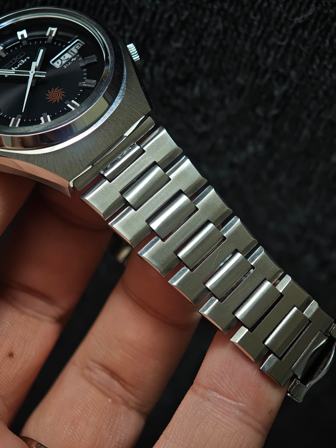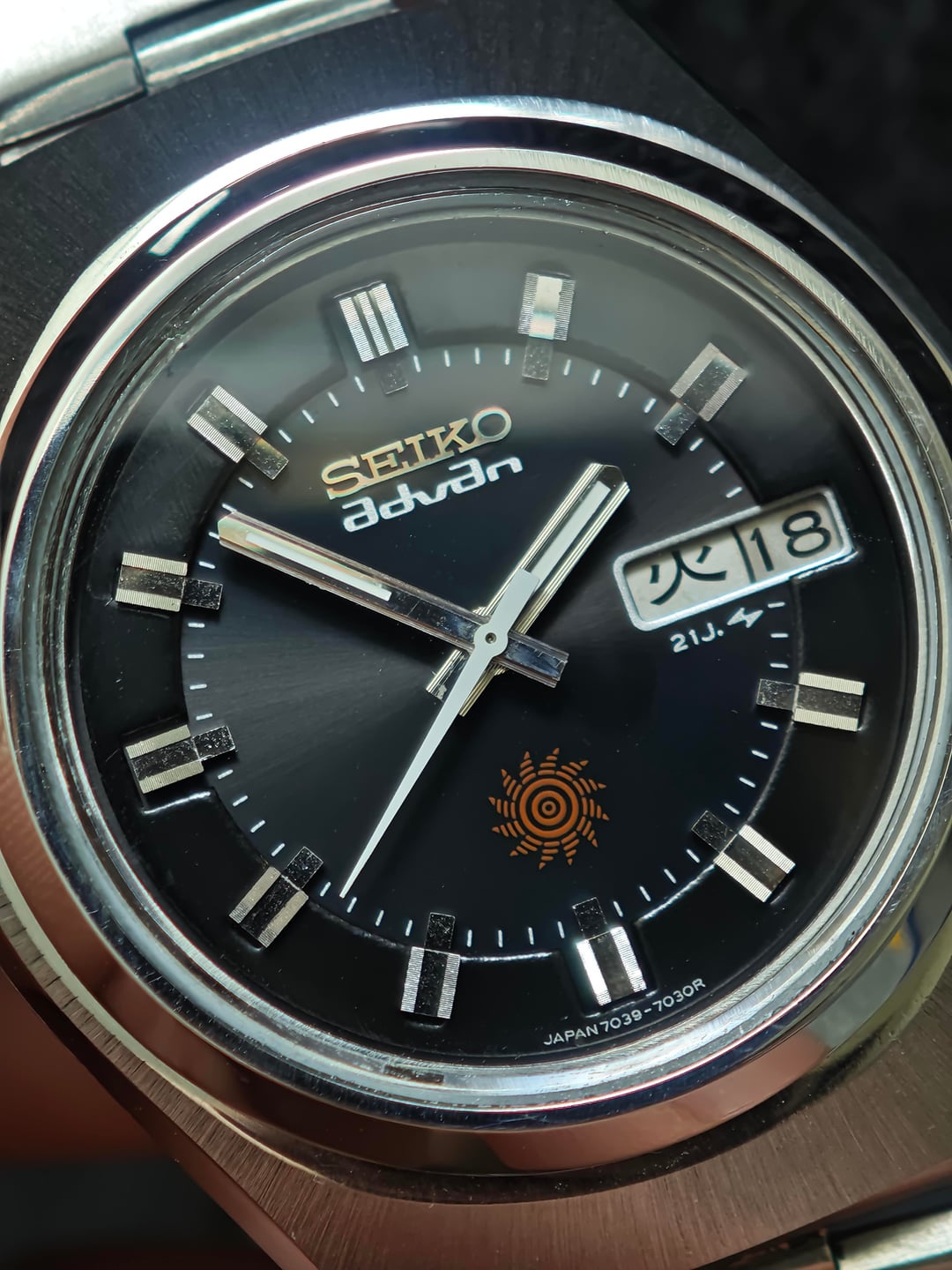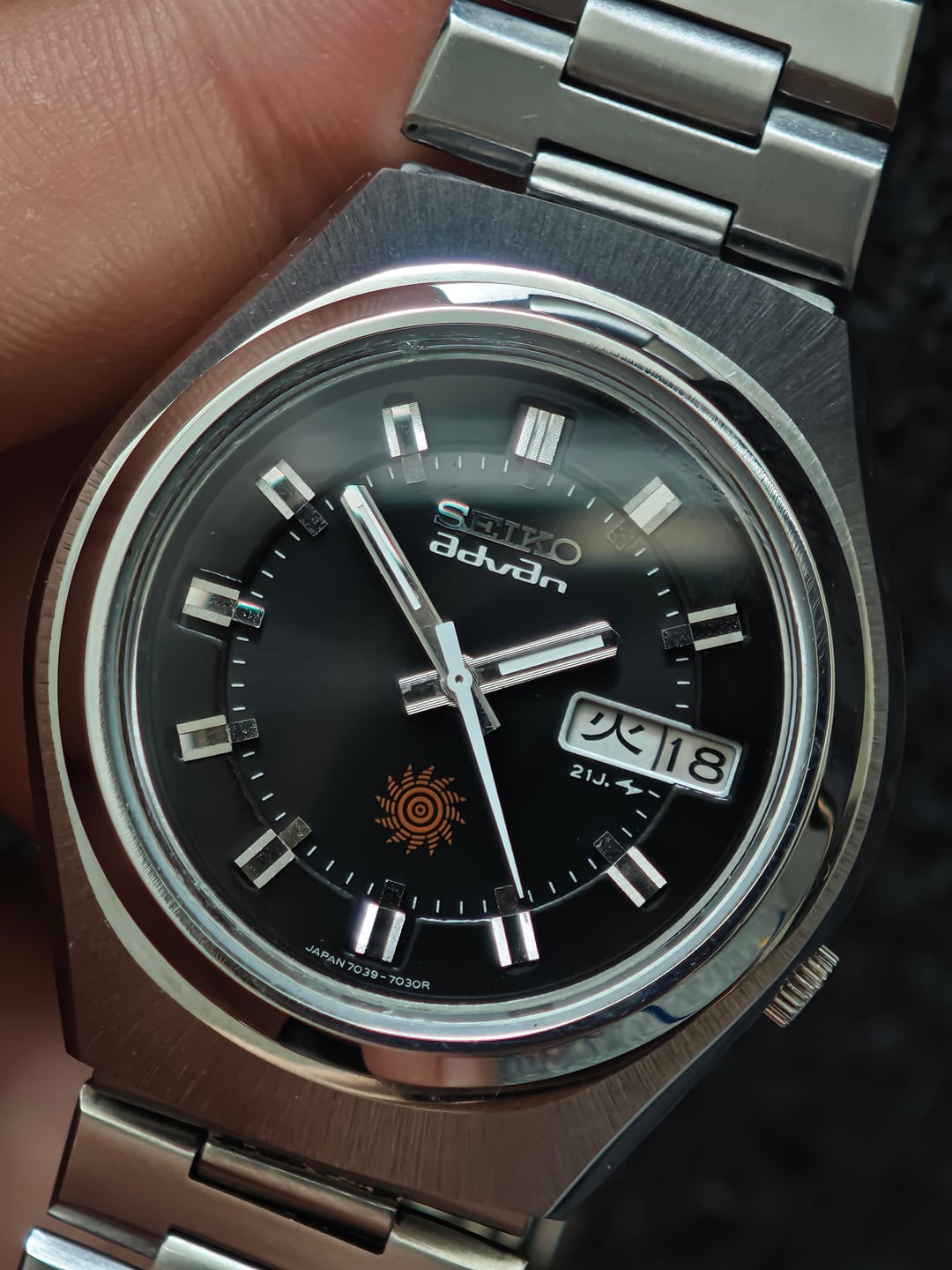 Putting up one of the cleaner early-70s Advans I’ve sourced lately. This 7039-7030R comes from the first generation of the Advan line—back when Seiko was experimenting with new design language but still applying the high-quality finishing of the late ’60s era. Dial & Details: Stepped two-level dial with a recessed minute track that gives the watch real depth on wrist Tight, fine sunburst radial finish that shifts beautifully in natural light Early-Advan sun emblem at 6 o’clock, used only in the first production years Sharp applied block indexes with brushed tops and polished flanks Clean, crisp printing and a well-balanced layout Case & Condition: Original top brushing still visible Strong geometry with crisp edges Compact 70s profile with great presence Running well and ready to wear A tasteful, thoughtfully executed piece from a period when Seiko was pushing design forward without sacrificing build quality. Price: $365 shipped (tax included).