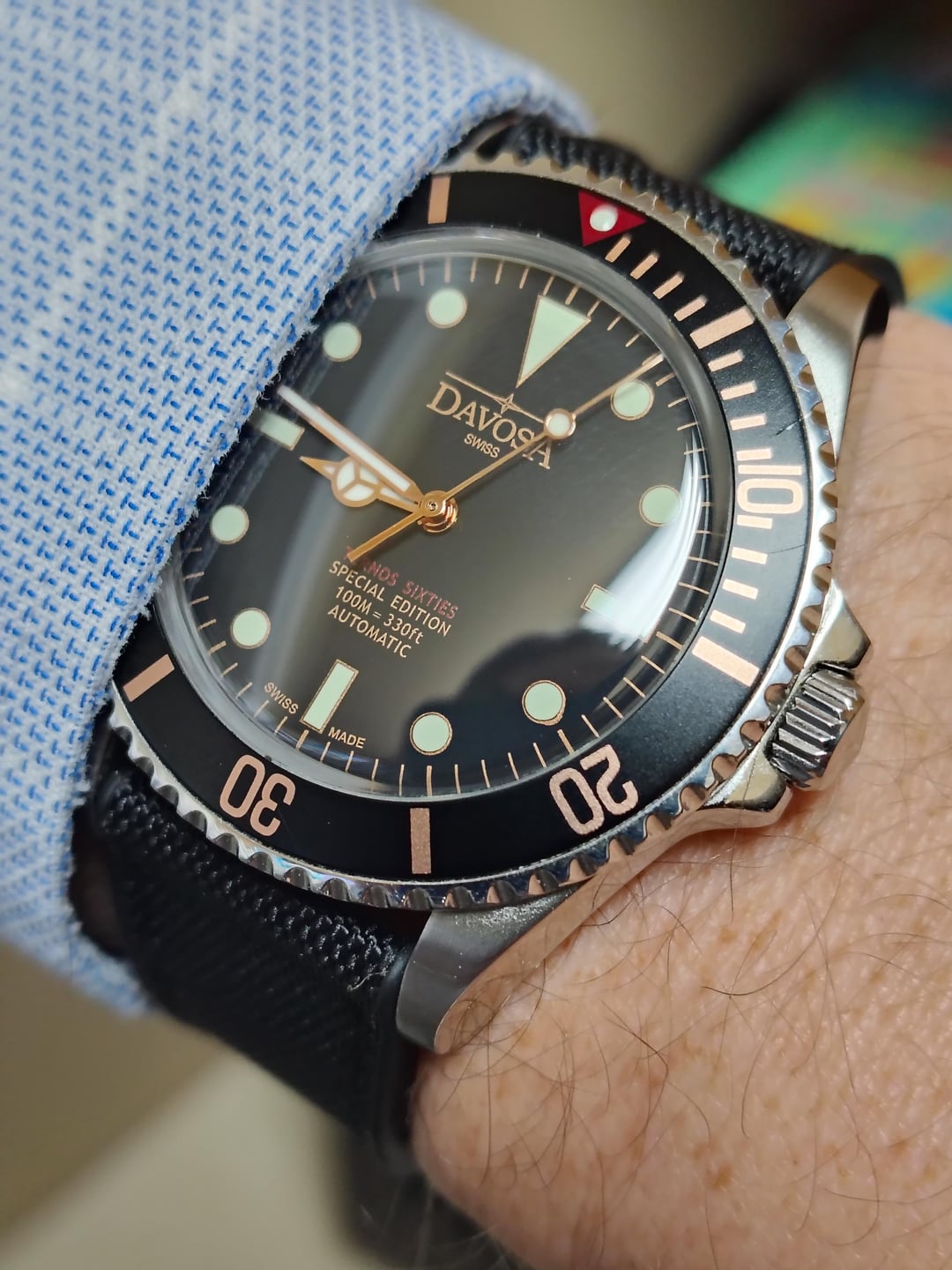 Selling a Davosa Ternos LE Sixties US Special Edition 40mm Watch only in hybrid strap with deployant clasp, and additional striped NATO. No bracelet. Excellent condition but has small mark on bezel at 2 o'clock as shown Priced accordingly at $425 USD shipped in the US Comment before sending DM Thanks for looking!