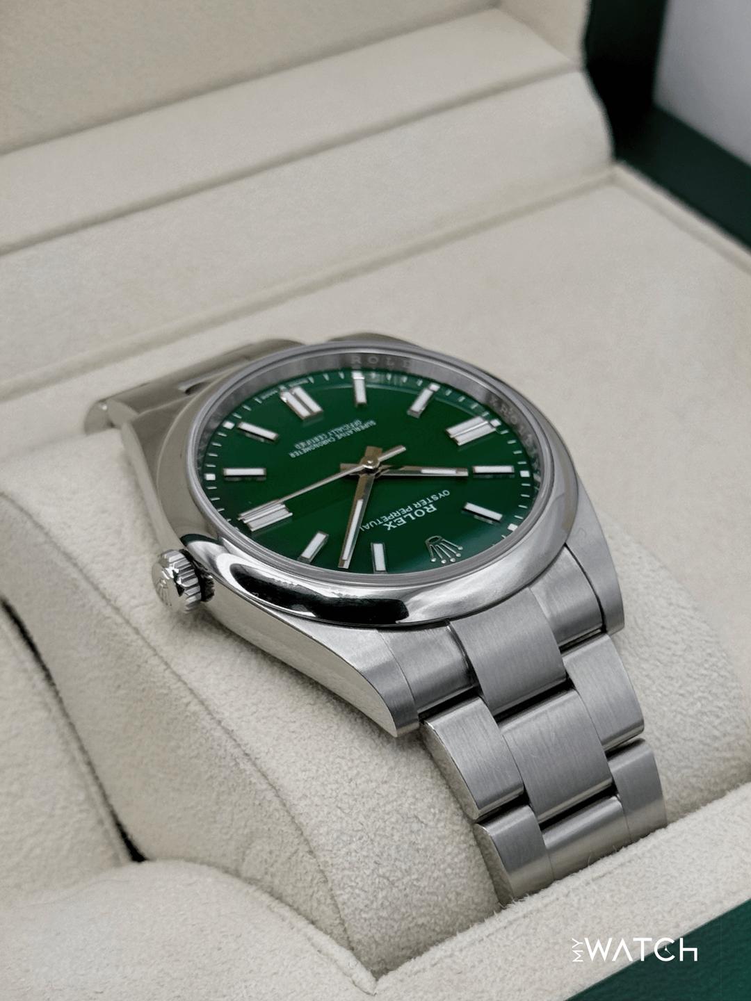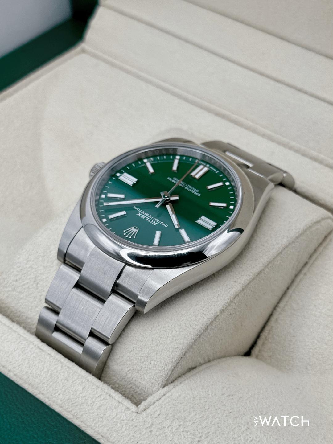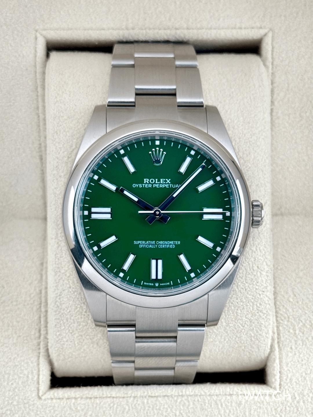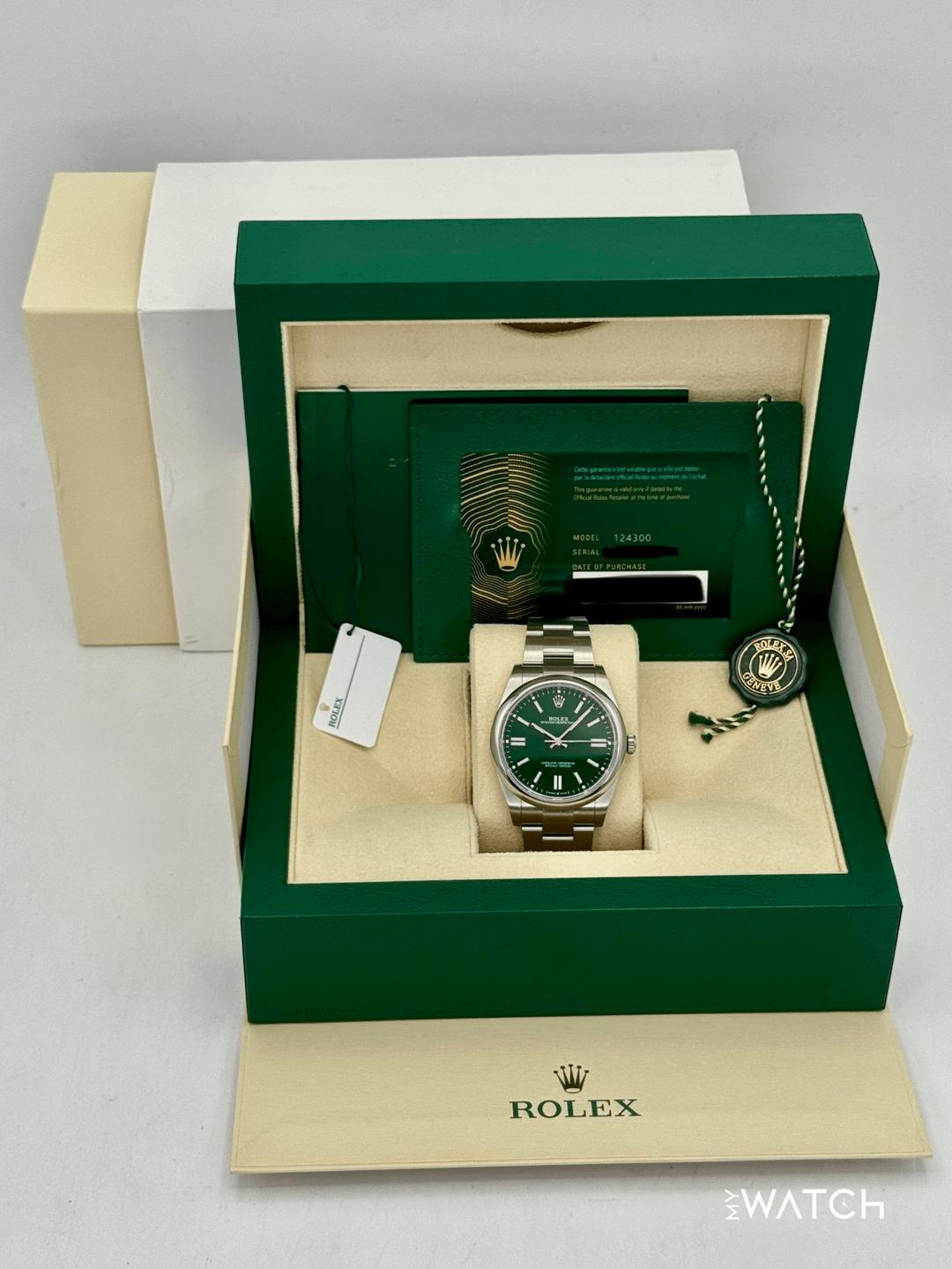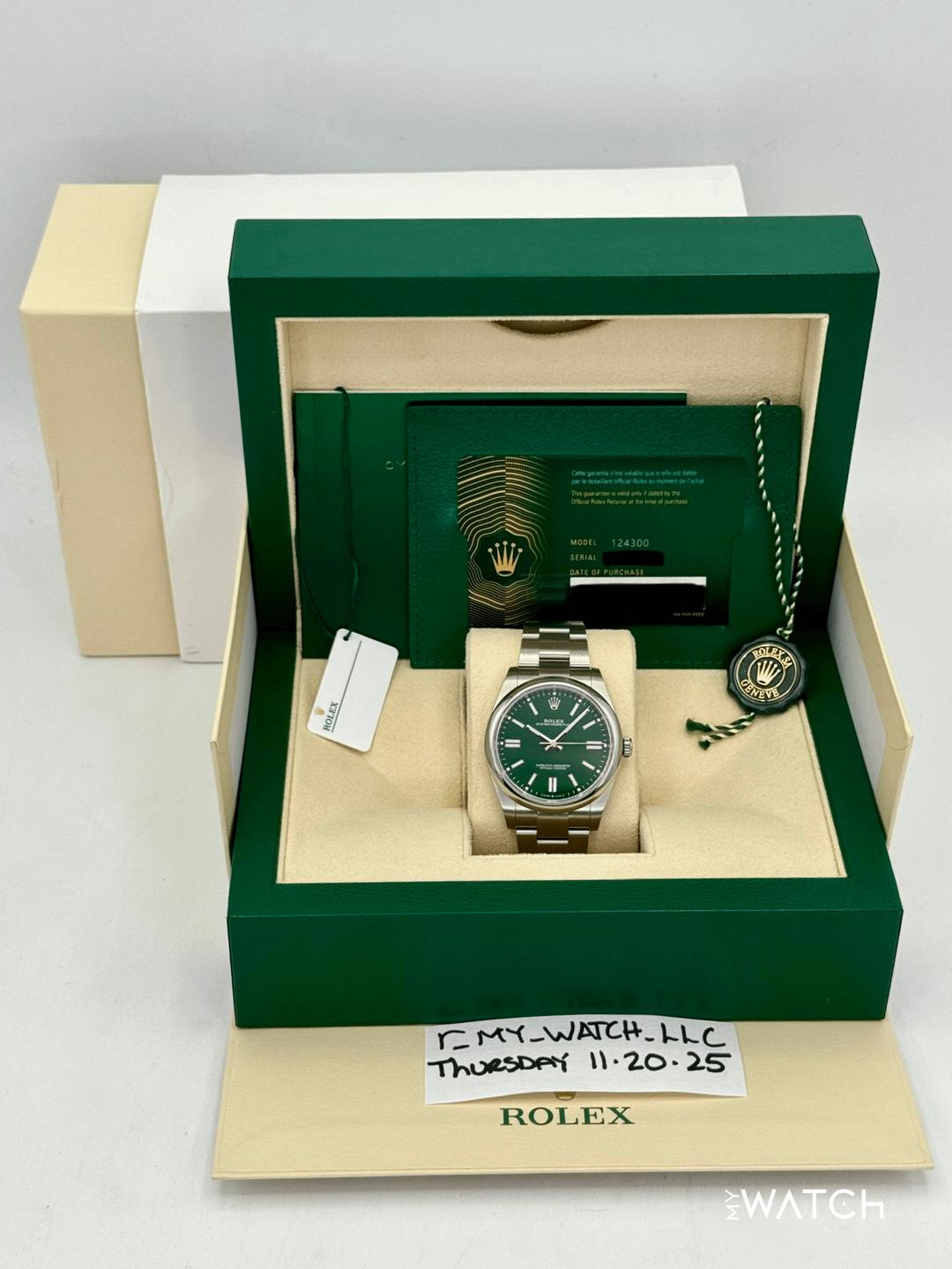 🔵**2025 Rolex Oyster Perpetual 41mm 124300 Stainless Steel Green Dial with Oyster Bracelet** 🔵**TRADE or SELL us your luxury watch, all brands considered. Message me details.** **Includes the following:** **✔️Original Rolex Double Boxed** **✔️Box and Papers - Yes** **✔️Warranty card dated February 2025** **✔️5 year manufacturer warranty** **✔️Manual and Warranty booklets** **✔️Green and White Hang Tags included** **✔️Size: 7.75inch wrist (Full Links)** **✔️Material: Oystersteel** **✔️Watch is in excellent overall condition. Please see photos for details.** **✔️Trades welcome** Business Name: **My Watch LLC** LOCATION: Oak Park, Michigan ✔️[MyWatchLLC.com](http://mywatchllc.com/) for current inventory ✔️Google Business Listing [https://g.co/kgs/Cmd6FPW](https://g.co/kgs/Cmd6FPW) ✔️Business Hours M-F 9-6 ✔️Facetime/Video chat/calls welcome to view the watch interested. ✔️Contact: 248-422-0909 via text or call for quickest response. 🟢TERMS: Visit [MyWatchLLC.Com](http://mywatchllc.com/) for payments accepted 🟢REFERENCES/REVIEWS: We are well reviewed on all platforms from google, trust pilot, rolexforums, additionally we have 300+ reference in multiple FaceBook watch groups, reference checks welcome. 🟢SHIPPING: If you are not local, we offer Fully Insured FedEx overnight shipping in the USA for a fee. International shipping available.