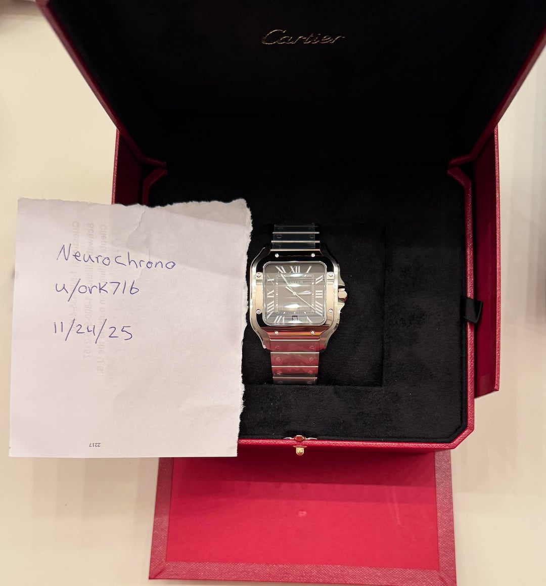 Brand New Cartier Santos de Cartier Large Model Watch - Ref. WSSA0096 (October 2025 Release) Price: $7650 (retails for $8,650 at Cartier boutiques; this is a steal for a fresh-out-of-the-box piece!) Comes as a full set: box, card (dated 11/25), stickers, protective film on bracelet, tag and all accessories (including extra strap) This is completely new and unworn. Please DM for inquiries Follow my IG @neurochrono