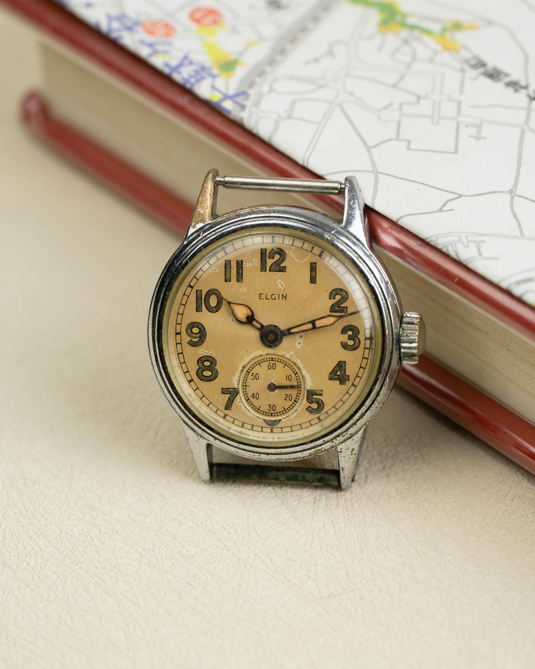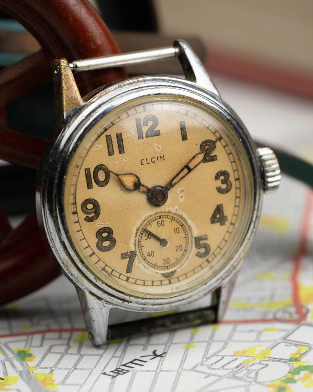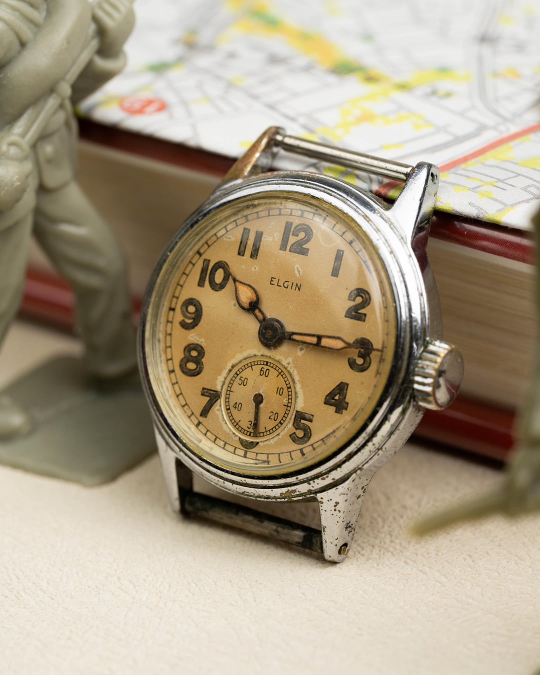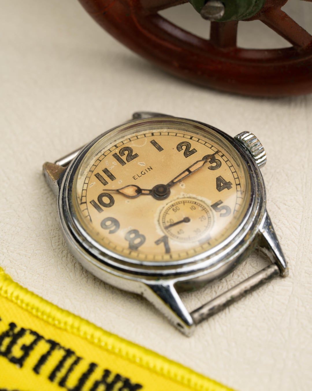 For sale is this Elgin WW2 Military Issued Watch, a genuine piece of history ready for its next chapter. This classic timepiece embodies the practical and sturdy design required of watches issued during the era of conflict. The watch features a compact 30mm case (likely chrome-plated base metal) which was the standard size for military issue watches. The dial has acquired a warm, beautiful yellow/patina color consistent with its age, giving it immense vintage character. The highly legible aged black Arabic numerals are bold and easy to read, with a functional seconds sub-dial at the 6 o'clock position to aid in precise timekeeping. While currently offered as a watch head (no band), its 18mm lug width makes it simple to pair with your choice of military canvas or leather strap. This timepiece is a fascinating and dependable relic, needing only a strap to be brought back to life on the wrist. **Key Features** * **Brand:** Elgin * **Model:** WWII Military / Field Watch (Watch Head Only) * **Era:** World War II (WWII) * **Case Size:** **30mm** (excluding crown) * **Lug Width:** 18mm * **Case Material:** Base Metal (Chrome-plated/Steel Back) * **Dial:** Yellow/Patina with Arabic numerals * **Complications:** Seconds Sub Dial at 6 o'clock * **Movement:** Automatic (Self-Winding) * **Condition:** Honest vintage condition, showing wear on the case and patina on the dial consistent with age and military use. Ready for the addition of a strap. Please reach out if you want to see this or any other watch over FaceTime. See all pictures for details and timestamp. Feel free to message, comment, or PM me any questions you may have. Shipping is included in the United States. I accept most forms of major payment. For more vintage watches and first dibs on affordable pieces follow my Instagram at: [Ar.ro.ws](https://www.instagram.com/ar.ro.ws/) I also accept payment plans via Klarna [on my website, arrowsvintage.com](https://www.arrowsvintage.com/shop/p/elgin-ww2-military-issued-watch)