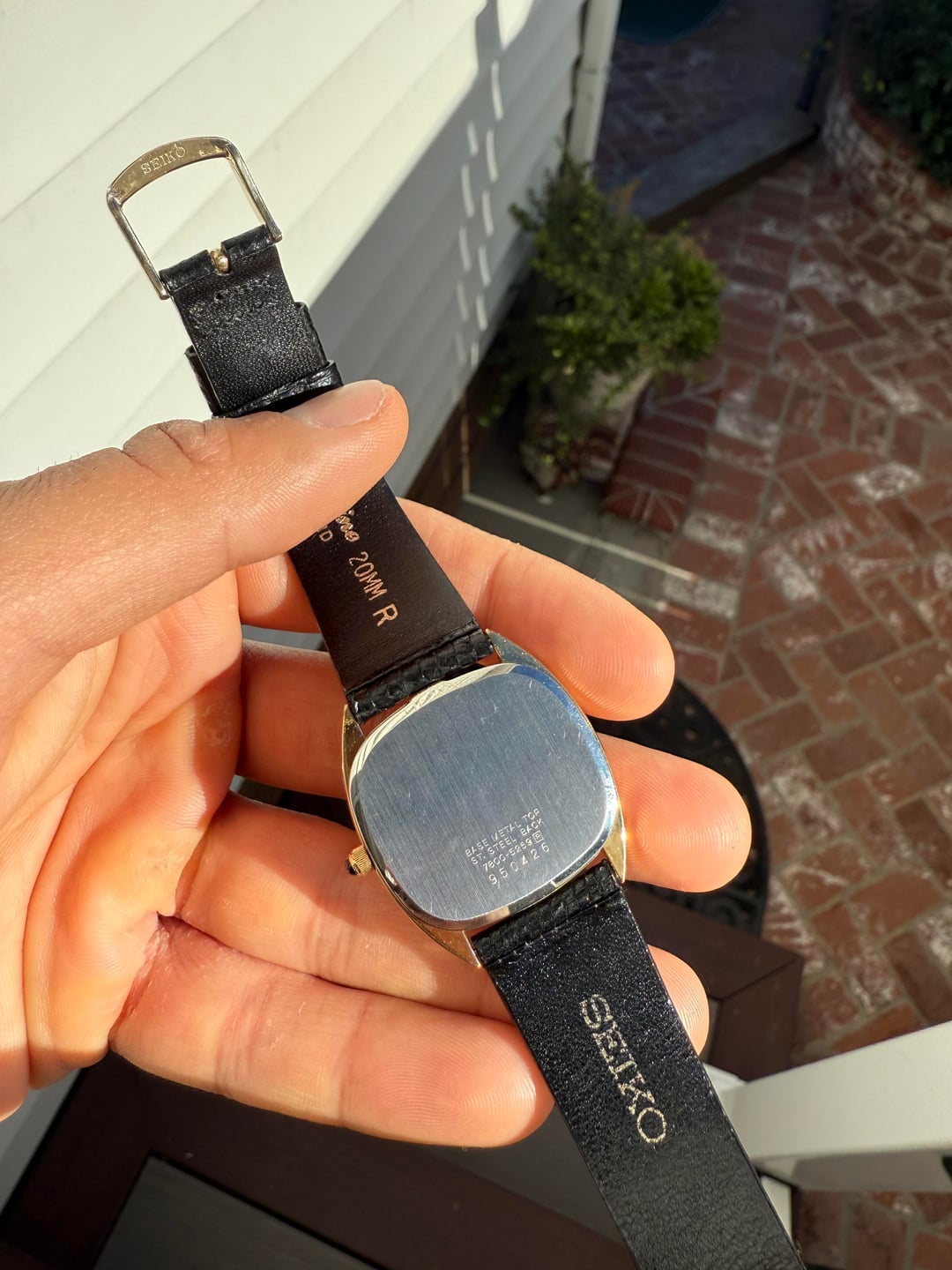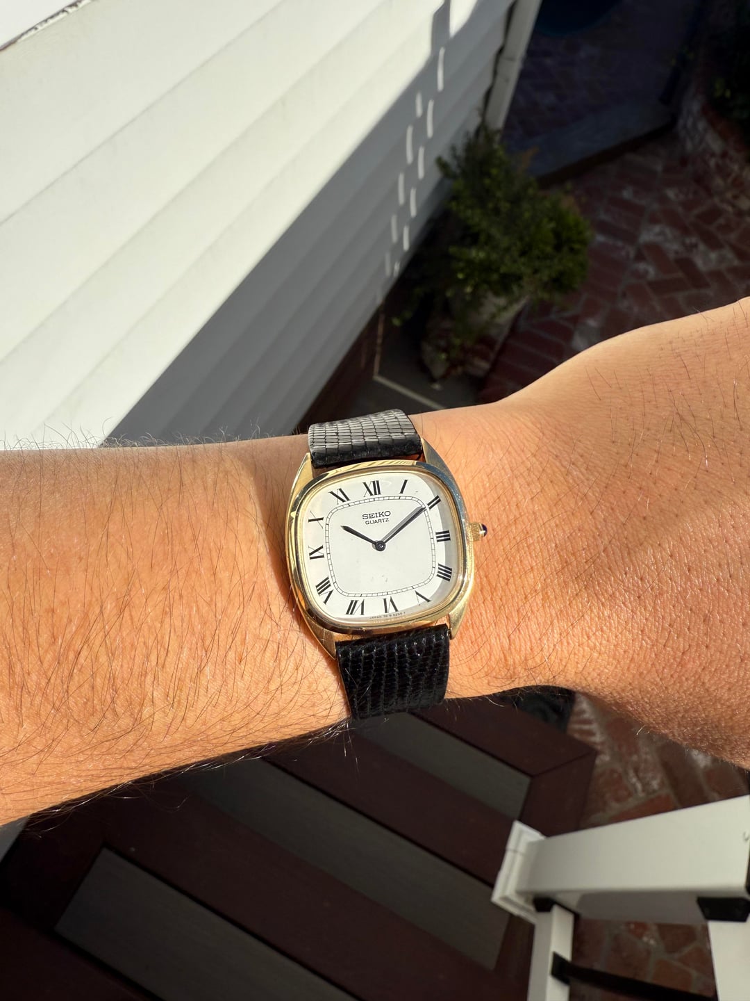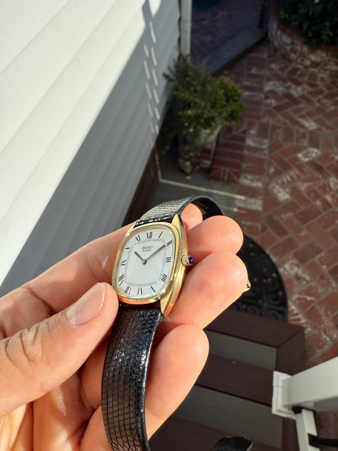 Description: 1979 Gold Plated Seiko “Tank” style watch. This watch has a quartz movement. Condition: Great vintage condition. Dial is clean. All original. Case has a few scratches for its age. Runs well and sets time nicely. Case finishing is all original and there is no wearing on the gold plating. Strap is all original as well with a hole punched at the end (probably because the previous owner had a smaller wrist) Dimensions: I think 34/35 mm. I don’t own calipers so eyeballing. My wrist is 7” for reference. Payment: $280 Venmo, Zelle, PayPal f&f, PayPal g&s + 3% Shipping: shipping to CONUS included
