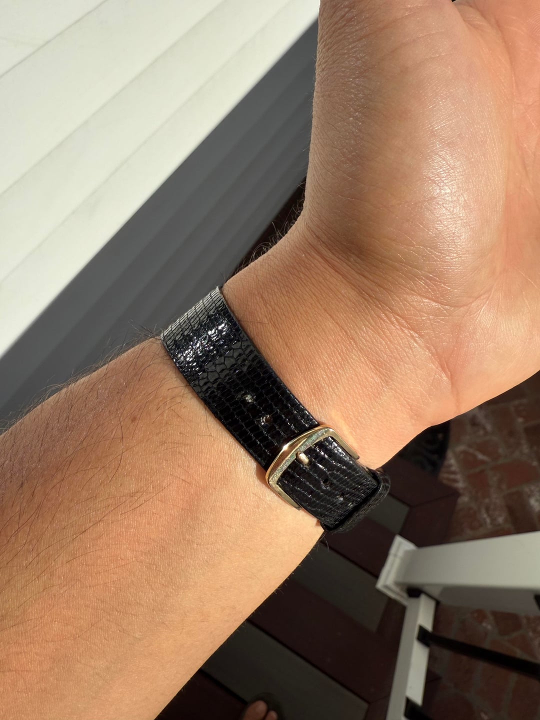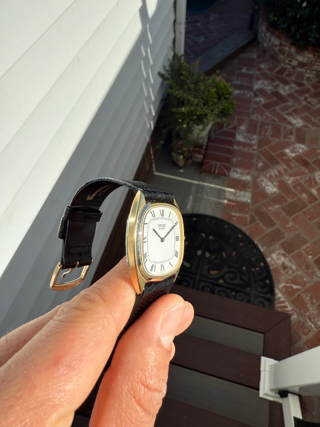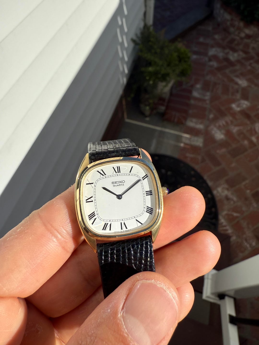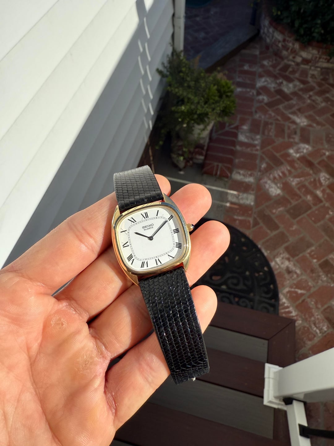 Description: 1979 Gold Plated Seiko “Tank” style watch. This watch has a quartz movement. Condition: Great vintage condition. Dial is clean. All original. Case has a few scratches for its age. Runs well and sets time nicely. Case finishing is all original and there is no wearing on the gold plating. Strap is all original as well with a hole punched at the end (probably because the previous owner had a smaller wrist) Dimensions: I think 34/35 mm. I don’t own calipers so eyeballing. My wrist is 7” for reference. Payment: $280 Venmo, Zelle, PayPal f&f, PayPal g&s + 3% Shipping: shipping to CONUS included