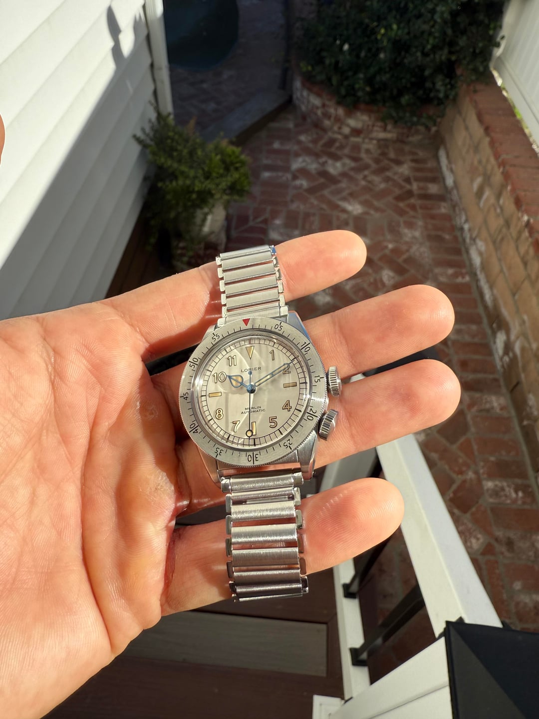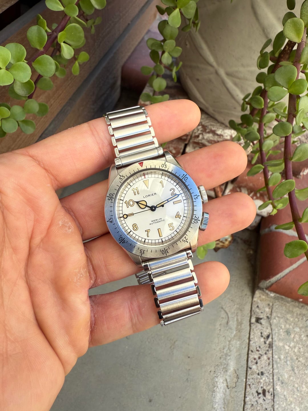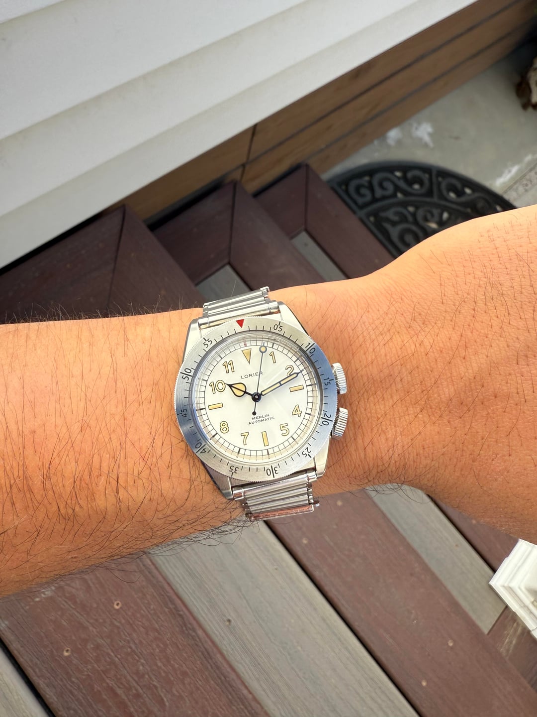 Description: Selling my limited edition Lorier Merlin. Watch is a recreation of WWII “Weems” watches. Comes on a new Forstner Klip ladder bracelet. I got it to be “period correct” with this watch and think it looks great. Condition: Watch has been worn a few times. It’s in like new condition with a few / if any hairline scratches. The back lugs might have very light scratches from when I changed the strap out. Runs to spec. Will come with its box, original unworn nato strap, and the Forstner bracelet. Payment: $480 Venmo, Zelle, PayPal F&F or PayPal g&s + 3% Shipping: shipping included to CONUS Link to watch: https://www.lorierwatches.com/products/merlin?srsltid=AfmBOoqTTAOvhht2oFzXwYpW4n2DHsgIpEoXxFr51-K_RNjgIbmEhd3E