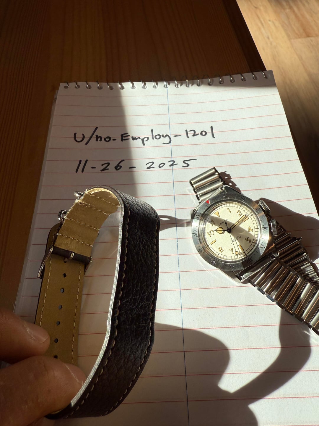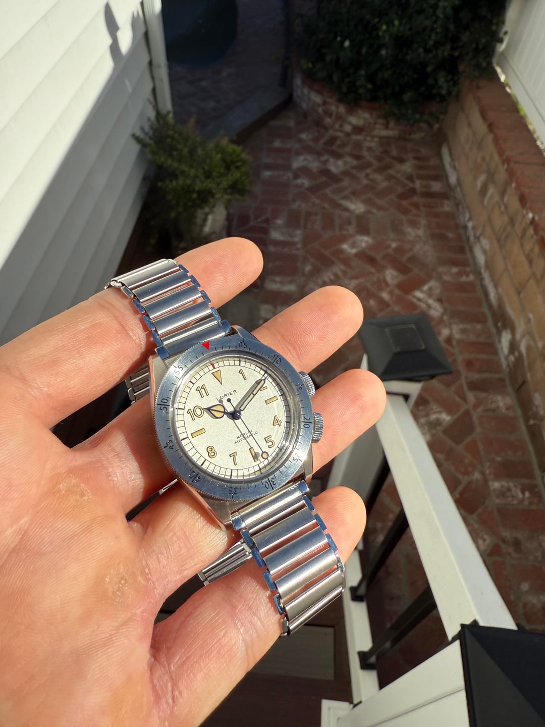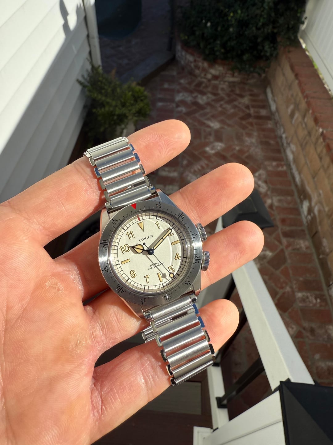 Description: Selling my limited edition Lorier Merlin. Watch is a recreation of WWII “Weems” watches. Comes on a new Forstner Klip ladder bracelet. I got it to be “period correct” with this watch and think it looks great. Condition: Watch has been worn a few times. It’s in like new condition with a few / if any hairline scratches. The back lugs might have very light scratches from when I changed the strap out. Runs to spec. Will come with its box, original unworn nato strap, and the Forstner bracelet. Payment: $480 Venmo, Zelle, PayPal F&F or PayPal g&s + 3% Shipping: shipping included to CONUS Link to watch: https://www.lorierwatches.com/products/merlin?srsltid=AfmBOoqTTAOvhht2oFzXwYpW4n2DHsgIpEoXxFr51-K_RNjgIbmEhd3E