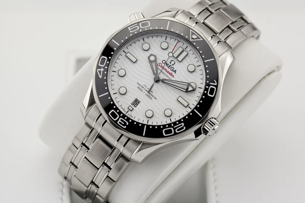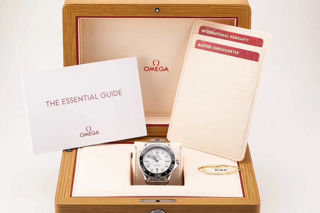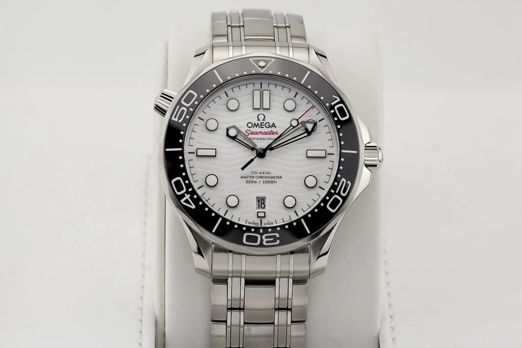 Up for sale is a brand new Omega Seamaster 300 42mm 8800, White Dial / Black Bezel on Bracelet, reference # 210.30.42.20.04.001 It comes complete with all boxes, papers, booklet, hang tag and Omega Warranty Card dated November 2025.