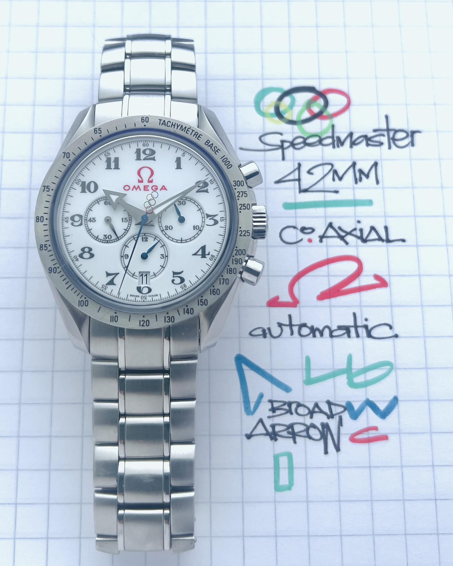 Omega Speedmaster Chronograph Broad Arrow Olympic Games Ref. 321.10.42.50.04.001 The design language of the Speedmaster is iconic and forever—and of course the greatest on a variety of straps as well. While the clean white dial and bold legible arabic numerals paired with broad arrow hands are immediately captivating, a closer look on the chronograph hand reveals the Olympic rings. The stainless steel case measures 42 mm in diameter X 48 height or lug to lug X 14 cc including sapphire crystal X 20 mm lug width with a total length of 8in but to be extra sure of fit, wrist size should be 7.8in —it is possible to source extra links. Lastly, this timekeeper is powered by an automatic Co-Axial calibre 3313 pacing -1 second a day with a 282 amplitude (no service history but a healthy watch). Timestamp, pix, videos and timegrapher: https://drive.google.com/drive/folders/1BaqRJlW-NMABfBTr5FWNzE6cocxKrajm?usp=share_link * no box or papers * minimal wear and light polish on bracelet and clasp * video is the best way to view the watch if in-person test drive is not available. Due to the different characteristic of the cameras and gadgets used, the color of the watch you purchase may not be the same as shown on this website or on our Instagram. * will consider trades that make sense but please consider time, shipping, and trade value—not market. * local special: can possibly accommodate at ButterScotch in Downtown Long Beach by appointment * All sales final unless the watch is misrepresented or lost in transit (always fully insured) * Link to [feedback here](https://www.reddit.com/r/WatchExchangeFeedback/search?q=soycowboy&restrict_sr=1&sort=new) & [watchcharts here](https://watchcharts.com/repcheck/user/soycowboy?source=reddit&type=feedback) * Asking a *negotiable* **$2640** via bank wire, Zelle, venmo, or possibly Paypal with super strong references or if I know you. Price includes fully insured Fedex shipping in the USA— hand delivery in Long Beach with drinks or coffee on me ;). Cheers, Stephen