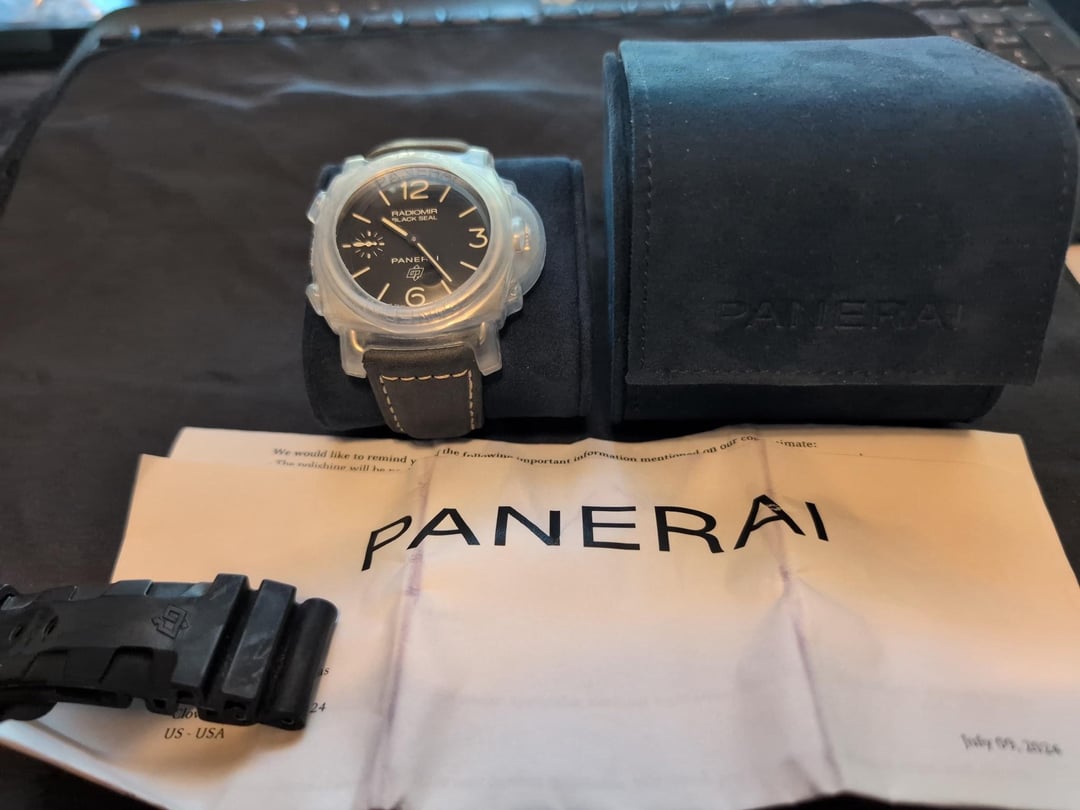 Panerai Radiomir Black Seal PAM00380 45mm. Watch, travel roll & extra strap. Fresh service from Panerai with warranty until July 2026. **$3150** / Zelle, Venmo, or WU accepted. Timestamp: https://imgur.com/a/n3oXpJ1 I have tons of references on multiple platforms including WatchExchange. I am more than happy to show these.