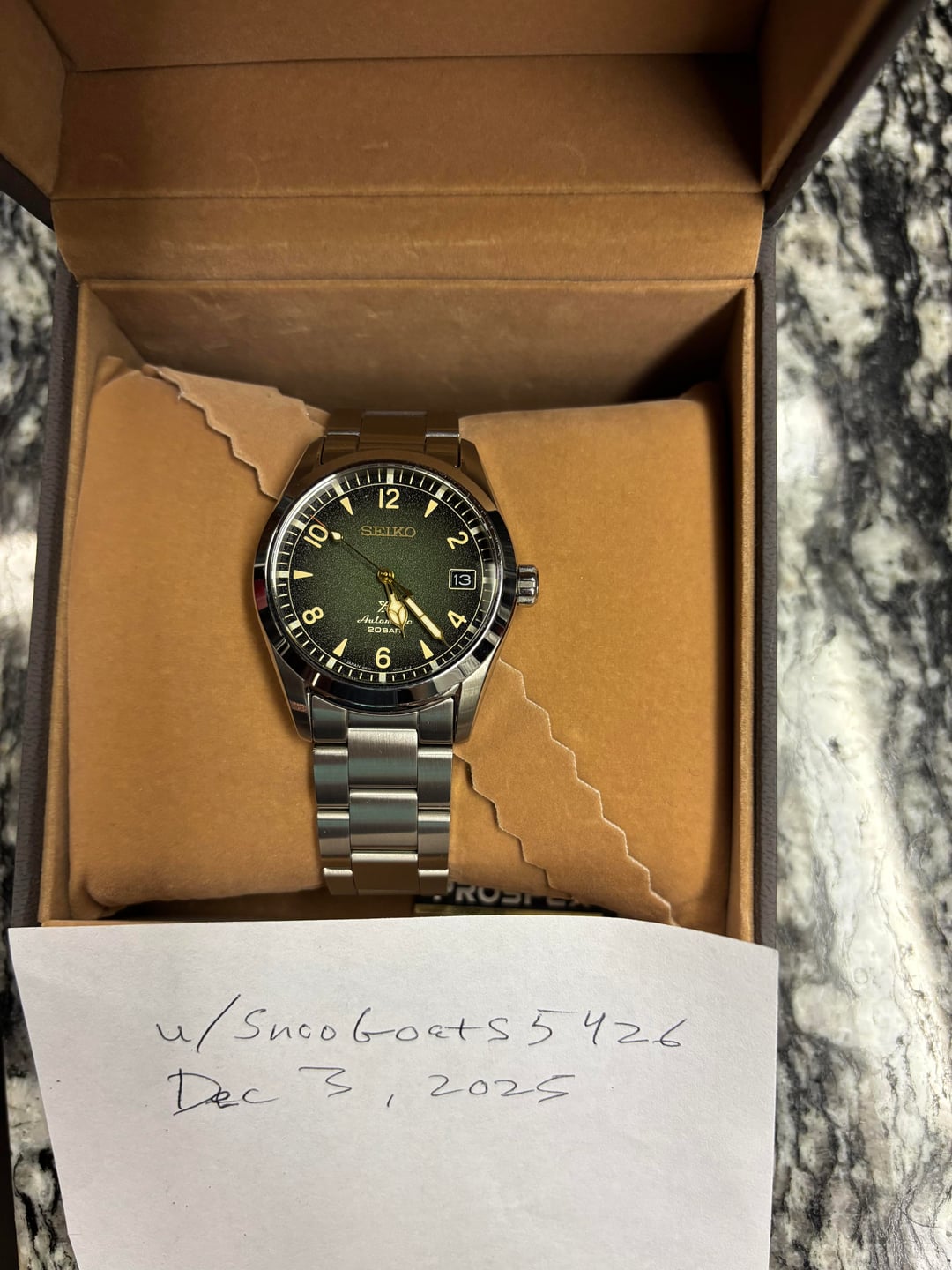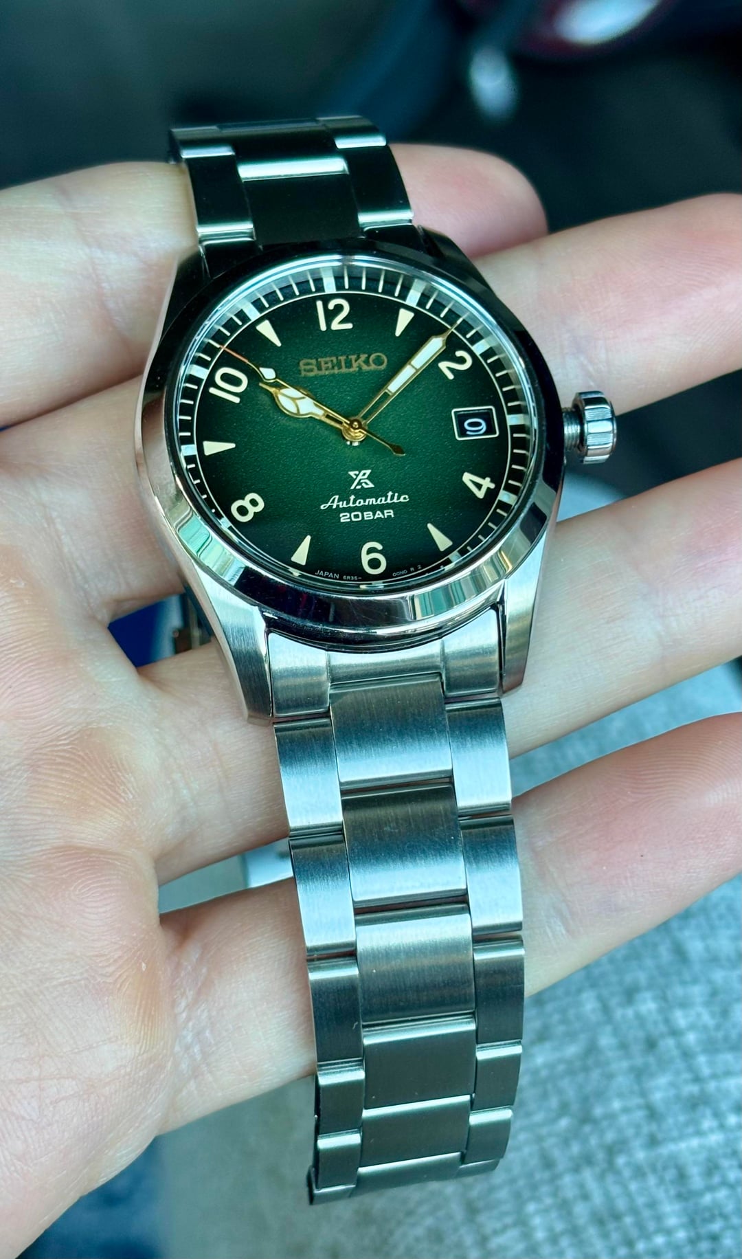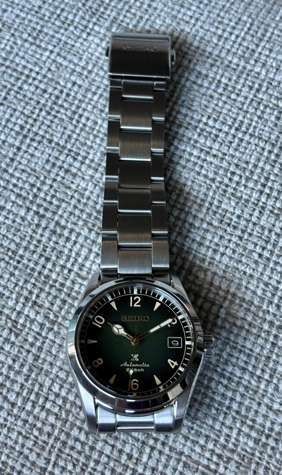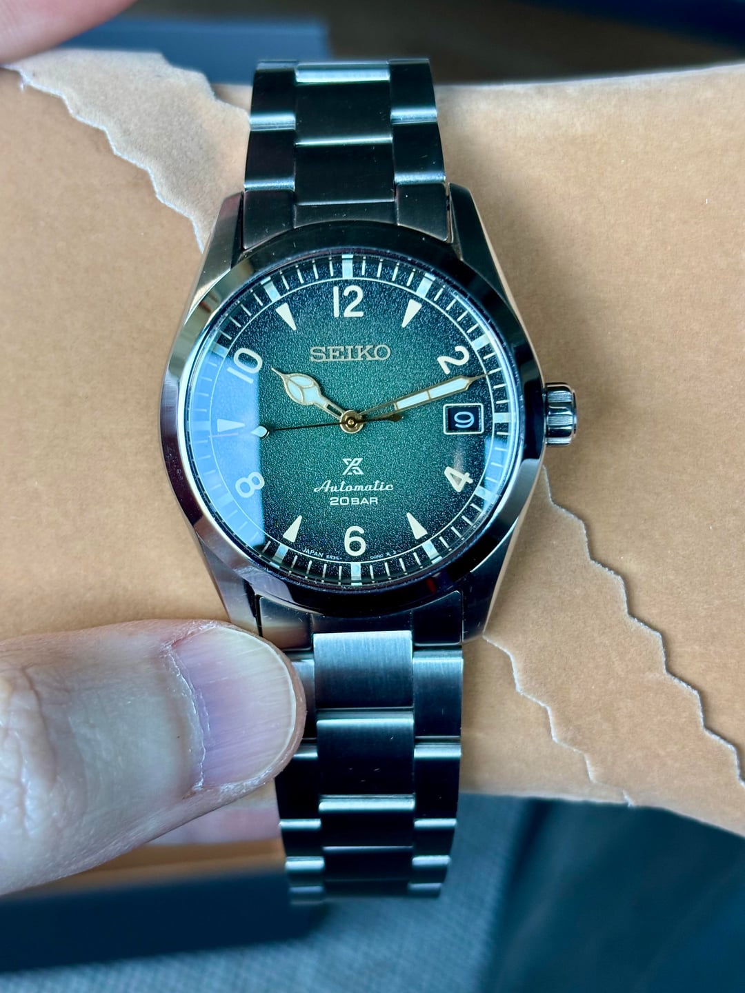 I’m letting go of my Seiko baby Alpinist 38mm. I’m letting it go because it doesn’t get wrist time and I want to consolidate my collection. Specs are as follows: Diameter: 38mm Thickness: 12.9mm Lug length: 46mm Lug width: 20mm Movement: automatic 6R35 with 70hr power reserve. Crystal: domed sapphire with inner anti-reflective coating. Water resistance: 200m Screw down crown Price: $450 shipped to you in CONUS. Payment: PayPal FF. Not looking for trades at this time.