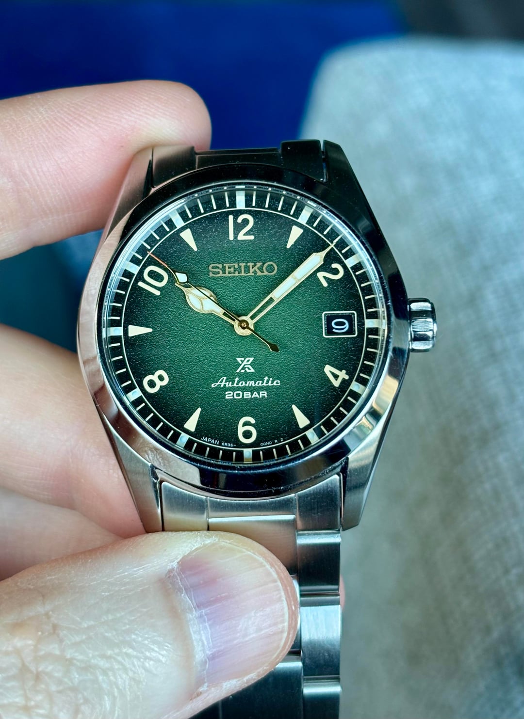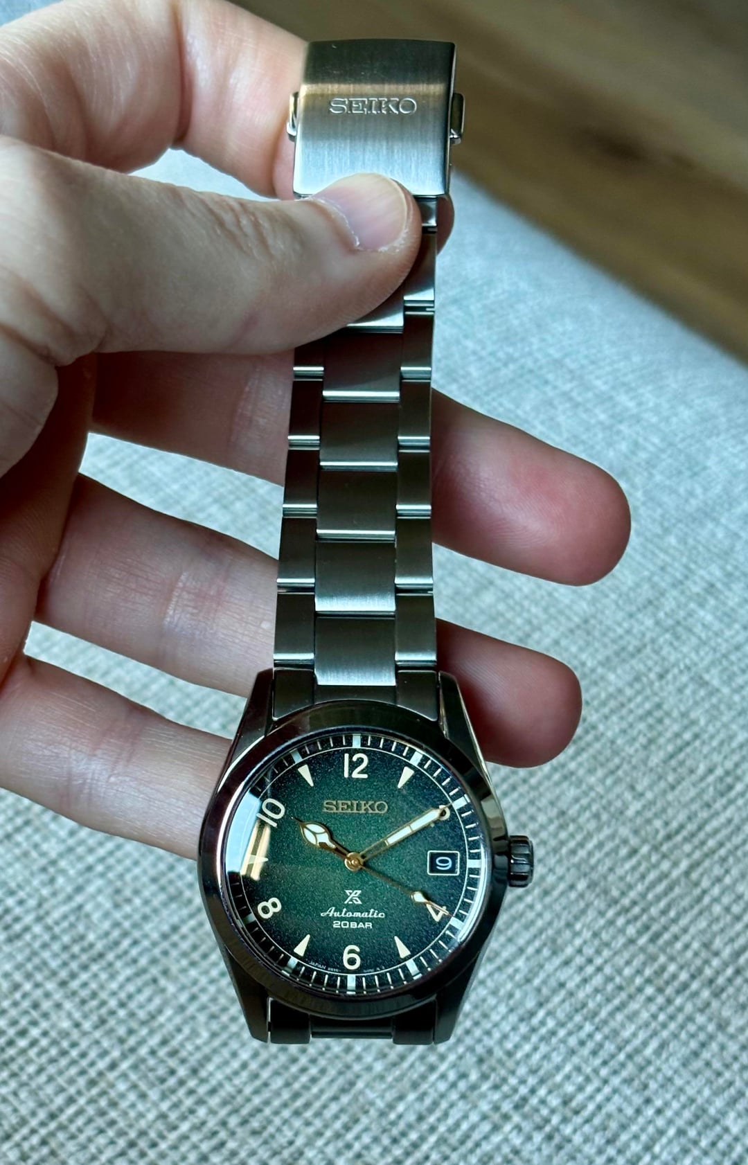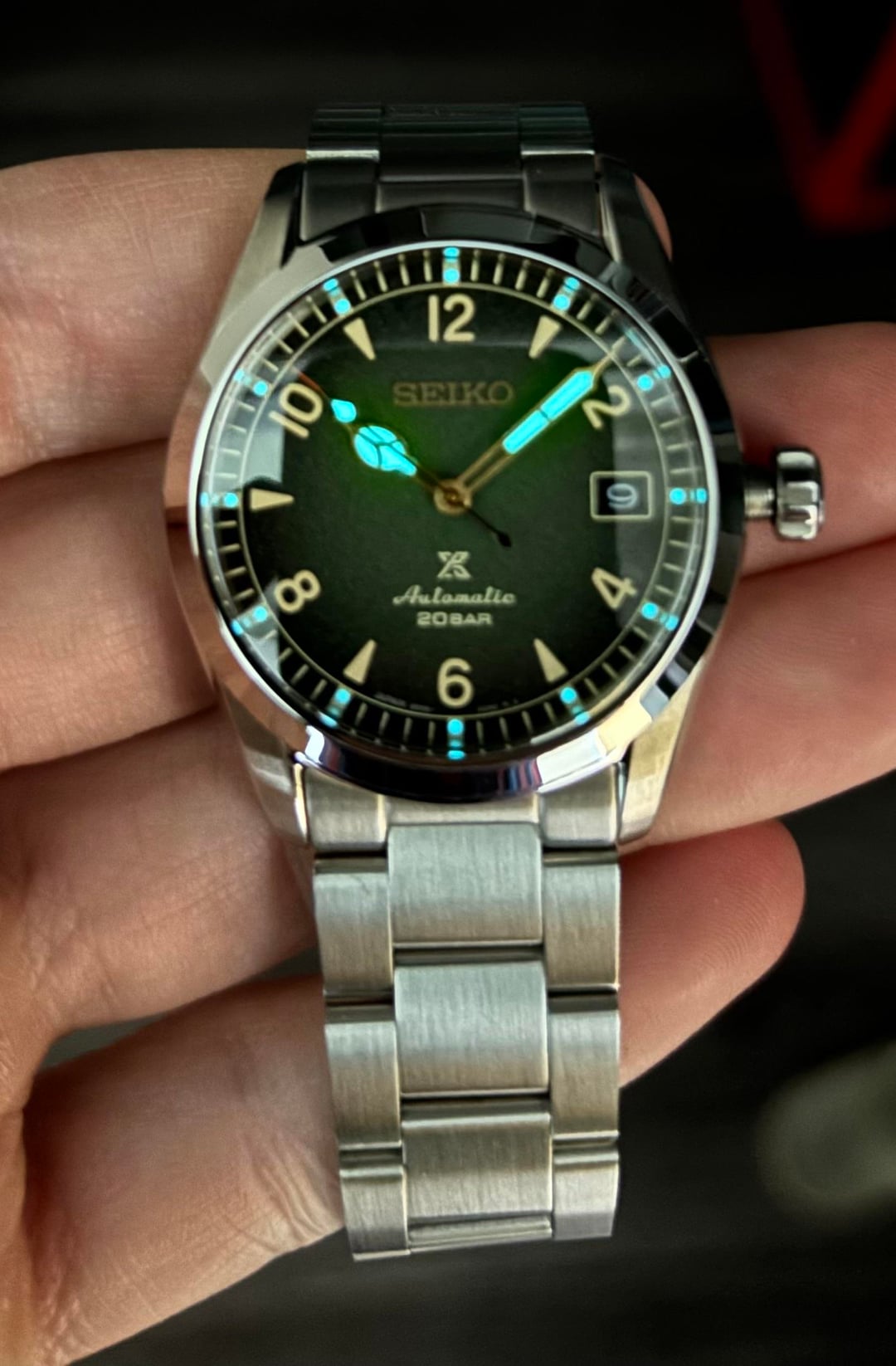 I’m letting go of my Seiko baby Alpinist 38mm. I’m letting it go because it doesn’t get wrist time and I want to consolidate my collection. Specs are as follows: Diameter: 38mm Thickness: 12.9mm Lug length: 46mm Lug width: 20mm Movement: automatic 6R35 with 70hr power reserve. Crystal: domed sapphire with inner anti-reflective coating. Water resistance: 200m Screw down crown Price: $450 shipped to you in CONUS. Payment: PayPal FF. Not looking for trades at this time.