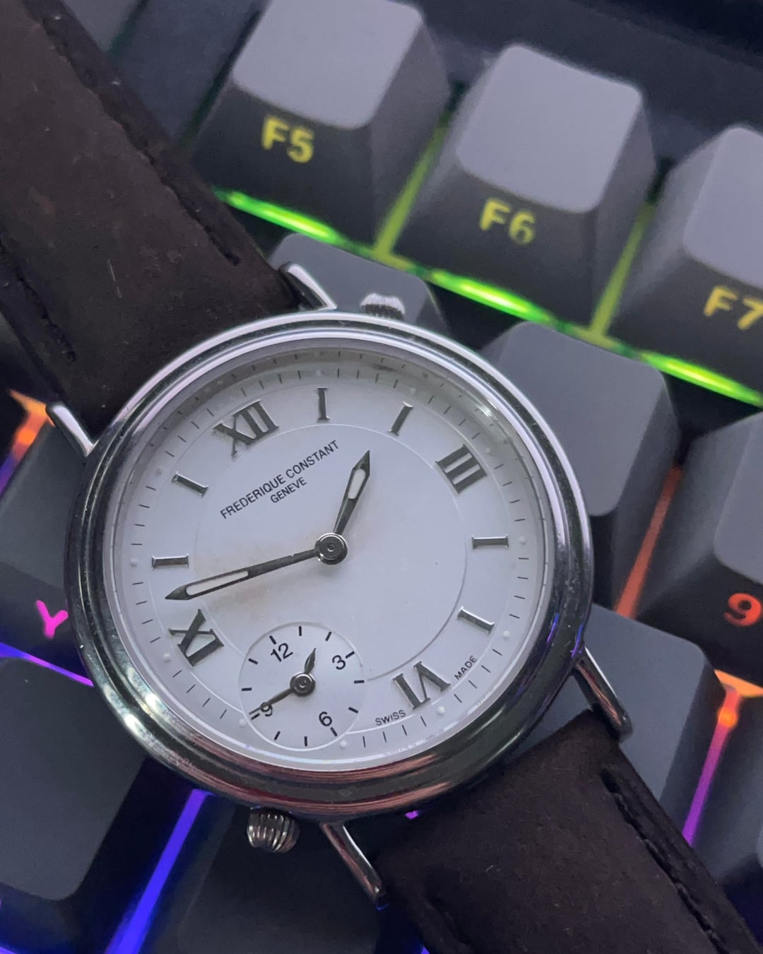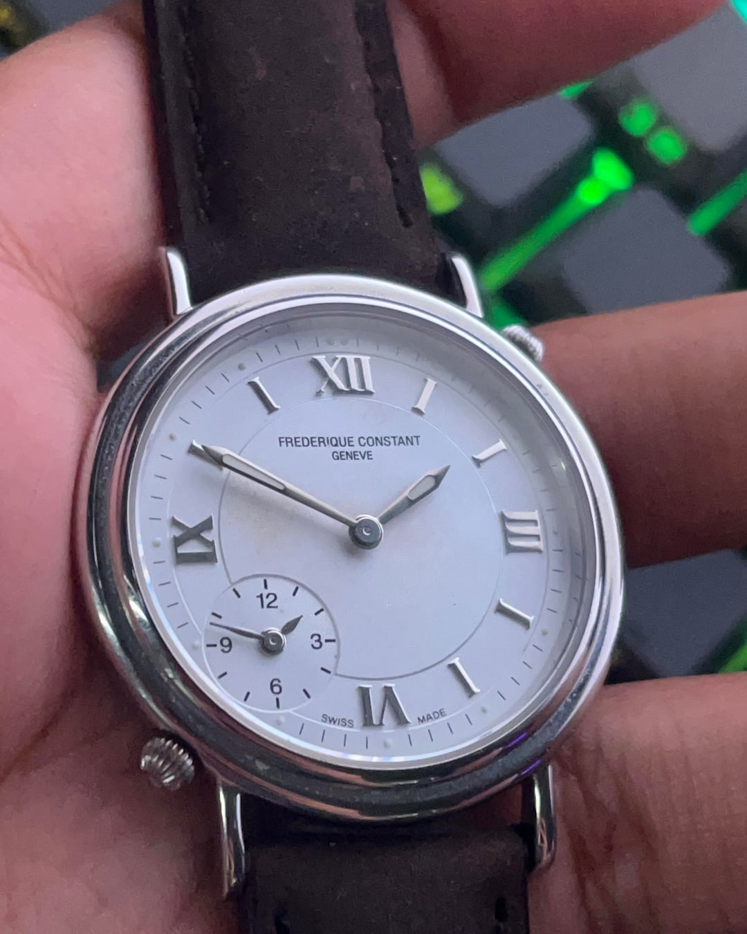 Good evening watchexchange. Imgur link w/ more pics/timestamp below. [https://imgur.com/gallery/frederique-constant-UoBtaWb](https://imgur.com/gallery/frederique-constant-UoBtaWb) Another watch straight from my personal collection. Grail of mine went on sale and I have to raise money for it. Pretty rare Frederique Constant. Uses two kinda tiny Ronda movements to power the watch!! Fresh batteries for both of the tiny movements. Watch is fully original except for the strap. Watch runs great. Weird damage (?) on the dial. Watch otherwise is in good condition. Watch is 35.5mm x 42mm x 11mm. 18mm lug to lug. Looking for 265 USD Shipping to CONUS included. I'm fine with Paypal GS, although buyer pays fees.