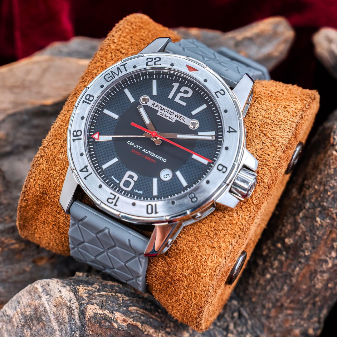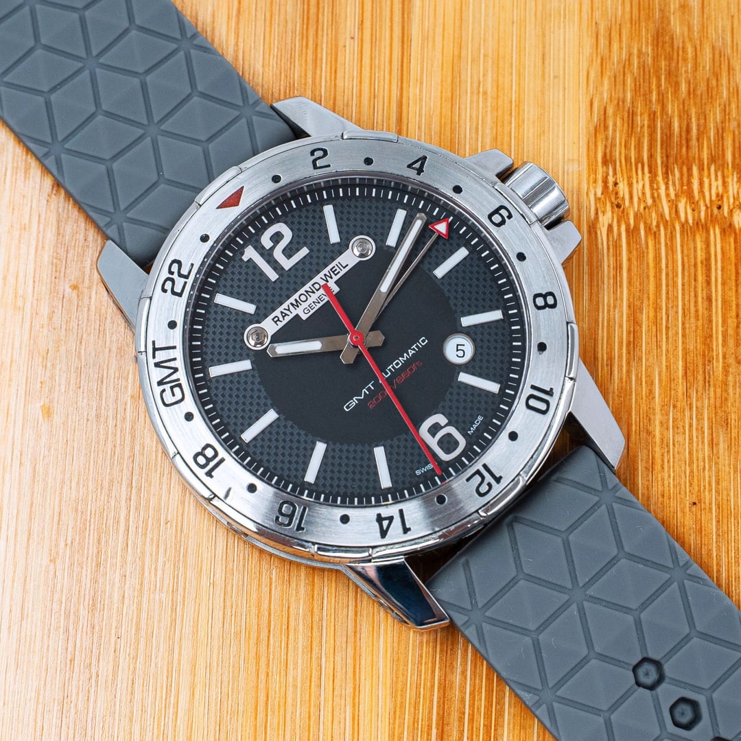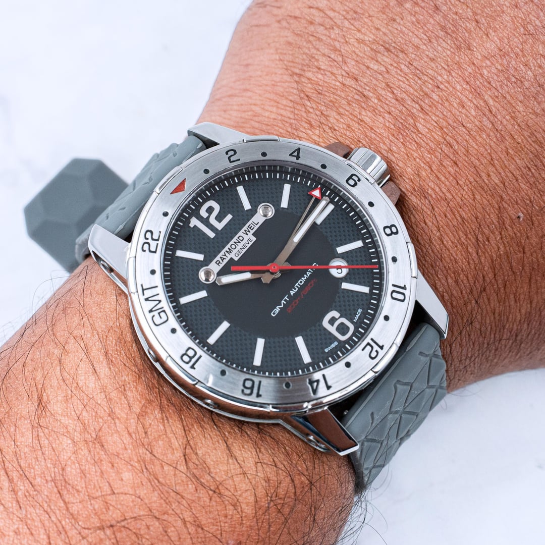 A Raymond Weil GMT Automatic diver watch with a stunning textured Black dial in great condition. The red color on second hand matches with gmt hand, bezel pip and text on dial. Creative design, makes it a conversation piece. Robust unique shaped case. Very solid build quality. The build quality is very high end overall. Signed crown. Sapphire crystal. Date function. Amazing condition, ready to be used as a daily driver. Movement has been serviced. Great time keeping. Comes with an aftermarket grey textured rubber strap, unsigned buckle. Pairs well with the watch. There’s a tiny scratch on left side of the bezel before “18” as seen on picture. This model is seldom seen and a great collectible. Only Watch. Overall a great piece at a good price. PRICE: $499 USD via Paypal, Wise, Crypto. FREE 5 day DHL shipping worldwide. I have a good number of exchanges here for a safe transaction. Check my Instagram: [https://instagram.com/hour.lust](https://instagram.com/hour.lust) * Reference Number: 3800-ST-05207 * Case size: 44 mm (without crown) * Lug to lug: 53 mm * Thickness: 13 mm * Lug width: 22 mm * Movement: Automatic Pics: [https://imgur.com/a/wu4Nn33](https://imgur.com/a/wu4Nn33) TS: [https://imgur.com/a/Wadnnfa](https://imgur.com/a/Wadnnfa)