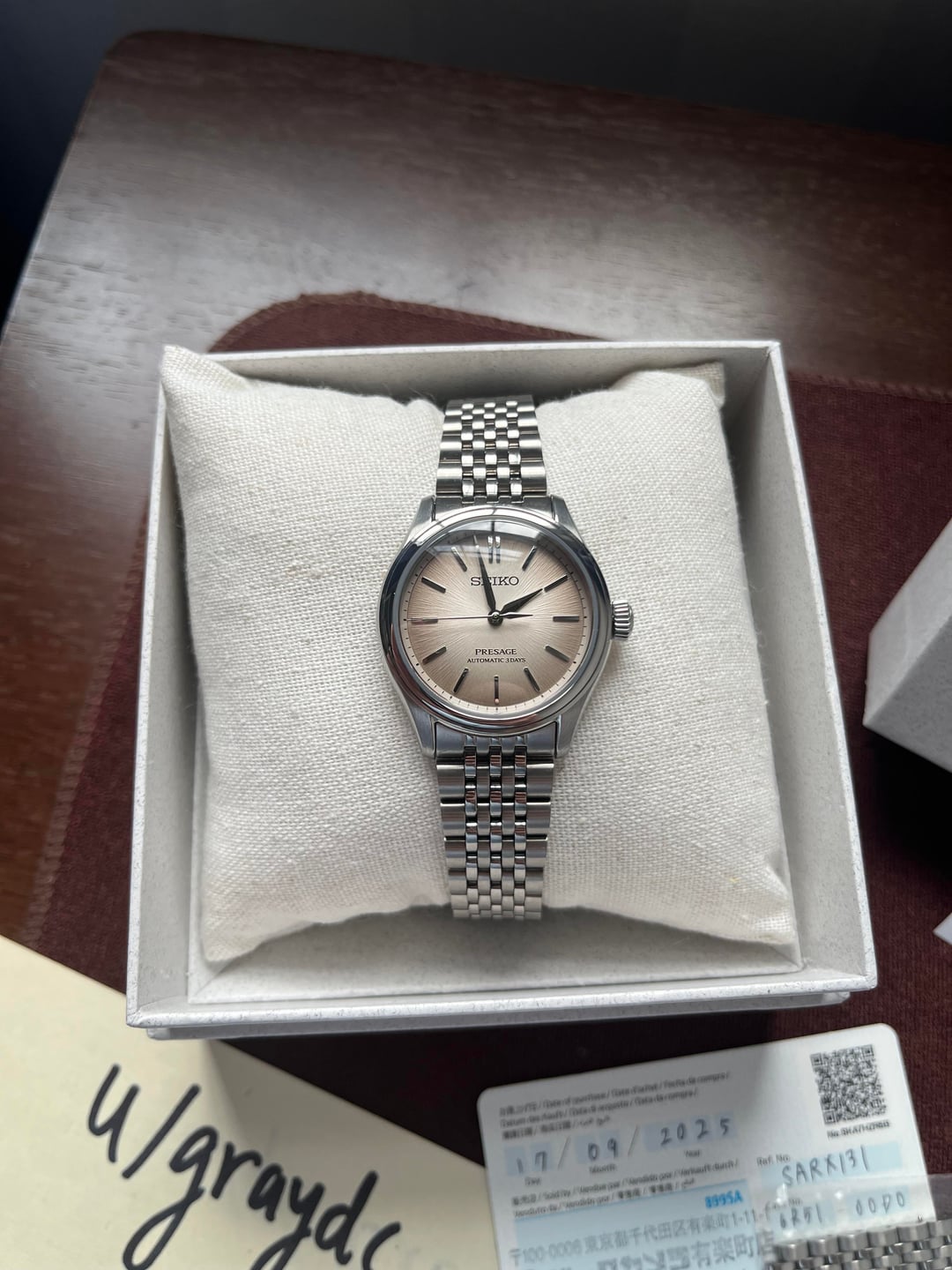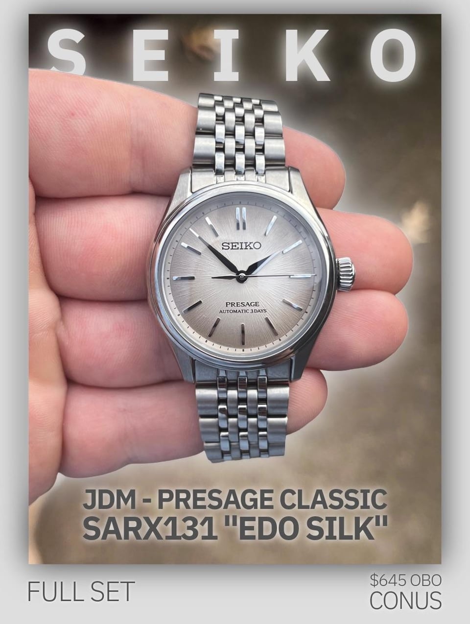 Seiko Presage Classic “Edo Silk” Excellent Pre-Owned Condition (I believe this is one of only a few listed for sale under MSRP) JDM REF. SARX131 (shown on card) INTL. REF. SPB523 FULL SET + SIGNED WARRANTY CARD • Diameter: 36.0 mm • Lug to lug: 41.4 mm • Lug width: 18 mm • Case material: Stainless steel • Movement: Seiko automatic Cal. 6R51 (manual wind, hacking) • Jewels: 24 • Frequency: 21,600 vph (3 Hz) • Power reserve: ~72 hours • Water resistance: 100 m • Crystal: Dual-curved sapphire with anti-reflective coating Asking $645 CONUS OBO Shipped Intl. shipping is available, PM to discuss price