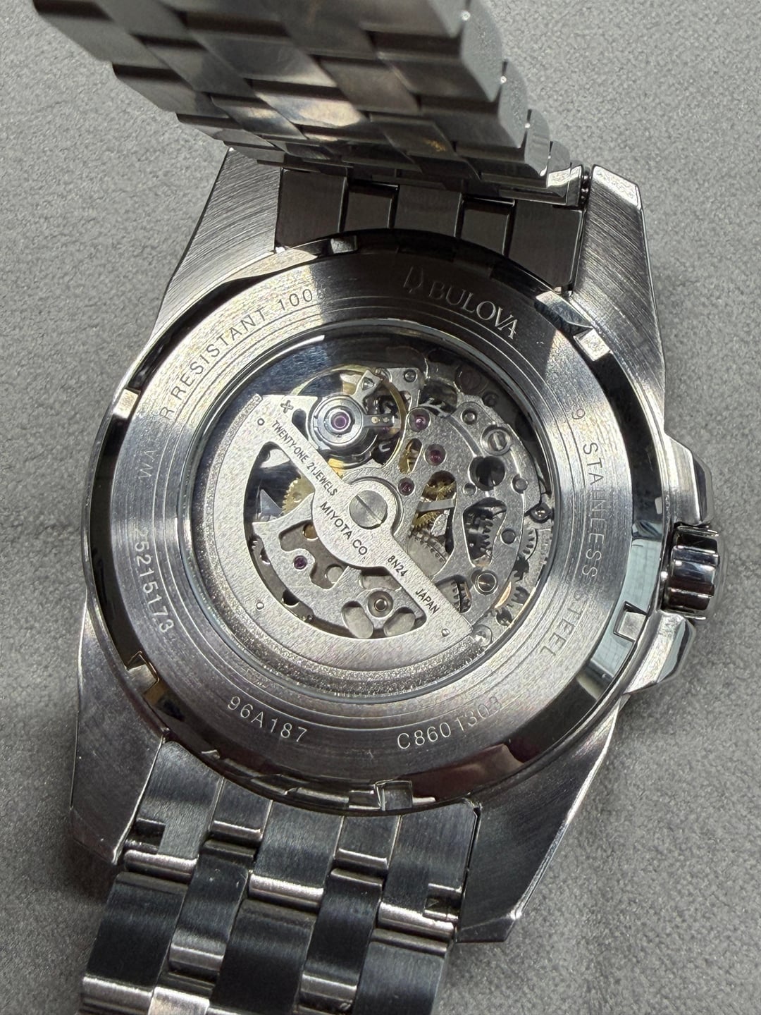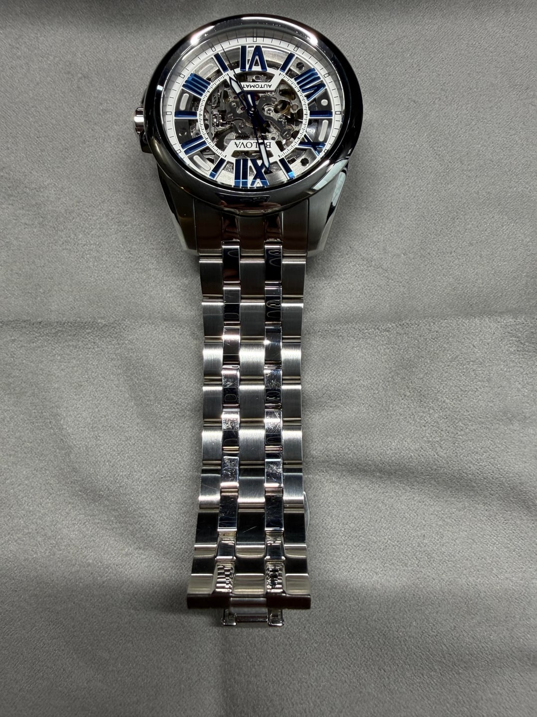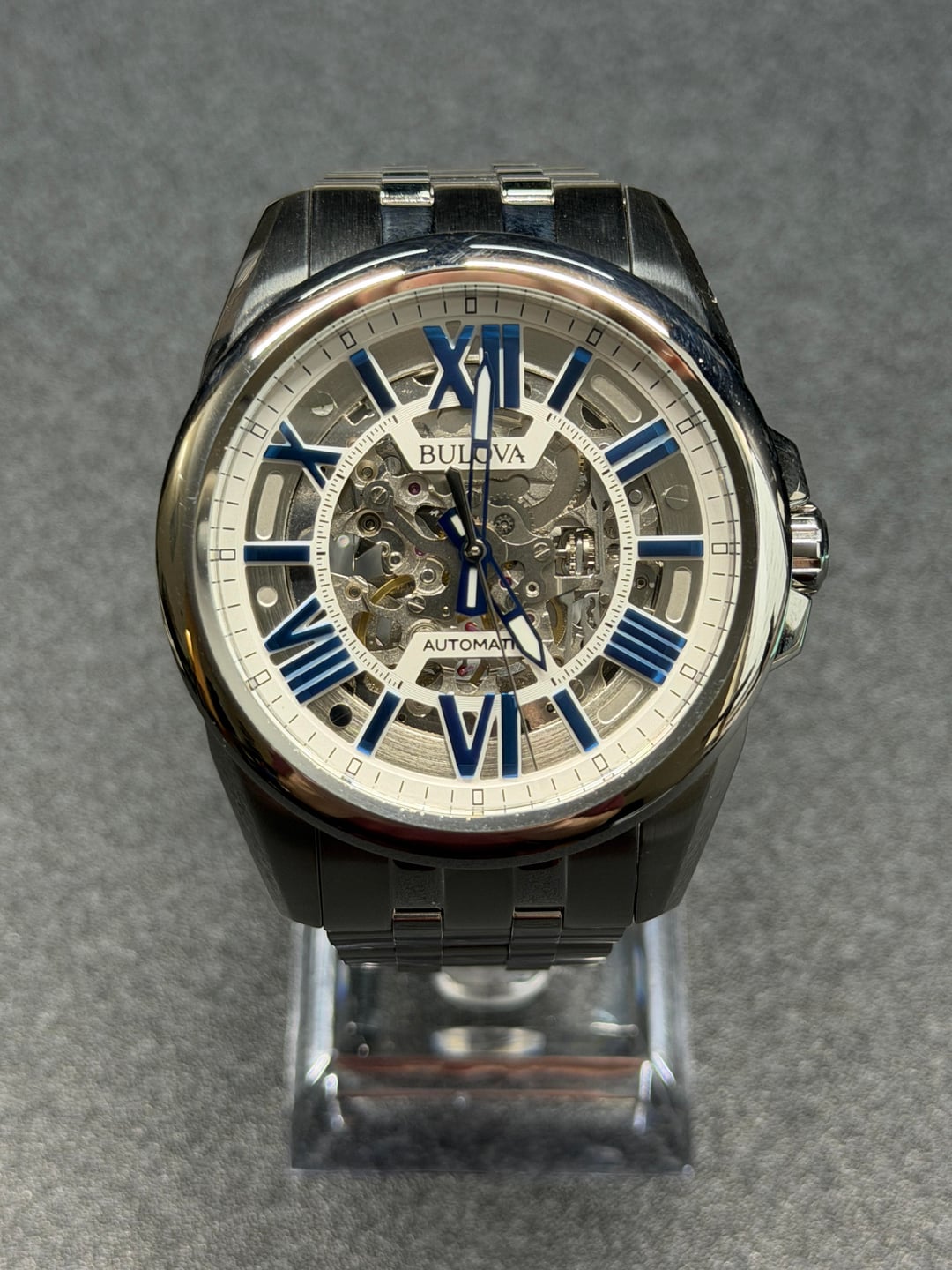 Hey folks Amazing looking skeleton from Bulova with classic blue roman numeral markers, great shade of blue btw. I am not the original owner. There are some marks on case and hairlines on bracelet but overall looks great - see pics. Glass is clear of any marks as far as I can see. $225 shipped conus PayPal F&F or Zelle. I have 60 positive transactions on watchexchange with good feedback so please read them. Also have an eBay store with hundreds of sales and hundreds of positive feedback so read them as well (offtherakcollectibles) Sale only, no trades. Ships from NYC so if you're in area can meet up locally. Please leave a comment here so I can view your transaction history and then message me if you're interested. Thank you! \---------- \* It features a 43mm stainless steel case and a matching stainless steel bracelet. \* The silver-tone skeleton dial showcases the automatic movement within, with contrasting blue Roman numeral indices and hands. \* The watch is powered by a self-winding mechanical movement and never requires a battery. \* It has a flat mineral crystal and an exhibition case back to view the movement. \* Water-resistant to 100 meters (330 feet), it is suitable for swimming and snorkeling.