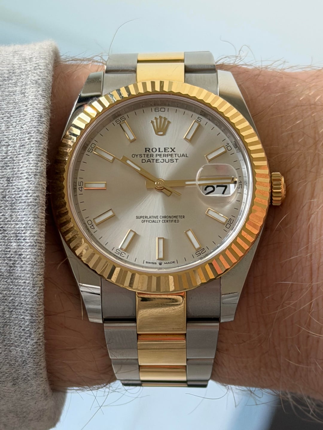 2022 Rolex Datejust 41 126333 Silver dial. Fluted bezel. Oyster bracelet Two-tone 18k yellow gold. Box & papers. -1 link **$12999** / Zelle, Venmo, or WU accepted. Timestamp: https://imgur.com/a/VEdgBNf I have tons of references on multiple platforms including WatchExchange. I am more than happy to show these.