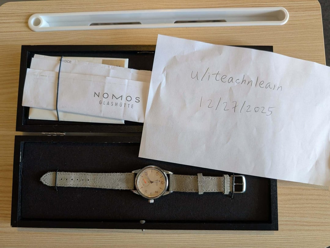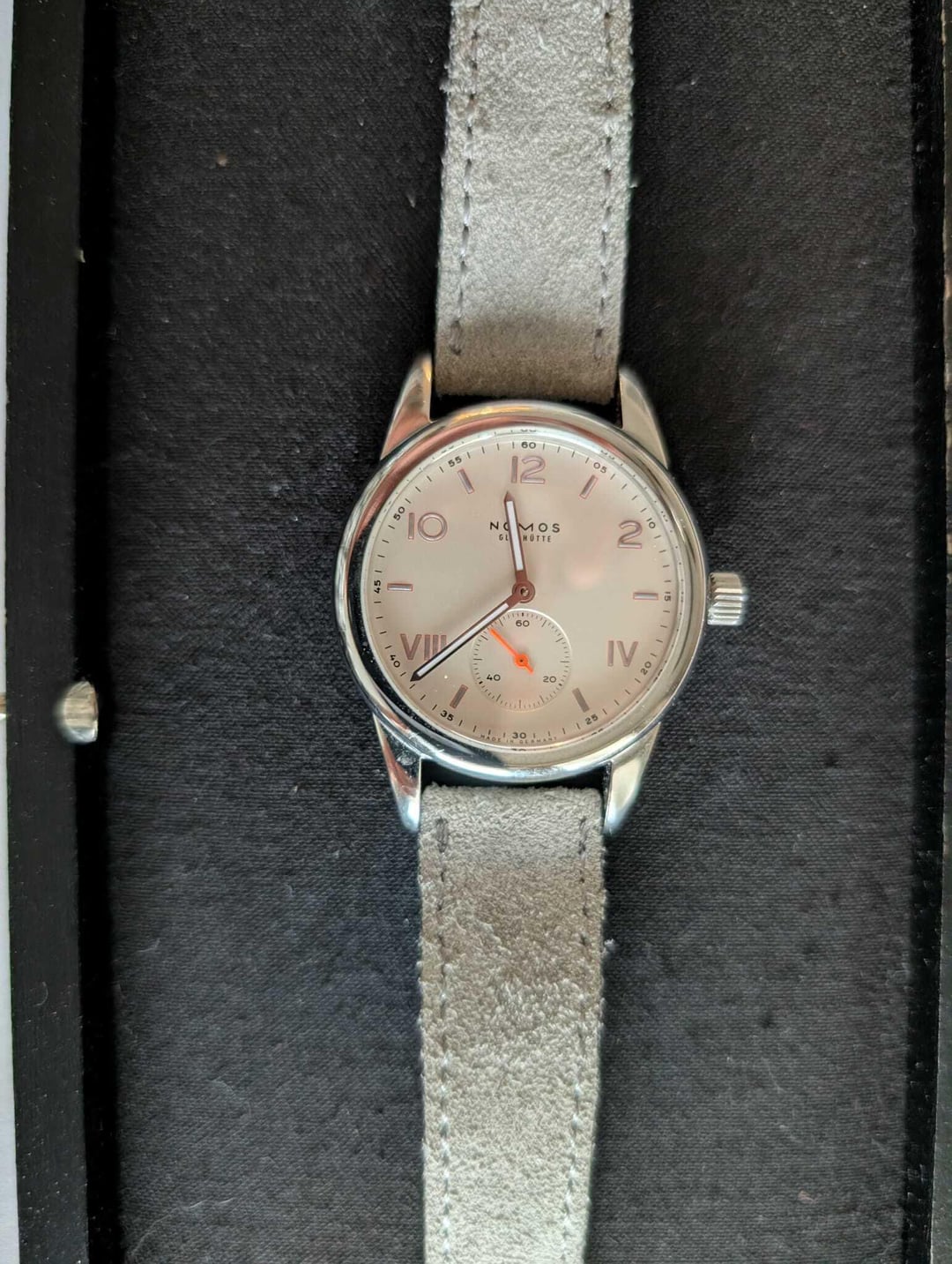 This is an absolutely beautiful watch. I wore it occasionally but have come to the realization that this kind of watch (manual, minimalistic) is just not for me. Comes with Box and Papers Asking $999 OBO includes shipping to CONUS Zelle/Venmo/Paypal From Nomos website: Ref. 708 Case stainless steel, screwed stainless steel back Glass domed sapphire crystal glass Winding manual Dimensions diameter 36.0 mm height 8.2 mm lug-to-lug 47.5 mm Water resistance 10 atm (suitable for swimming) Dial galvanized, white silver-plated Hands rhodium-plated, with superluminova inlay in white (blue luminescence), seconds hand neon orange Strap Vegan velour remborde velvet gray lug width 18 mm