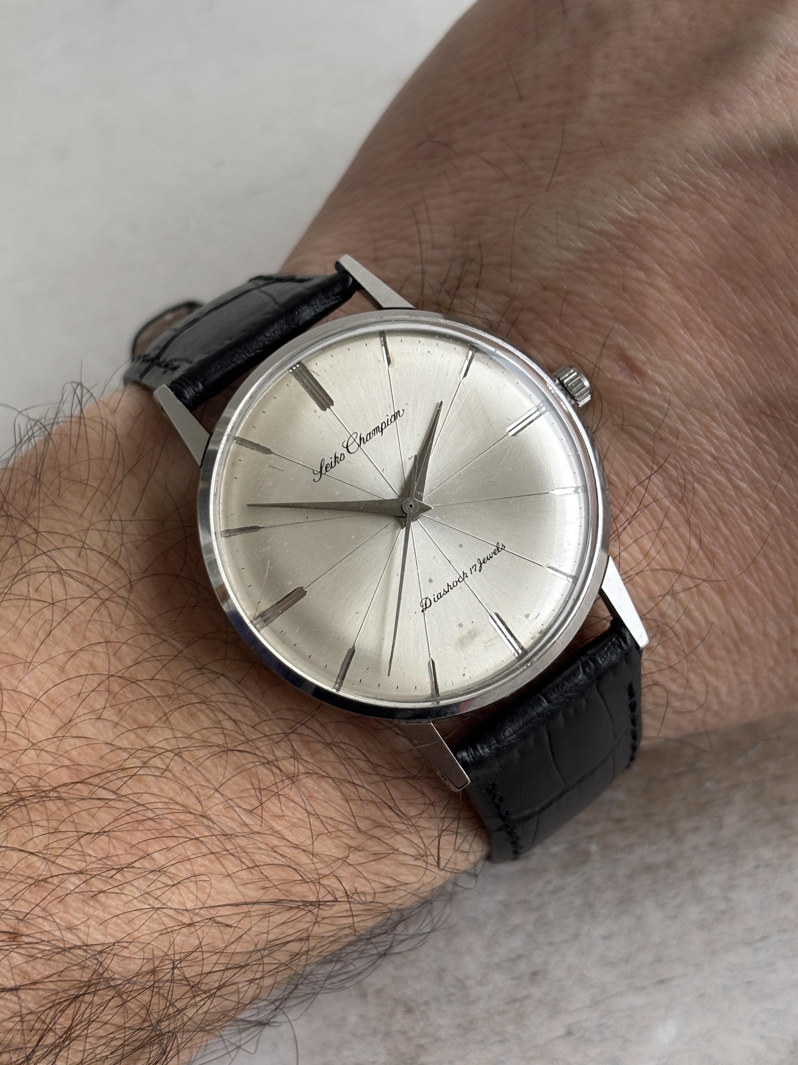 Very rare Seiko Champion J15004E. Manufactured in 1960’s. Recently inspected by a watchmaker, no need for service. Everything works as it should. New leather strap. Case size: 36mm Thickness: 9mm Lug to lug: 44mm Lug width: 19mm Asking 345 USD shipped. Payment via Wise or PayPal F&F. No trades, please. Album: https://imgur.com/a/8wYiQQj Timestamp: https://imgur.com/a/KBmH9H1 Thanks for looking and have a nice day.