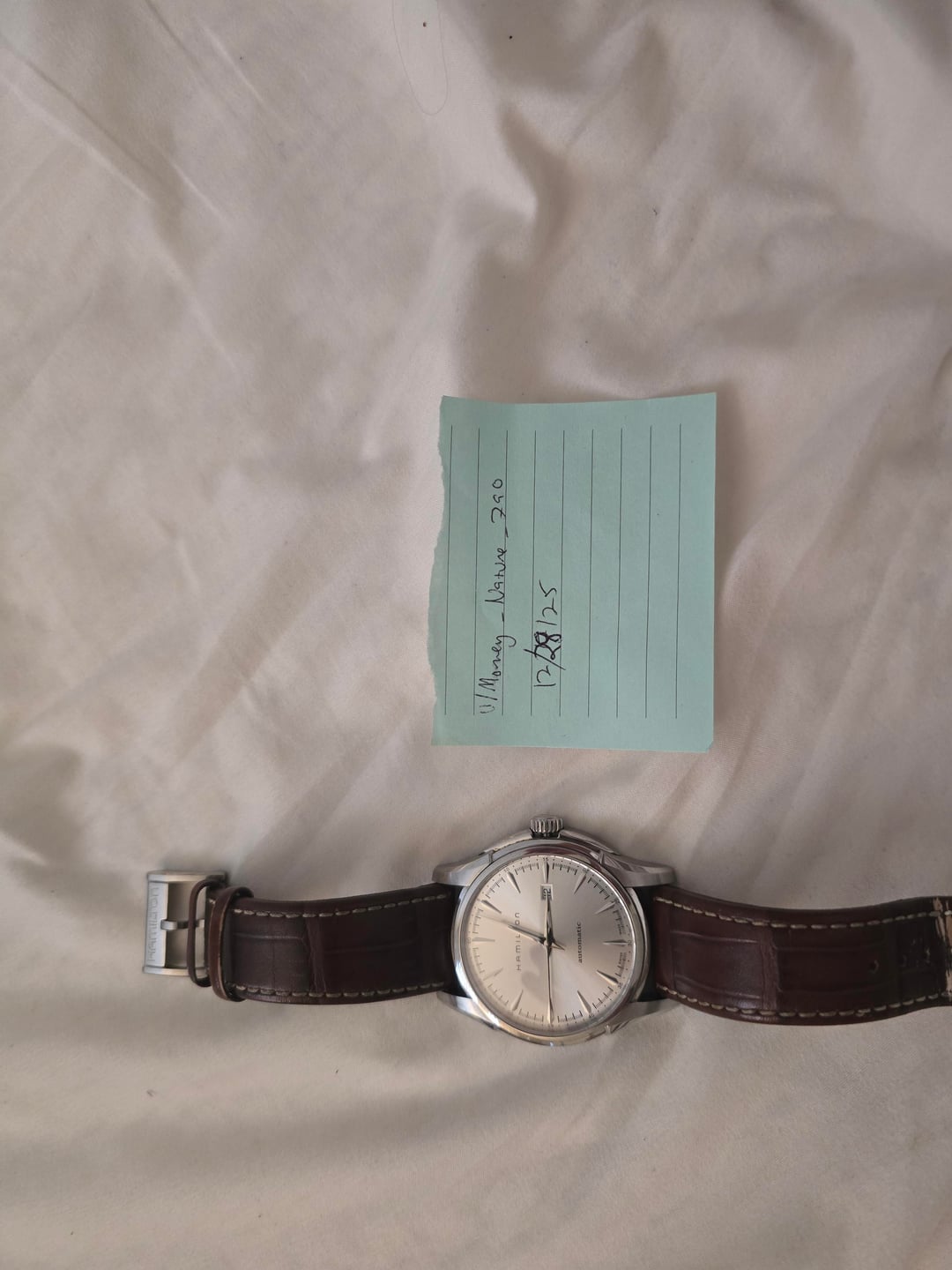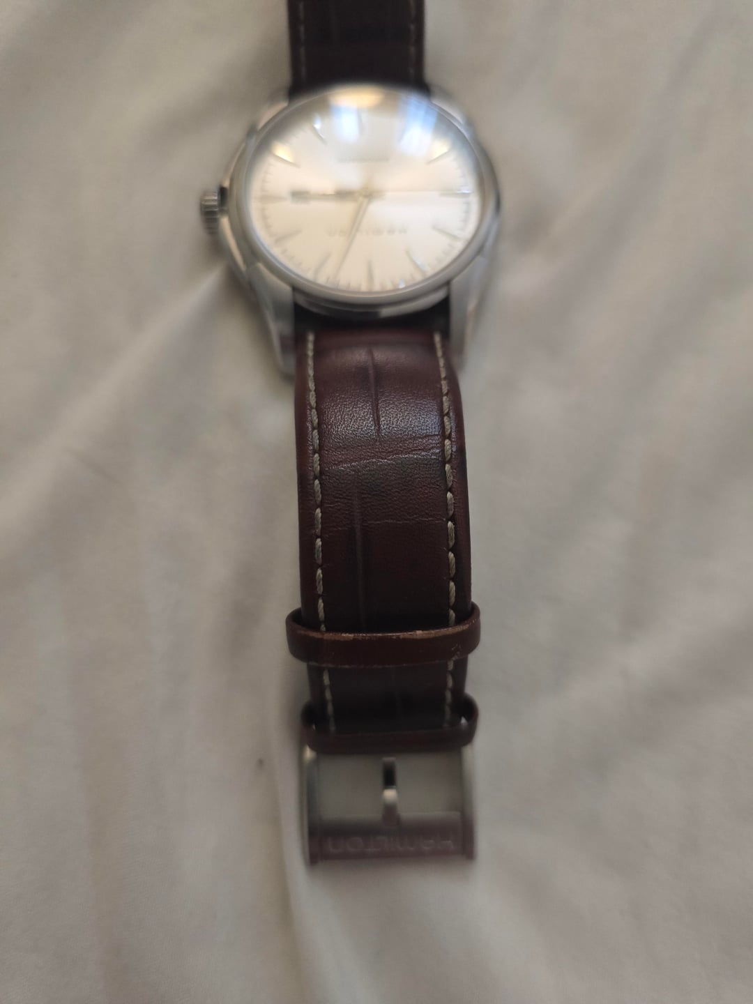 For Sale Hamilton Jazzmaster Viewmatic Auto Ref: H327150 Putting up my Hamilton Jazzmaster for sale. Perfect watch to toe the balance between smart casual and dressy, with 100m of water resistance and lumed hands and indices for that GADA feel. This is the older model with the ETA 2824 movement, getting harder and harder to find, no Powermatic w/plastic components here! Definitely a one watch collection in of itself, or a great complement to other pieces. Specs: Case Size: 43.5mm, 11.8 mm thick Water Resistance: 100m Movement: ETA 2824-2 4Hz automatic w/date Band: Brown genuine leather OEM band with original pinbuckle Hamilton clasp. Band shows some normal wear (see pics), still plenty of life yet. Condition: Excellent used condition. No obvious marks or scratches, never been polished. Movement running great within 15 seconds per day in 4 positions with 290 amplitude and 0.3ms beat error, happy to throw it on a timegrapher on a video call! Crystal: Gently domed sapphire crystal Crown: Signed push-pull w/hand winding Asking 510$ negotiable shipped in CONUS and insured. Happy to do video call or whatever needed. Paypal FF or Venmo preferred, but open to G&S for established buyers. Timestamp in pics.