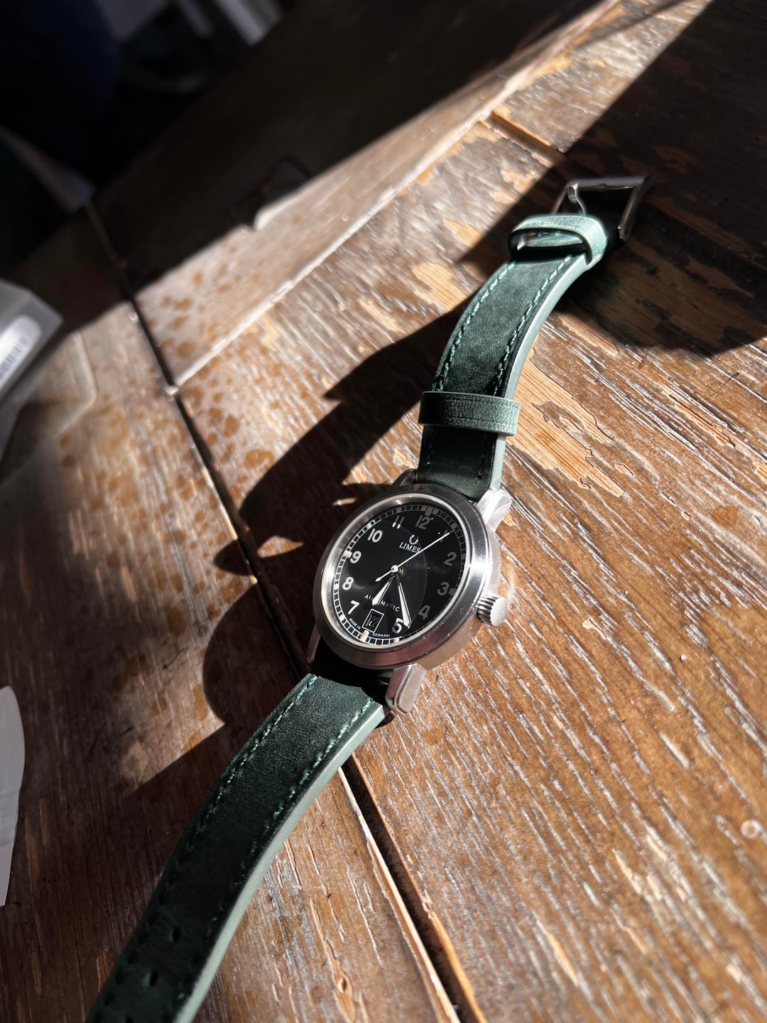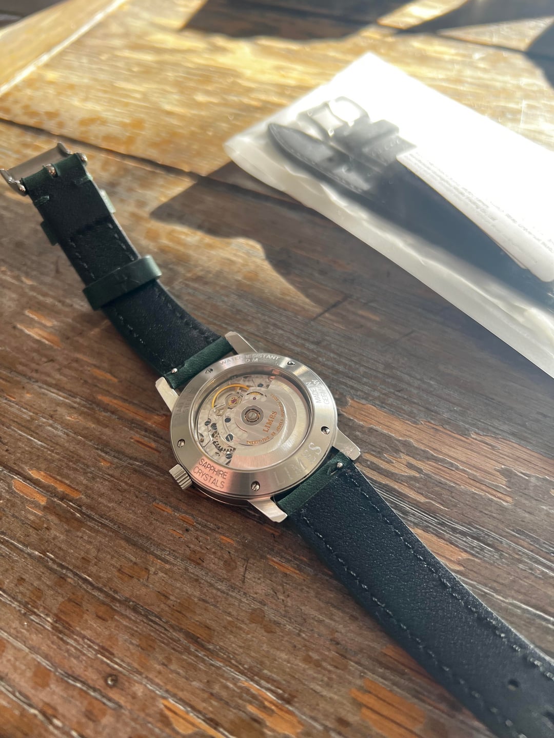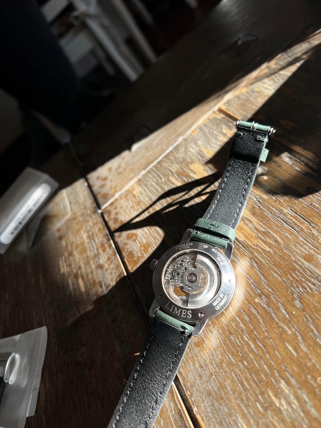 Up for sale is my Limes Principio 38mm, a beautifully built Made in Germany piece with a clean, legible dial and a reliable Swiss automatic movement visible through the display caseback. Super wearable size, great proportions, and classic tool-watch charm. Watch is gently used with normal wear from light use. Everything runs well and functions as it should. Includes: • Watch on green leather strap • Additional brand-new black strap (unopened) Price: $405 — slightly negotiable (before shipping) Payment: PayPal F&F preferred; PayPal G&S accepted if buyer covers fees; Venmo also accepted Shipping: Additional — USPS Priority Flat Rate (tracking included; insurance optional at buyer’s cost) Location: CONUS- North Carolina Trades: No trades Happy to send additional pictures or video if needed. Thanks for looking!