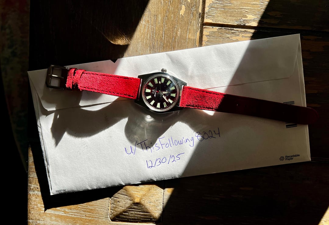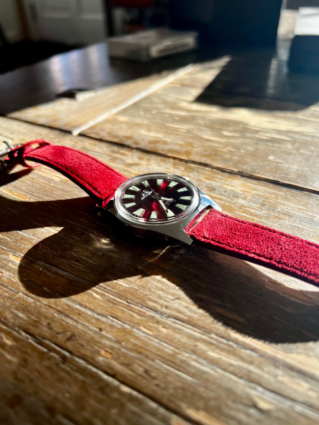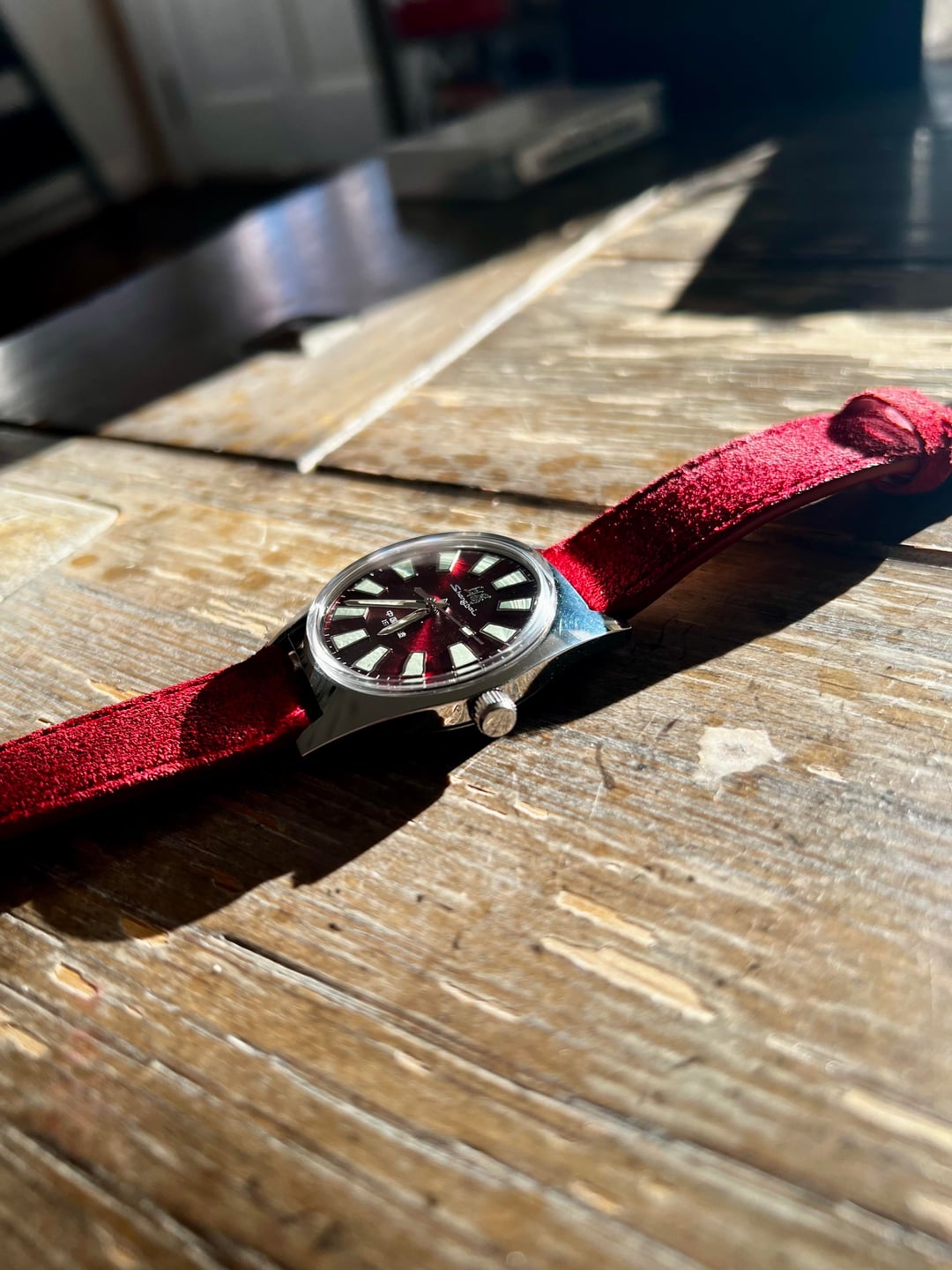 Letting go of this fun and affordable Shanghai manual-wind with a striking wine red dial and bold vintage-style markers. A cool budget-friendly mechanical piece with a ton of character and retro charm. Watch is used but in good wearable condition for what it is. Winds and runs, keeps reasonable vintage time. Comes on the red suede strap shown. Details: • Manual-wind Shanghai movement • Wine red dial with bold markers • Stainless case • On red suede strap shown Price: $30 + $5 shipping (USPS) Payment: PayPal F&F preferred; PayPal G&S accepted if buyer covers fees; Venmo also accepted Shipping: USPS (tracking included) Location: CONUS- North Carolina Trades: No trades Happy to send more pics or a video if needed. Thanks for looking!
