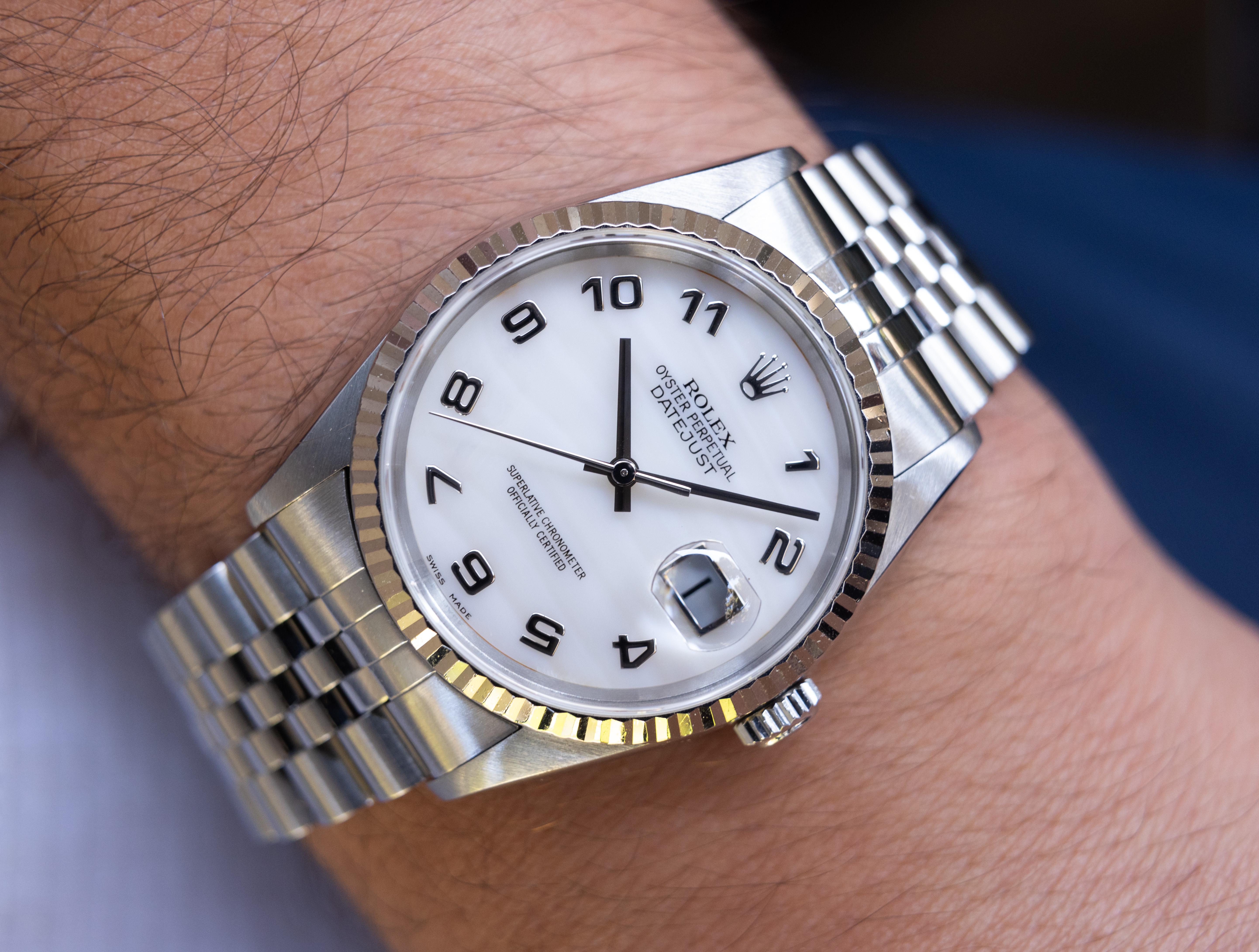 | Rolex Datejust Mens Stainless Steel 18K White Gold Jubilee White No Holes 16234 beckertime (23962) |