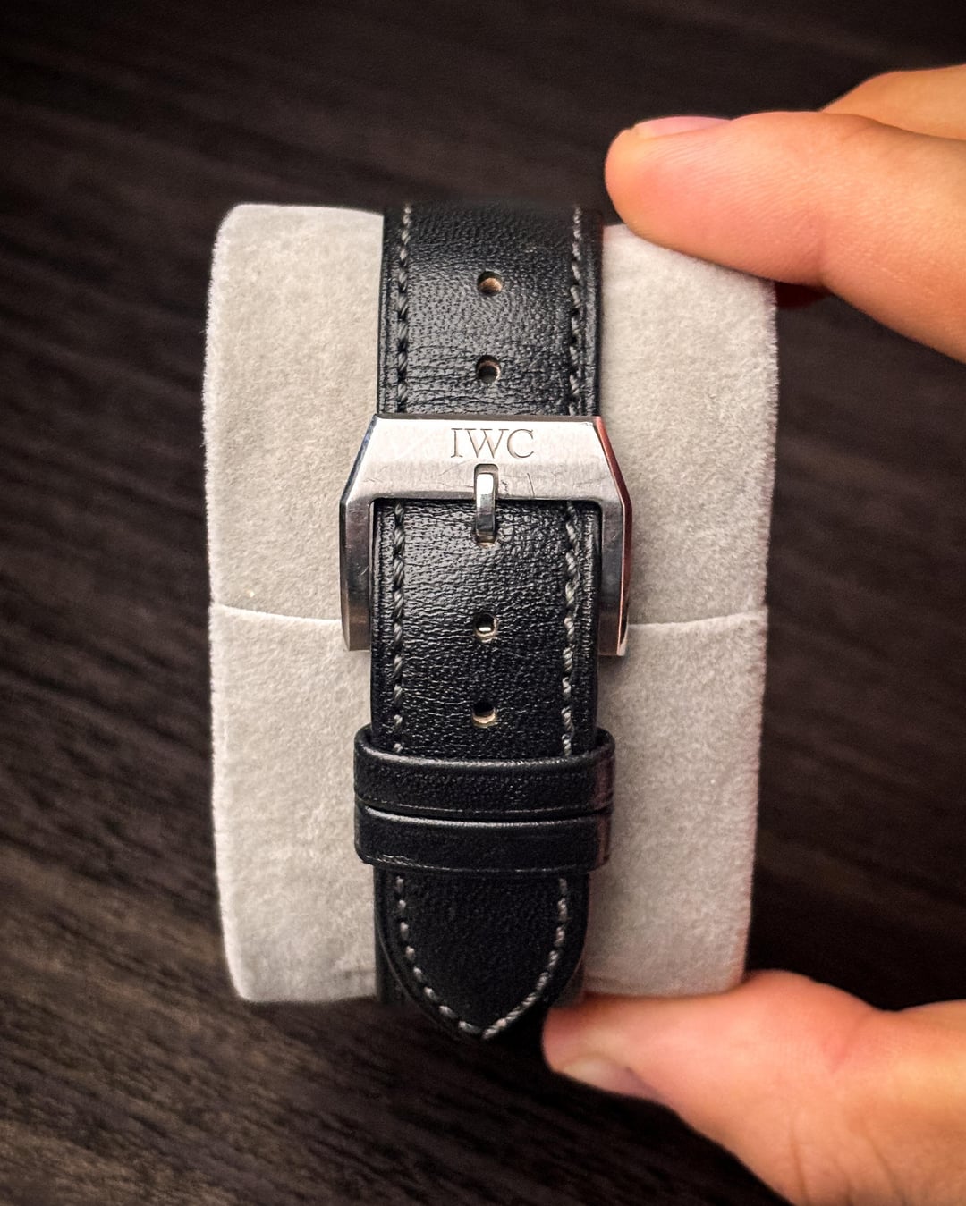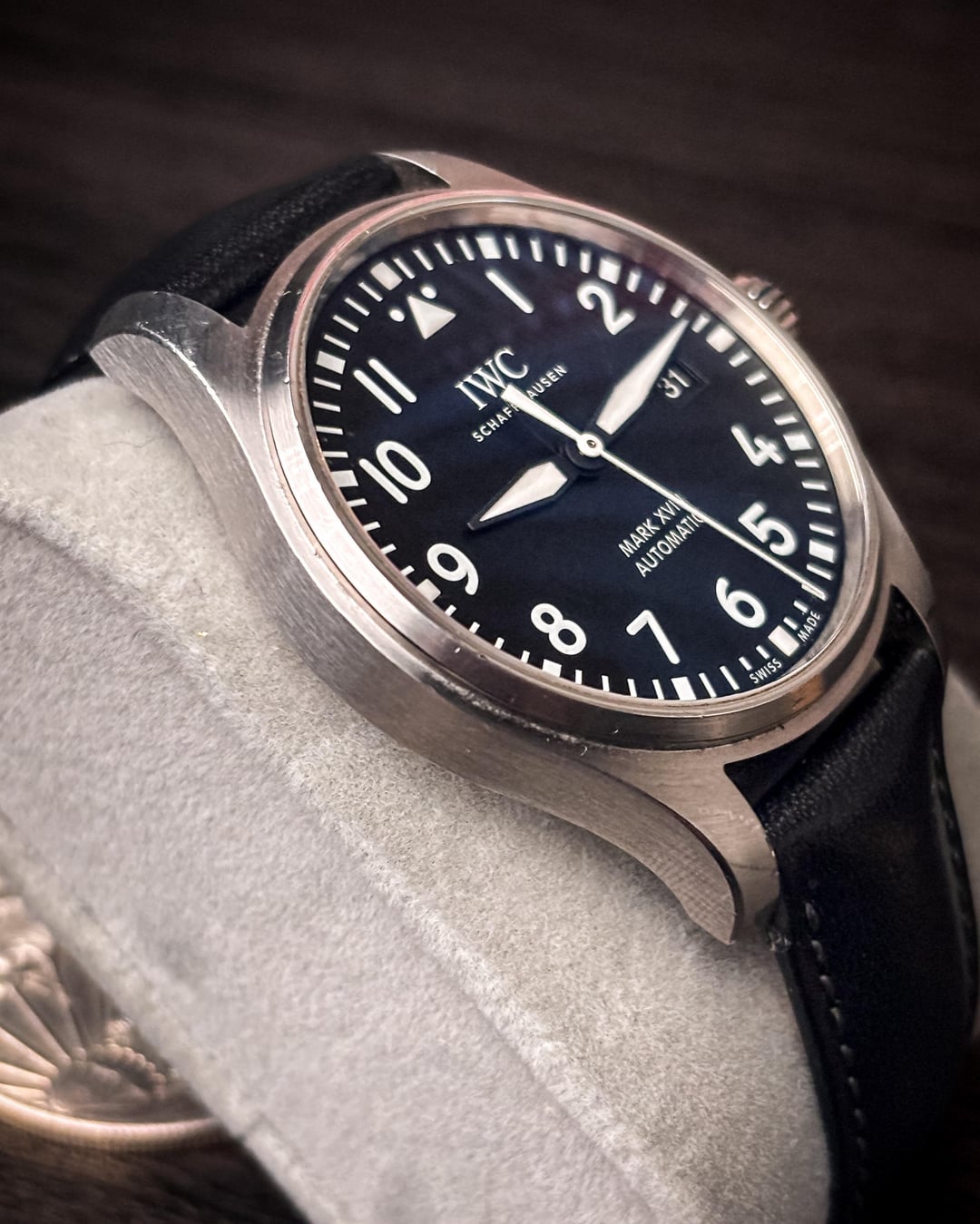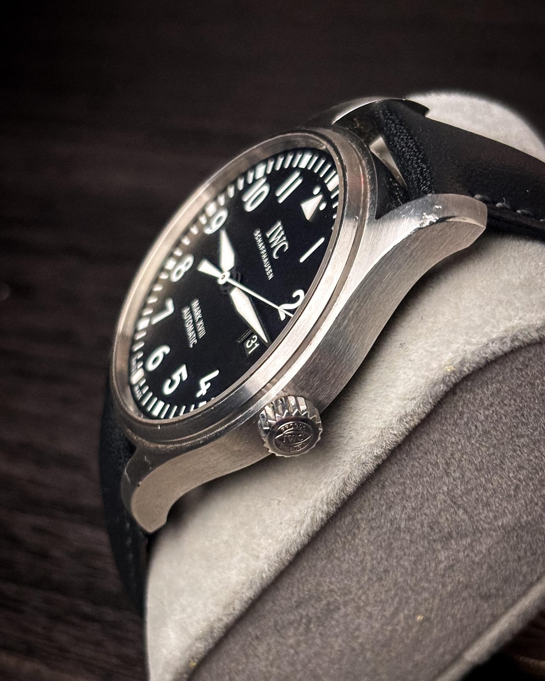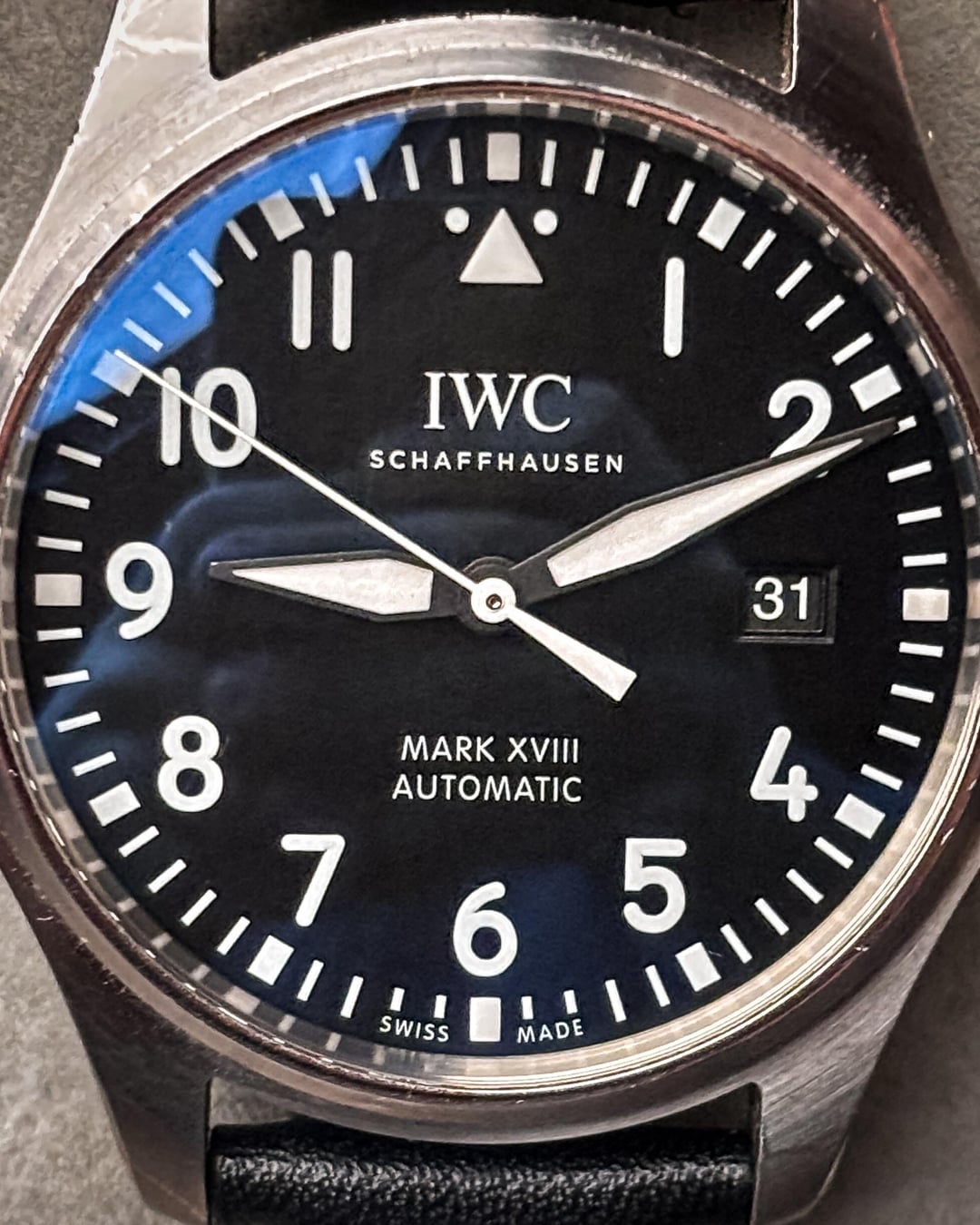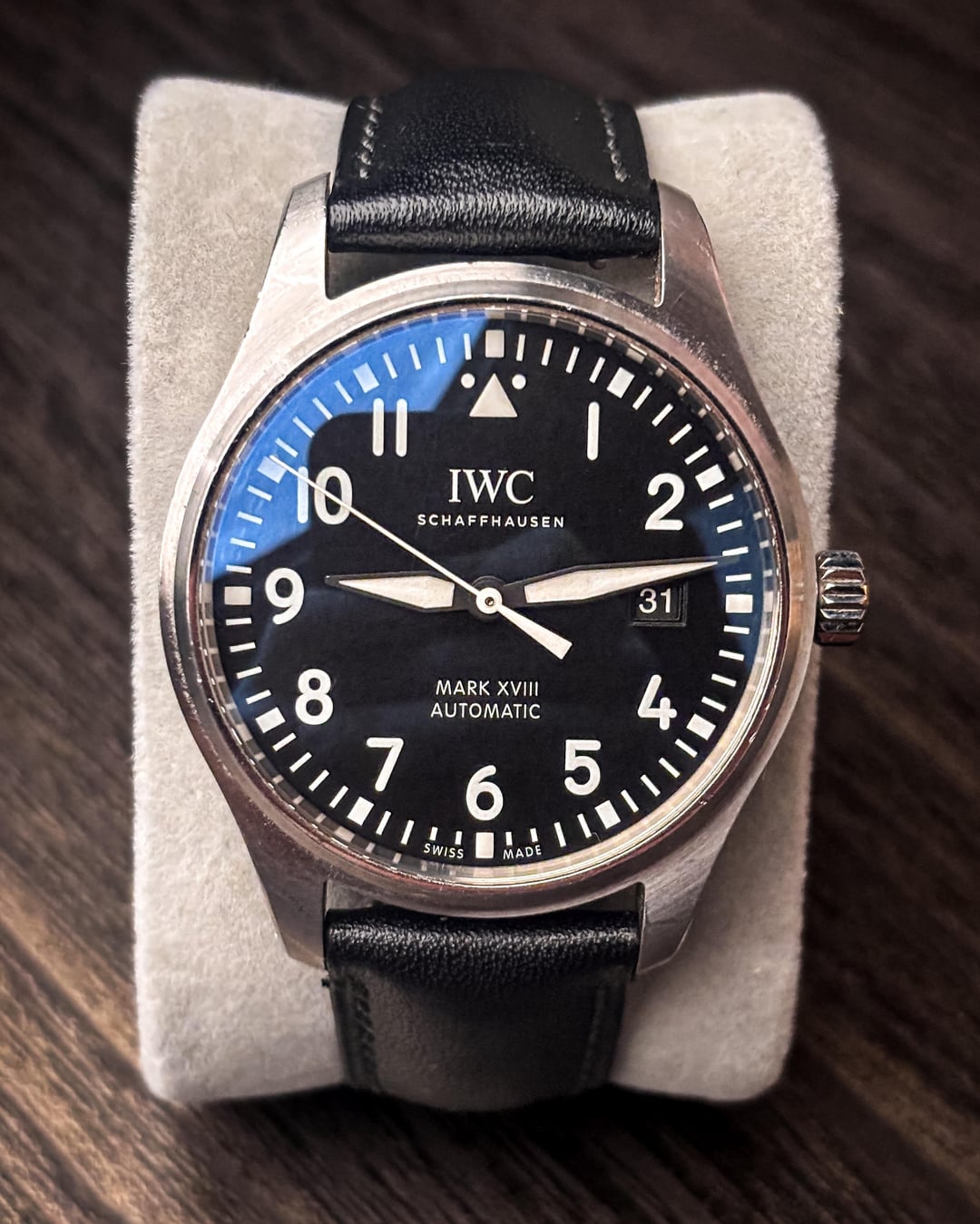 Condition — Decent overall. Stainless steel case shows minor surface scuffs and a small dent on the upper right lug (see photo), consistent with regular use. Sapphire crystal is clear with no scratches. Dial and hands are excellent — matte black dial is clean, lume is strong and evenly glowing across all plots and hands. Caseback shows typical wear. Watch is mounted on an aftermarket leather strap in excellent condition, paired with the original IWC signed buckle. Box & Accessories – Watch only. Includes OEM buckle. Price – $2,499 shipped (Zelle / Wire preferred). Apple Pay / Venmo +15. Sales tax required for GA buyers without resale certificate. Shipping – Fully insured FedEx 2-Day within 24 hours of cleared payment. Timestamp – Included in photos. Overview – IWC Mark XVIII Pilot’s Watch, Ref. 327009. Classic 40mm case, automatic movement, matte black dial with white Arabic numerals, and date at 3 o’clock. Based on the heritage of IWC’s military aviation designs, with modern build quality and anti-magnetic protection. Clean, versatile, and highly legible — one of the most wearable and iconic tool watches under $3K.