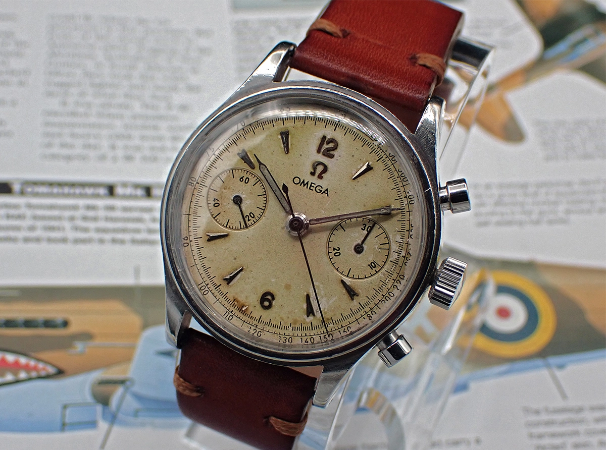 This example is from the 10.8 million batch (ca. 1944) but likely dates to 1950 or so, as denoted by not only the fourth series indicator in 2077-4 but also the style of the Arabic “12” & “6” and dagger markers dial. I believe that this is an older redial - perhaps 1960s-era based on the style of the OMEGA font? - and, as you can clearly see, it has more than a little aged vintage character to it, both of which are reflected in the asking price. Still, it’s quite charming on the wrist, with a super strong case, and if you happen to have an original dial that fits this case and caliber you’ll certainly be in clover. 😉