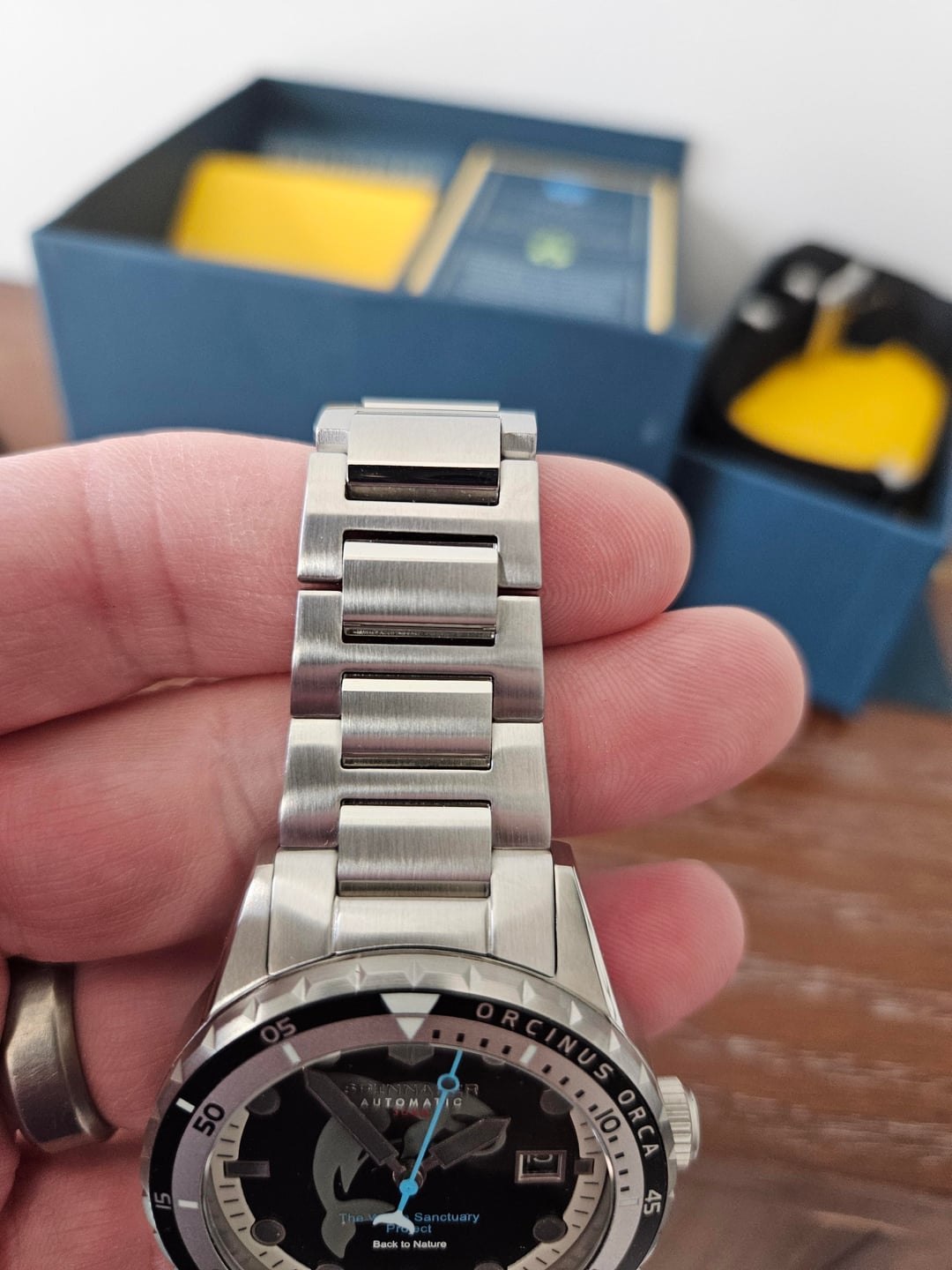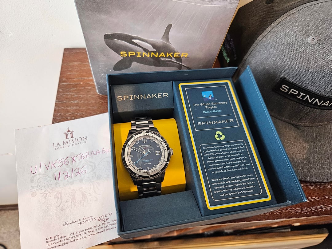 Hello watchex! Selling this Spinnaker HASS Automatic Whale Sanctuary Project Limited Edition Orca Black Purchased directly from Spinnaker. Bracelet is sized to my 18cm or 7-1/8" wrist, but is otherwise unworn. Includes hat, also unworn. Did not come with papers since they email receipt to you. Box is a little beat up from shipping from Spinnaker since they just put it in a polybag. Asking $350 shipped UPS 2nd day air, signature required. Payment method: PayPal F&F or G&S +3%