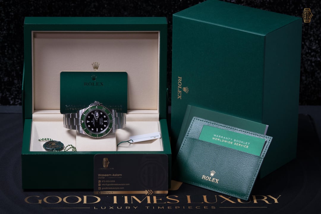 - Timestamp: https://imgur.com/a/CVxvKvk ******************************************************* * Reference: 126610LV * Condition: Excellent Pre-Owned Condition w/little to no signs of wear. * Box and Papers? Yes, Complete Set * Warranty Card Date: July 2025 (Under warranty until 2030) **Key Features:** * Reference: Rolex Submariner Date 126610LV, nicknamed the “Starbucks” * Case: 41 mm Oystersteel case with enhanced proportions for a more balanced, modern profile * Bezel: Unidirectional rotatable bezel with green Cerachrom insert, platinum-coated engraved numerals * Dial: Black lacquer dial with large Chromalight hour markers for exceptional legibility * Movement: Rolex Calibre 3235 automatic movement * Power Reserve: Approximately 70 hours * Escapement: Chronergy escapement for improved efficiency and precision * Accuracy: Superlative Chronometer certified (-2/+2 seconds per day) * Crystal: Scratch-resistant sapphire with Cyclops lens over the date * Bracelet: Oyster bracelet with solid links and Oysterlock safety clasp * Extension System: Glidelock clasp allowing tool-free micro-adjustments up to ~20 mm * Water Resistance: Waterproof to 300 meters / 1,000 feet * Heritage: Modern evolution of the iconic green-bezel Submariner first introduced in 2003 ******************************************************* 💳 Payment options: * All MajorCredit Cards * Bank Wire * Crypto (1% fee) For your convenience, you may divide payments into various forms of payment. ******************************************************* **💰Bank Wire: $14,795, CC: $15,387 includes fully insured UPS or FedEx Shipping** ******************************************************* 📍 Location: Chicago, IL 🚀 Shipping: Every package is insured for its full value and shipped via FedEx Overnight service to your nearest FedEx Office or Delivered straight to your door via UPS Next Day service. ********************************************************** 📩 Contact: * 📞 872-203-5209 Call/Text/Whatsapp ******************************************************* 📸 Insta: @goodtimesluxury ⭐️ Check Reviews on Google and Trust Pilot 🌐 Google us: Good Times Luxury Chicago 👨🏻💻 Website: goodtimesluxuryco dot com About me 🙋🏻♂️: My name is Waseem Aslam, Owner of Good Times Luxury. Please don’t hesitate to contact me with any questions. I’m happy to jump on a facetime call to show the watch and answer any questions you may have until you’re confident in your purchase. Talk soon, thanks! *******************************************************