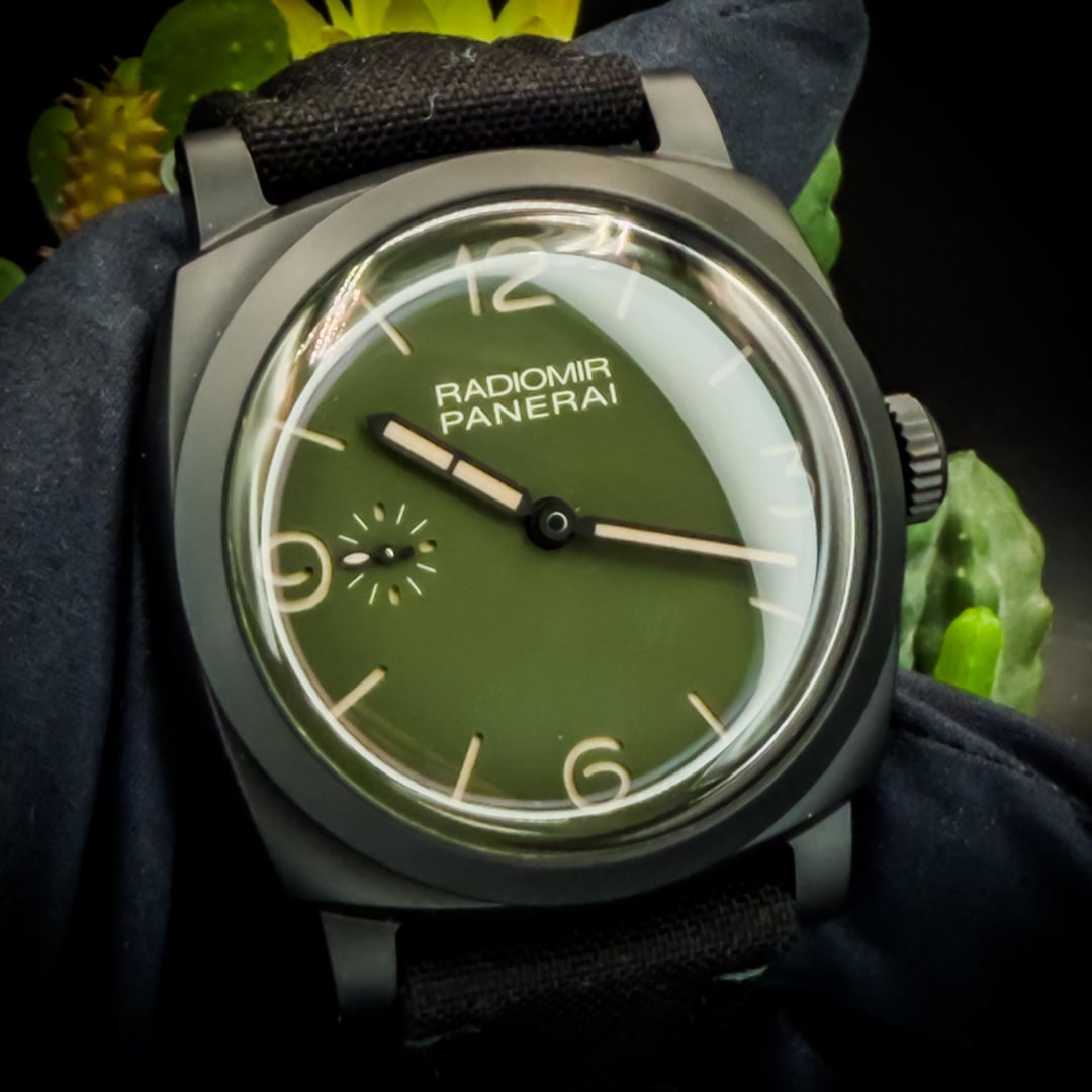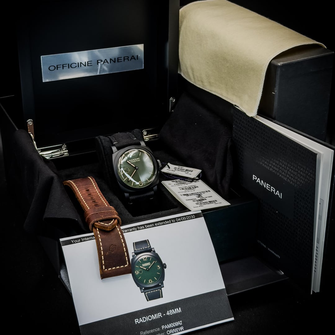 **Panerai Radiomir 1940 Ceramic Mint Limited Edition PAM00997 Limited 514/1000 PamGuard Through 2030** 48mm Matte Black Ceramic Case | Panerai Caliber P.3000 Manual Wind | 3‑Day Power Reserve | Military Green Dial | Sapphire Crystal | 100m Water Resistance | Black Canvas Strap w/ Green Stitching + Brown Leather Strap **Pricing** **Asking: $5595 + L** **Trades Always Considered** **Description** The PAM00997 is a limited edition Panerai Radiomir built for presence—sized at 48mm in matte black ceramic with a military green sandwich dial and classic wire lugs. One of just 1,000 made, it’s powered by the in-house manually wound P.3000 caliber with a 3-day reserve. This example is in mint condition and comes with a full boutique set, including both the factory black canvas strap with green stitching and an additional OEM brown leather strap. Registered under PamGuard through 2030. **Condition** Mint Pre‑Owned – No visible wear. Case, dial, and crystal are flawless. Winding and running within spec. **Complete Set Includes** * Inner and Outer Panerai Boxes * Instruction & Warranty Booklet * Factory Microfiber Cloths * Original Stickers * Black Canvas Strap with Green Stitching * OEM Brown Leather Strap * PamGuard Warranty Registered Through 2030 **Shipping** Ships from Scottsdale, AZ – Priority Overnight via FedEx **Hundreds of Deals, References, Reviews, etc. Buy with confidence.**