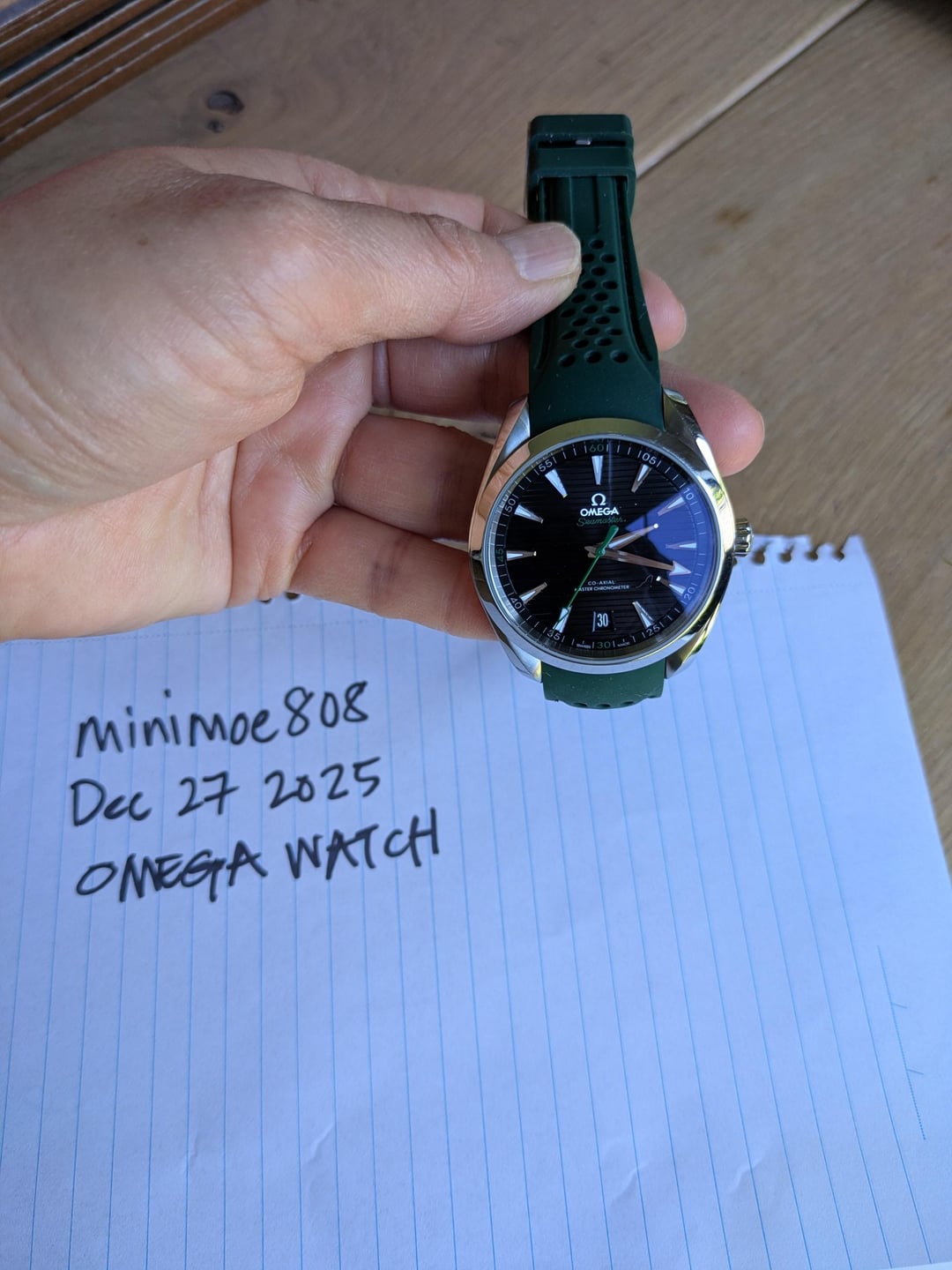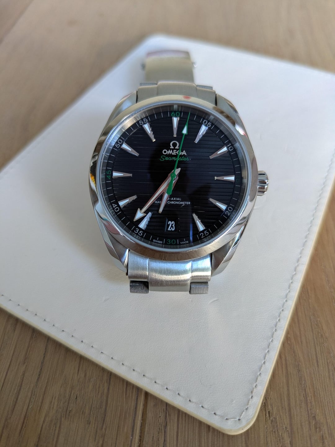 **SIZE:** 41mm **BACKGROUND:** Bought in 2020 from WatchMaxx and have worn it less than 20 times. **REASON FOR SELLING:** It's too big for my 6in wrist and I bought it online without trying it on first. I'm not a watch seller and this is my only watch for sale. Trying to buy a smaller Oris watch. **NOTES ON WATCH:** 1. Original strap is in second image (blue and green NATO strap) Golf edition. I purchased the steel strap separately but watch is still to heavy/big on my wrist and it tends to twist to one side. 2. Also included is the racing green curved strap. This sale comes with everything you see on the listing. 3. Warranty card, warranty card case and all watch straps. I lost the box during a move but I will ship in a secure and padded watch case. 4. Timestamp in the last image. Dated Dec 27 and crossposted from here: [https://www.reddit.com/r/Watchexchange/comments/1pwlteo/wts\_omega\_seamaster\_aqua\_terra\_150m\_master/](https://www.reddit.com/r/Watchexchange/comments/1pwlteo/wts_omega_seamaster_aqua_terra_150m_master/) **LOCATION**: Australia. I'm happy do Zoom calls or whatsapp video calls to show you the watch. **SHIPPING:** Private carrier with tracking. UPS or FedEX worldwide. **ASKING:** USD $4,500 shipped OBO.