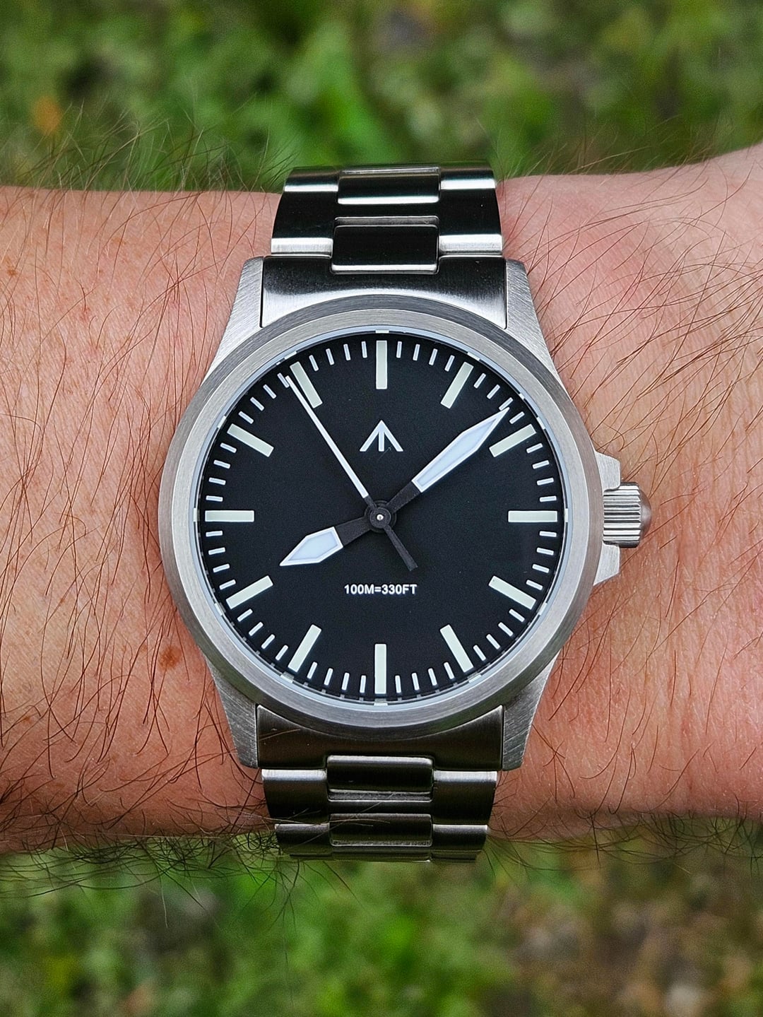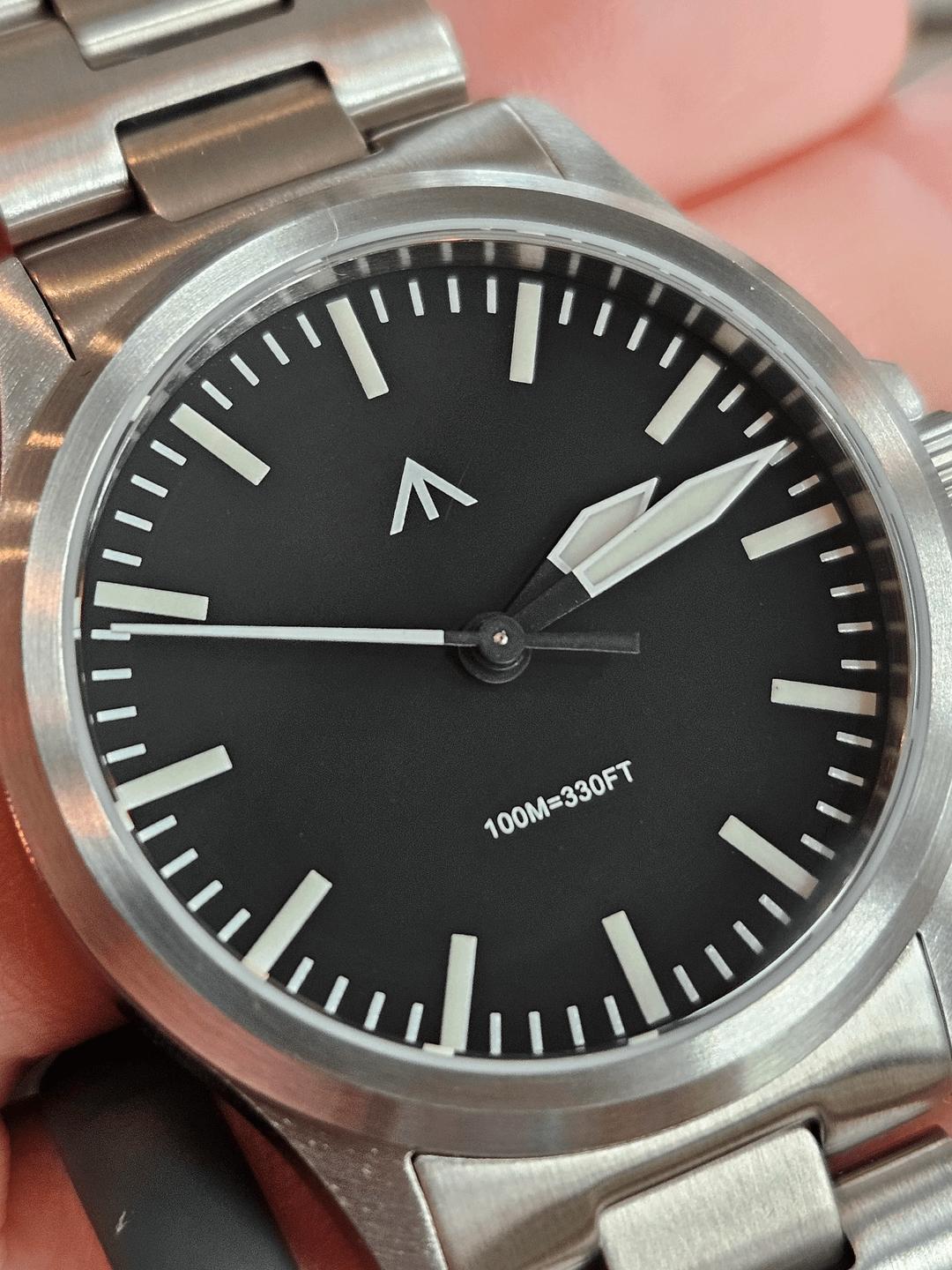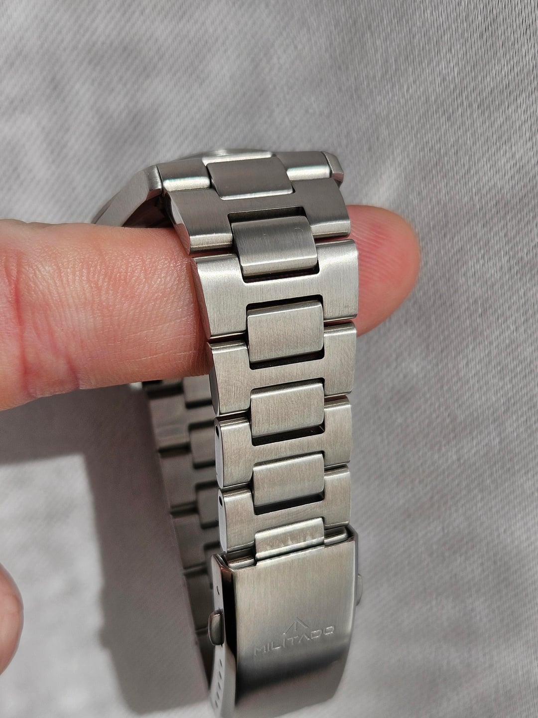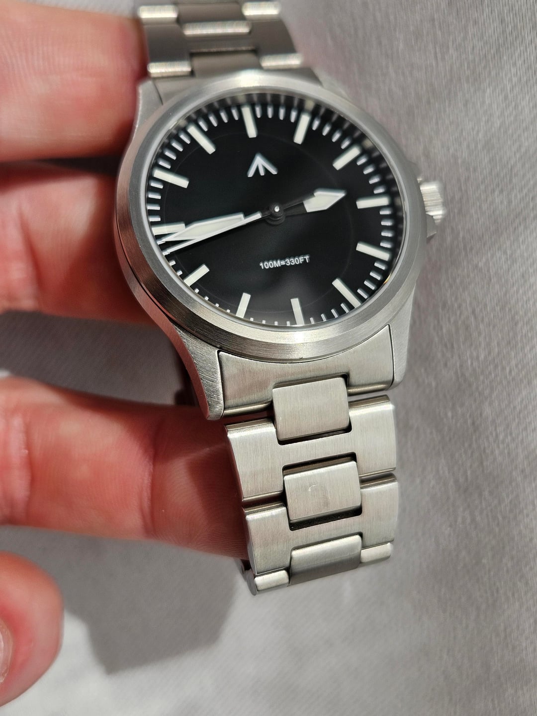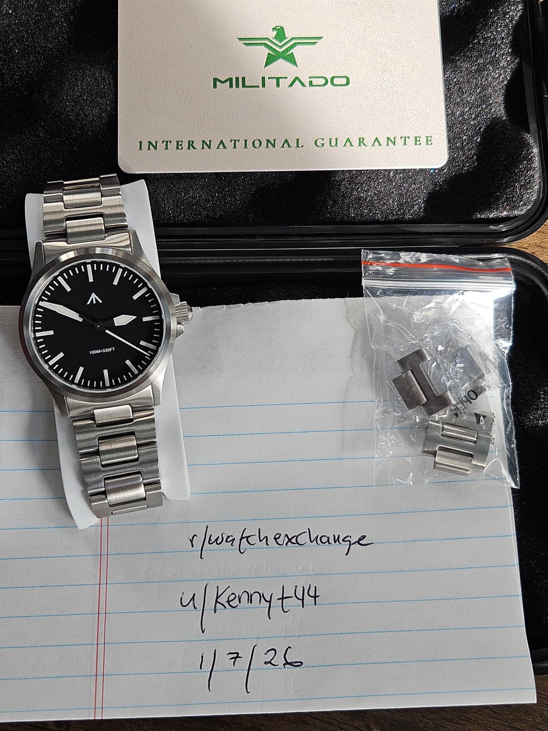 For sale is a new release from Militado (r/chinesewatches special) of a Sinn homage, the ML18. Features the Seiko VH31 sweeping 'mecha' quartz movement, allowing for a thin case and budget price. Main details for price point: sapphire with AR coating, solid end-links with solid screw link bracelet, comfortable and has a 5 micro-adjustment milled clasp. Purchased a month ago and worn a few times. A few desk diving scratches as pictured, but overall like-new. Full kit including case and spare links. **Price** $80 shipped in the USA (with tracking). Payment via PayPal (friends & family). Please send me a PM with any questions or further verification. Watch details as copied from Militado: Model: MILITADO ML18 pilot-style watch Movement: VH31 high-beat sweep-second quartz movement (4 ticks per second, smooth mechanical-like motion) Case Material: Imported 316L stainless steel with brushed finish Dimensions: Bezel Diameter: 36 mmCase Thickness: 9.85 mm Lug-to-Lug: 42.5 mm Bezel Type: Fixed Lume: Swiss Super-LumiNova BGW9 — bright blue glow Water Resistance: 100 m / 10 ATM Bracelet: Solid stainless-steel bracelet with screw links, tapering from 20 mm to 16 mm Clasp: 5-hole micro-adjust folding clasp Crystal: Sapphire crystal with inner anti-reflective coating