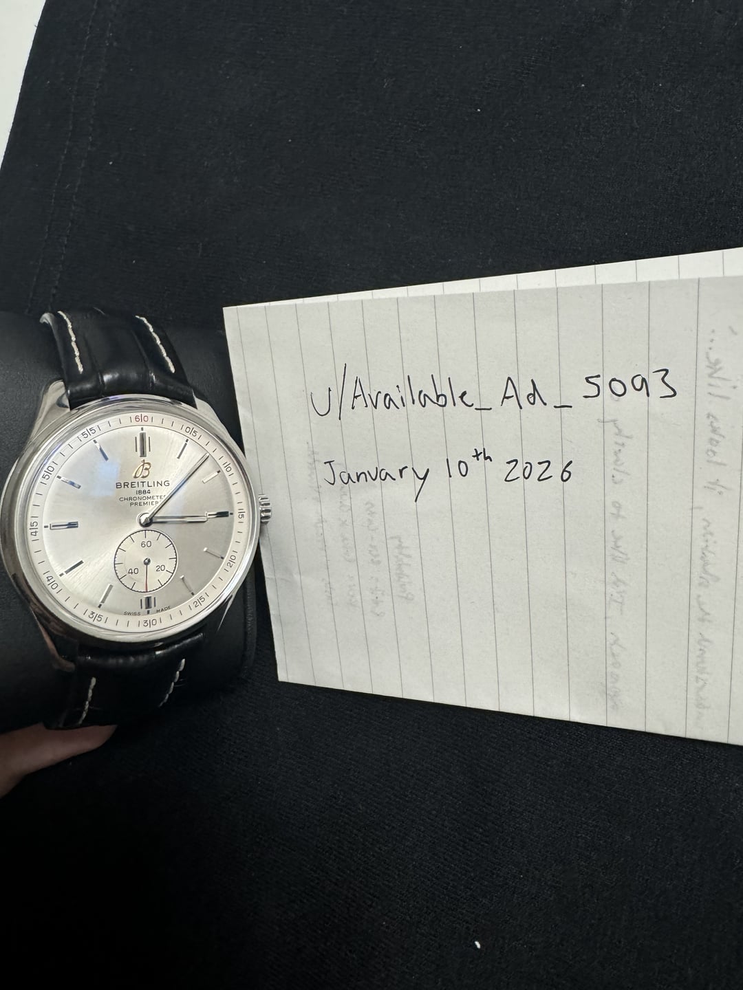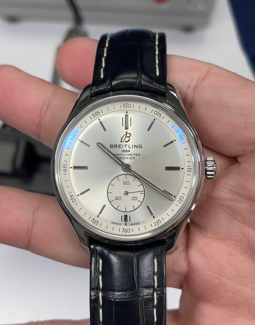 Breitling Premier Automatic 40 - Box & Papers - $3000 Up for sale is my Breitling Premier Automatic 40 (Ref. A37340351G1X2) in great condition. I’m downsizing my collection and this watch doesn’t get wrist time, so it’s been sitting in my watch box. It deserves to be enjoyed by someone who will wear it. Here's some more info on the watch: This is a classic, versatile 40mm dress watch with a silver dial and small seconds at 6 o’clock. It’s powered by Breitling’s COSC-certified automatic movement and wears very comfortably on the anthracite nubuck leather strap. The watch comes as a full set with the original box and papers, including the warranty card (Expired). It’s in great overall condition with only some wear on the strap itself and a small mark on the crystal. It functions perfectly. Happy to FaceTime or hop on a call so you can see the watch live and ask any questions. Asking $3,000 (price includes shipping; payment via Zelle or wire). I’ll be posting other watches soon as I continue clearing out my watch box - feel free to check out my other listings.