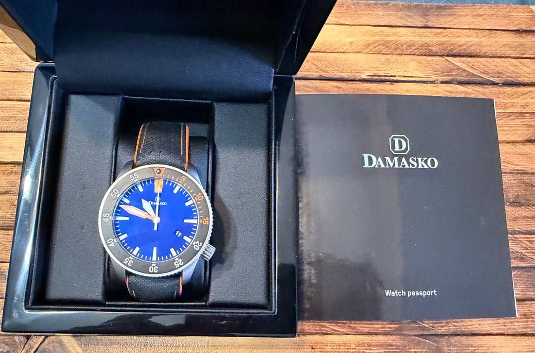 For sale is my Damasko DSub2 full set. Seems like an odd bird in the Damasko family being so colorful. The extreme contrasting colors are really legible and even noticeable from a distance. ‘The rugged case materials and finish don’t show any signs of wear. Crystal is clean as well. The only sign of use is a ding on the PVD clasp. See pics. Downsizing right now like so many others. Asking $1,200 shipped (Paypal). Only looking to sell to CONUS. Reach out with questions. Specs * Dial: Blue * lMovement: ETA 2824-2 Elaboré * Winding: Automatic * Complications: Date * Lens: Front + Back AR-Coated Sapphire. * Water Res: 300m * Diameter: 43mm * Length: 51mm * Thickness: 12.9mm * Lug Width: 22mm Thanks for looking!%