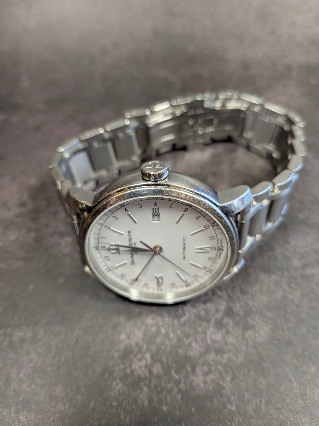 Asking $950. The Baume & Mercier 42mm Classima 8734 Automatic GMT Watch is a classic timepiece designed for men with a wrist size of 8.5 inches. It features a stainless steel case with a silver bezel, white dial, and baton indexes. This mechanical automatic watch has a 12-hour dial and 30-meter water resistance. The watch is in excellent condition; the blemishes you see in the photos are fingerprints, not scratches. Happy to take more photos in exchange for a serious offer. Shipping not included, only CONUS