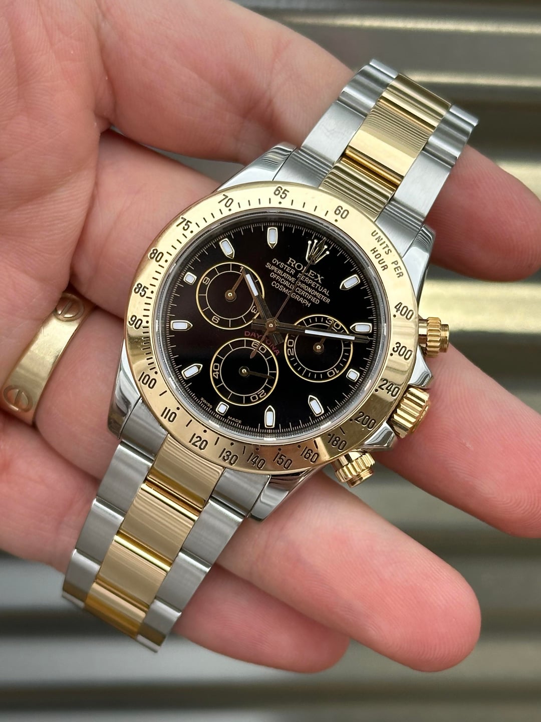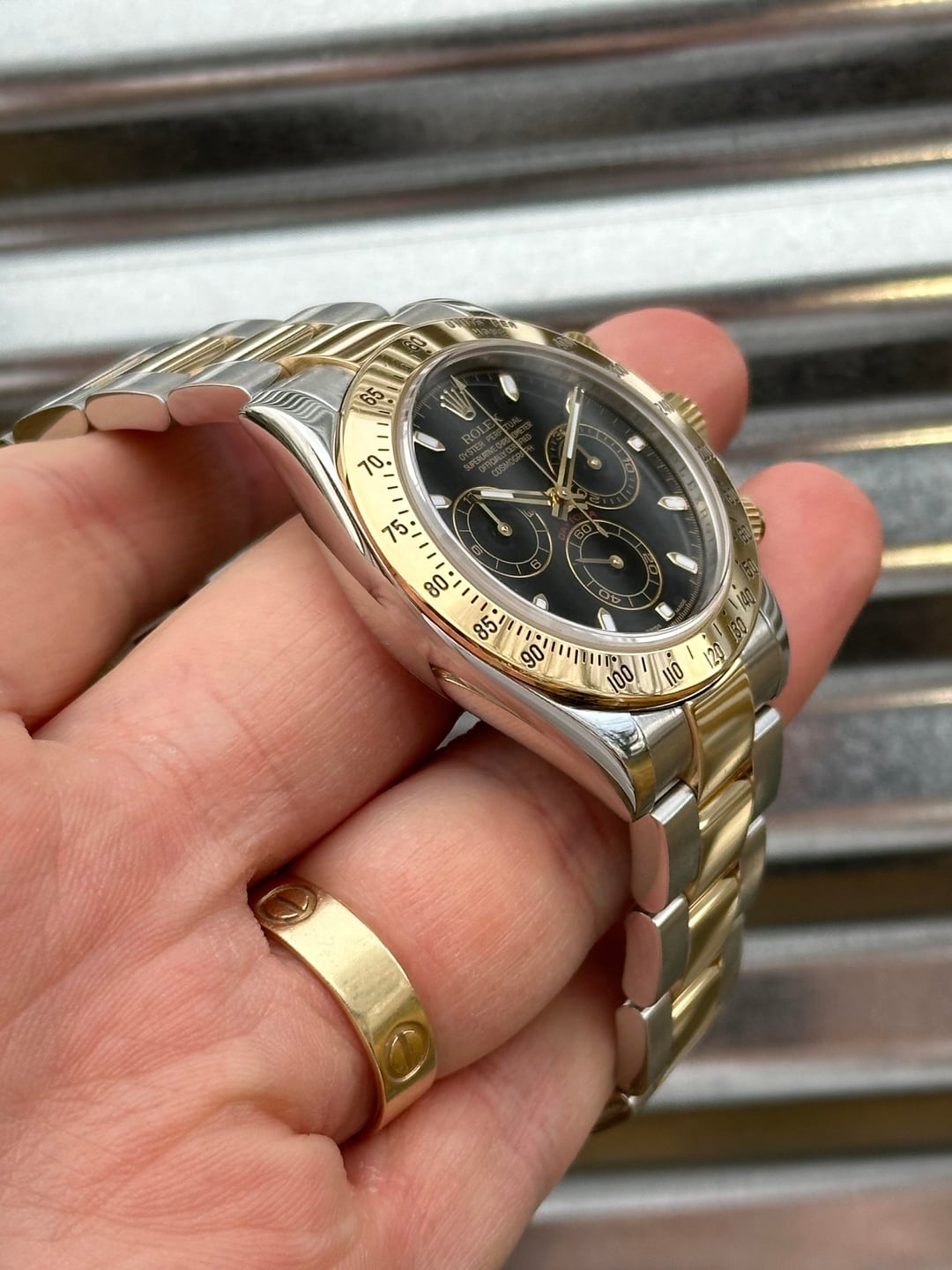 | 2007 MINT Rolex Daytona 116523 Chronograph Black Dial Steel Yellow Gold Two Tone huntingtonwatch (11920) |