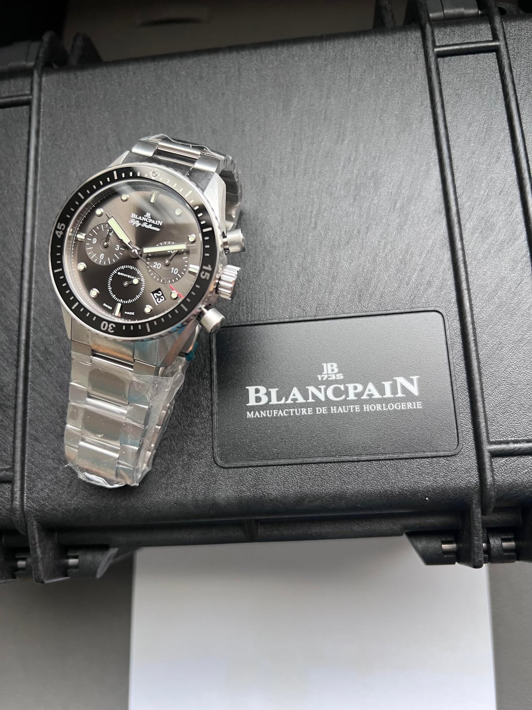 Hey Watchexchange! I’ve got a special one for you. High horology, dive flyback chronograph, tool watch vibes, and a 5 Hz / 36,000 vph El Primero style in-house Blancpain Caliber F385 movement all in one? Yes it has it all and a stunning sunburst anthracite dial too. I’m not done though. 120 hour power reserve really pushes it over the top. Look at that movement. Pull out your loupe boys and be weed. **Condition:** Unworn and still mummy wrapped. **Scope of delivery:** Full set with 12/2025 warranty card. **Specs:** Reference number: 5200-1110-71S Case size: 43mm Lug-to-lug: 49mm, 52mm with end links Case thickness: 14.8mm Water resistance: 300m **Price:** $15,750 shipped FedEx Priority Overnight to your local FedEx Office hold location. Will ship after wire fully clears. Way under retail. Your wife won’t be mad. She’ll think you’re being prudent. **Methods of payment:** Bank wire only. **Trades:** Not at this time. **References:** Hundreds of successful transactions in watch trading. See my eBay account under the same name. Many references in Facebook groups, watch forums, and on WUS.